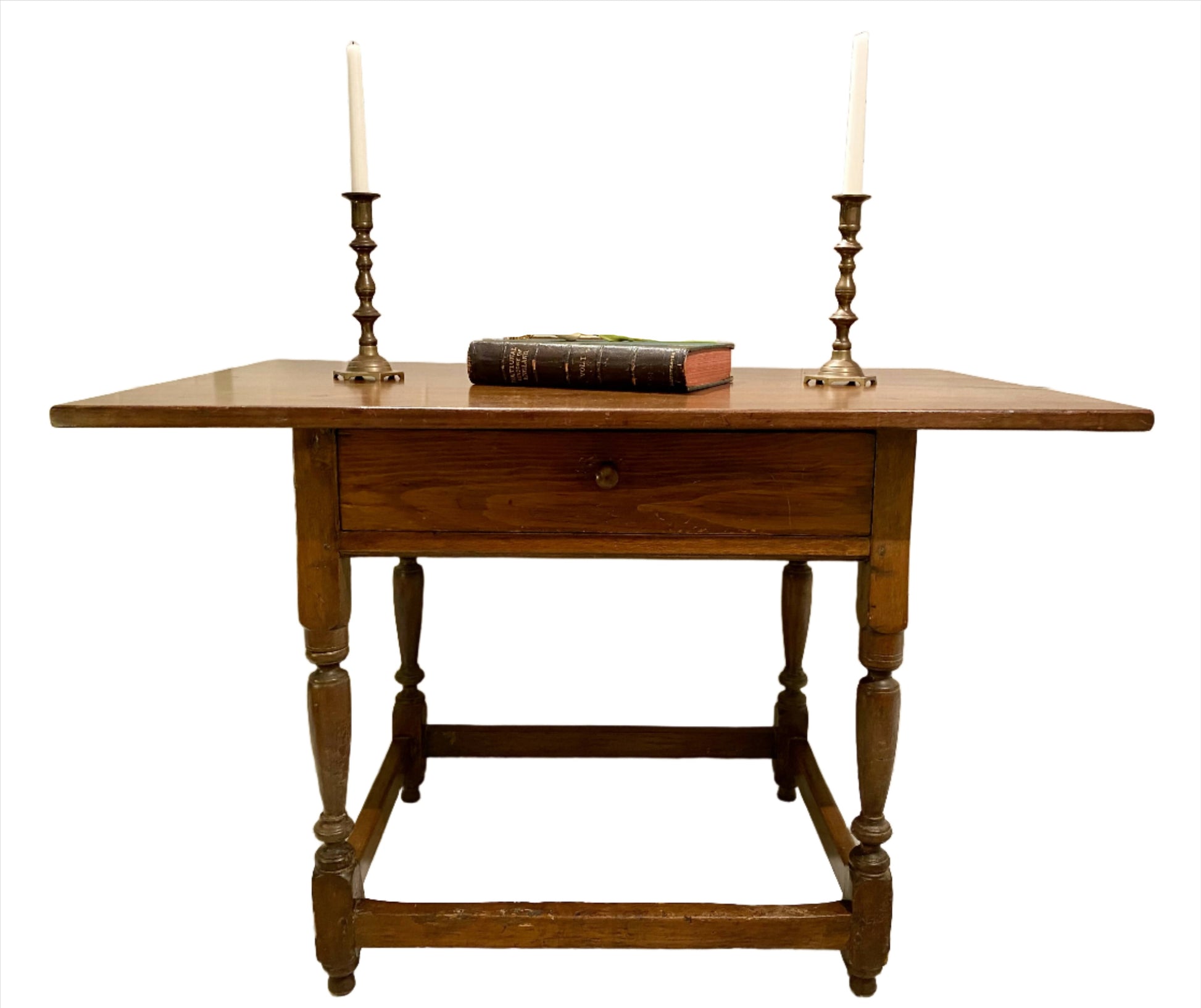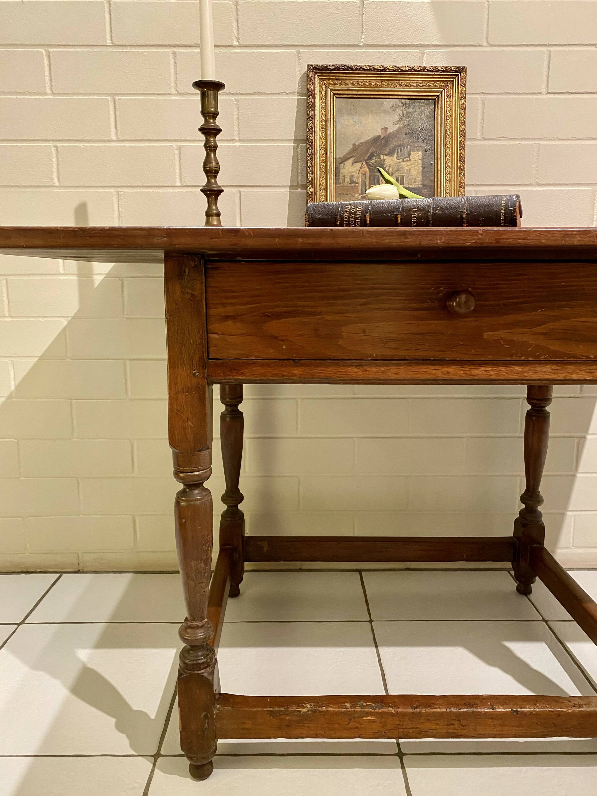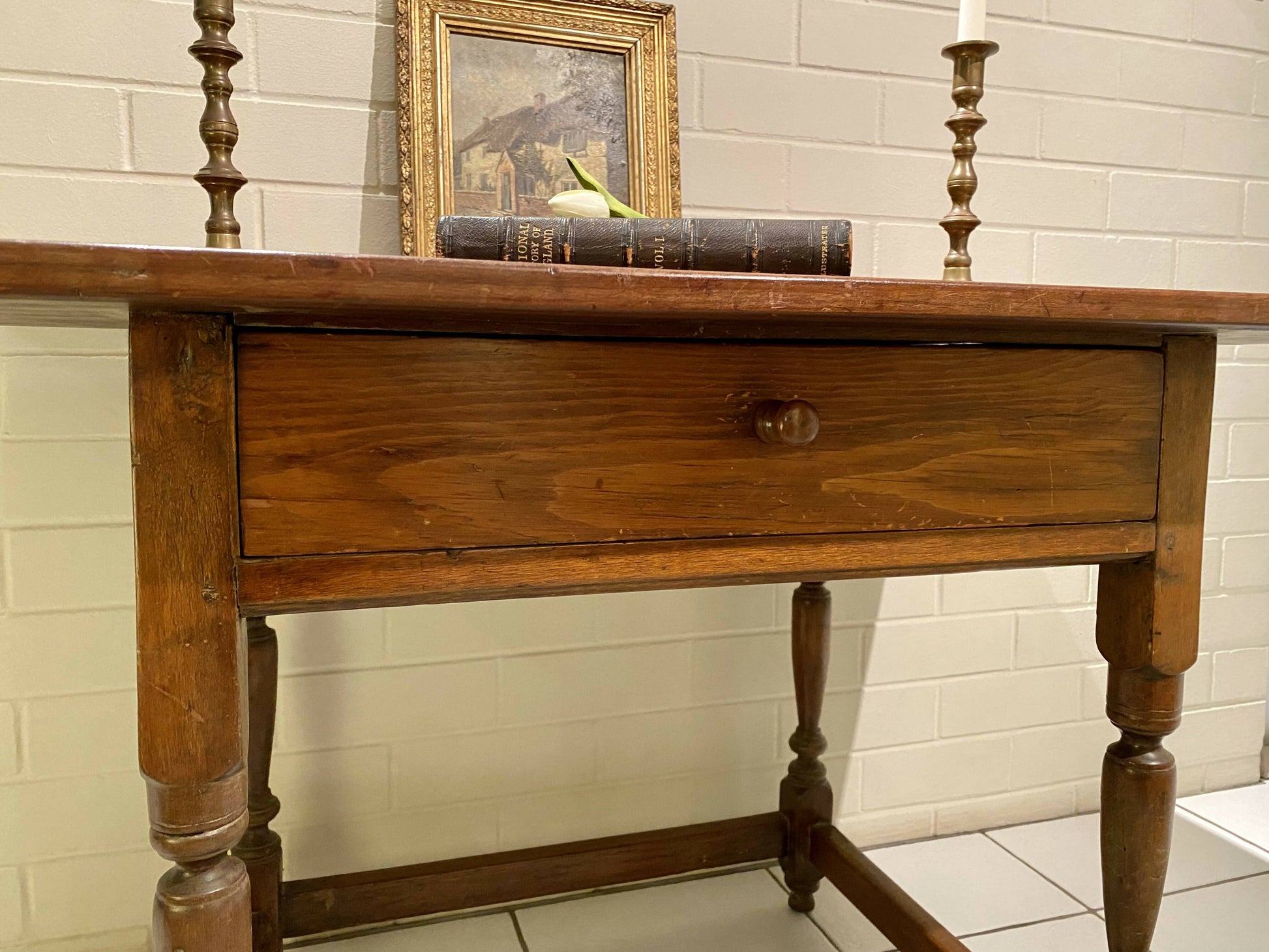 An early 19th century fruitwood farmhouse table, with a rectangular top above a single frieze drawer, on turned legs joined by stretchers. This table is bursting with rustic character, just waiting to add a farmhouse charm to your house. It has marks and scratches on most surfaces consistent with its age, but is very solid and structurally sound.