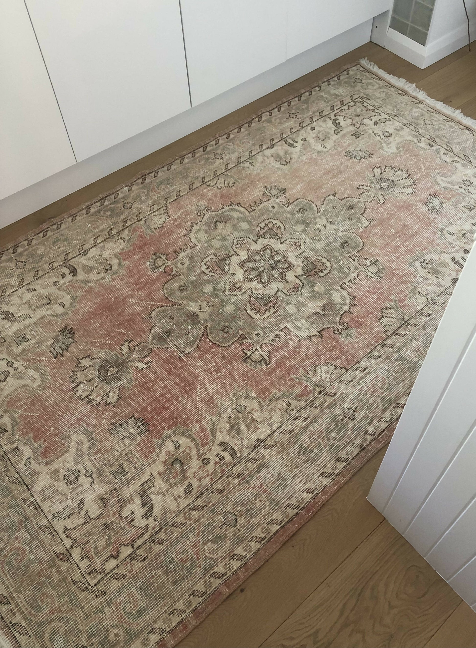 Anatolian Vinatge Turkish Rug, faded sage green with muted red colourway that looks pink. In amazing condition perfectly faded throughout. This rug is one of a kind purchased directly from Turkey.