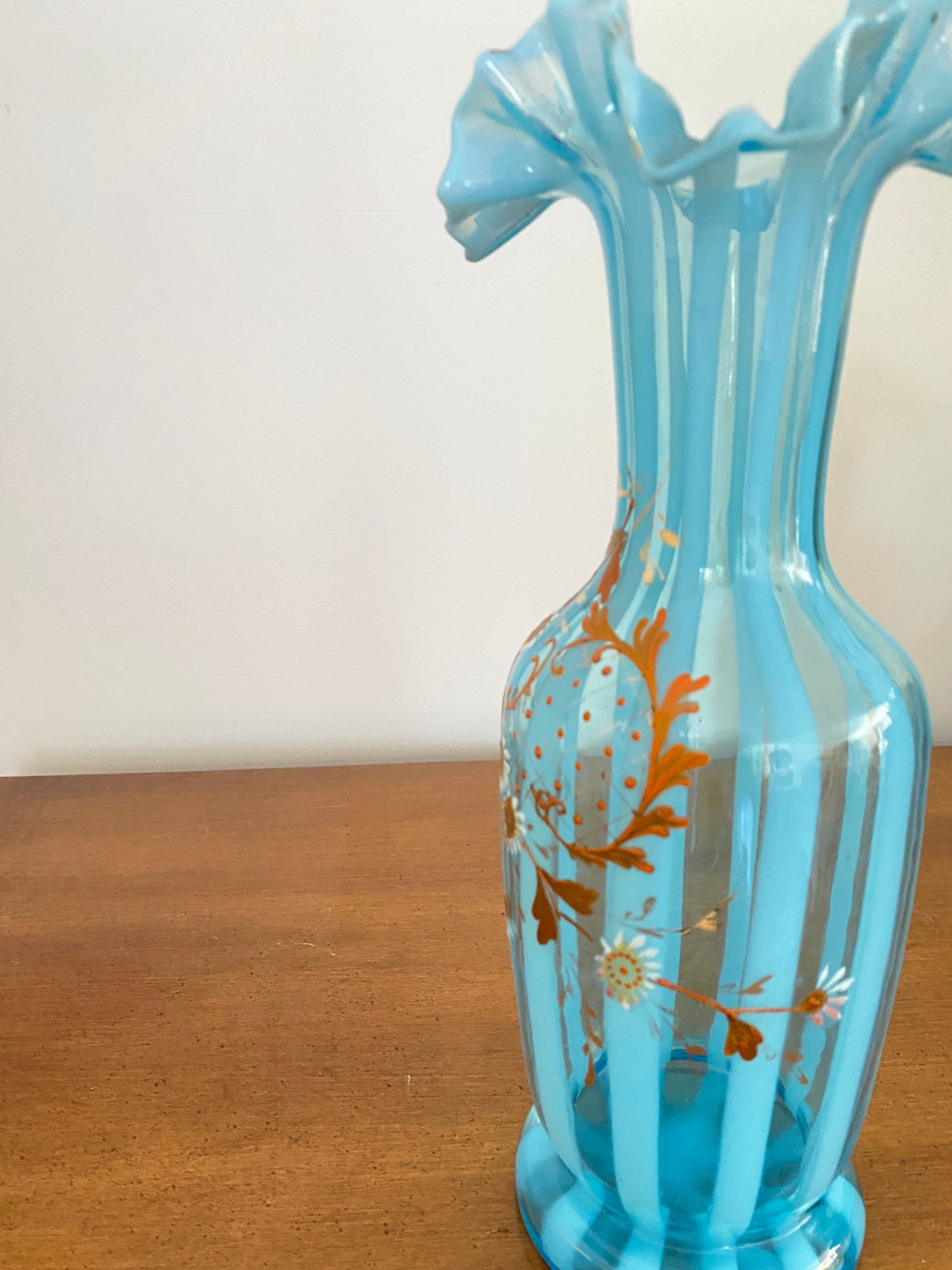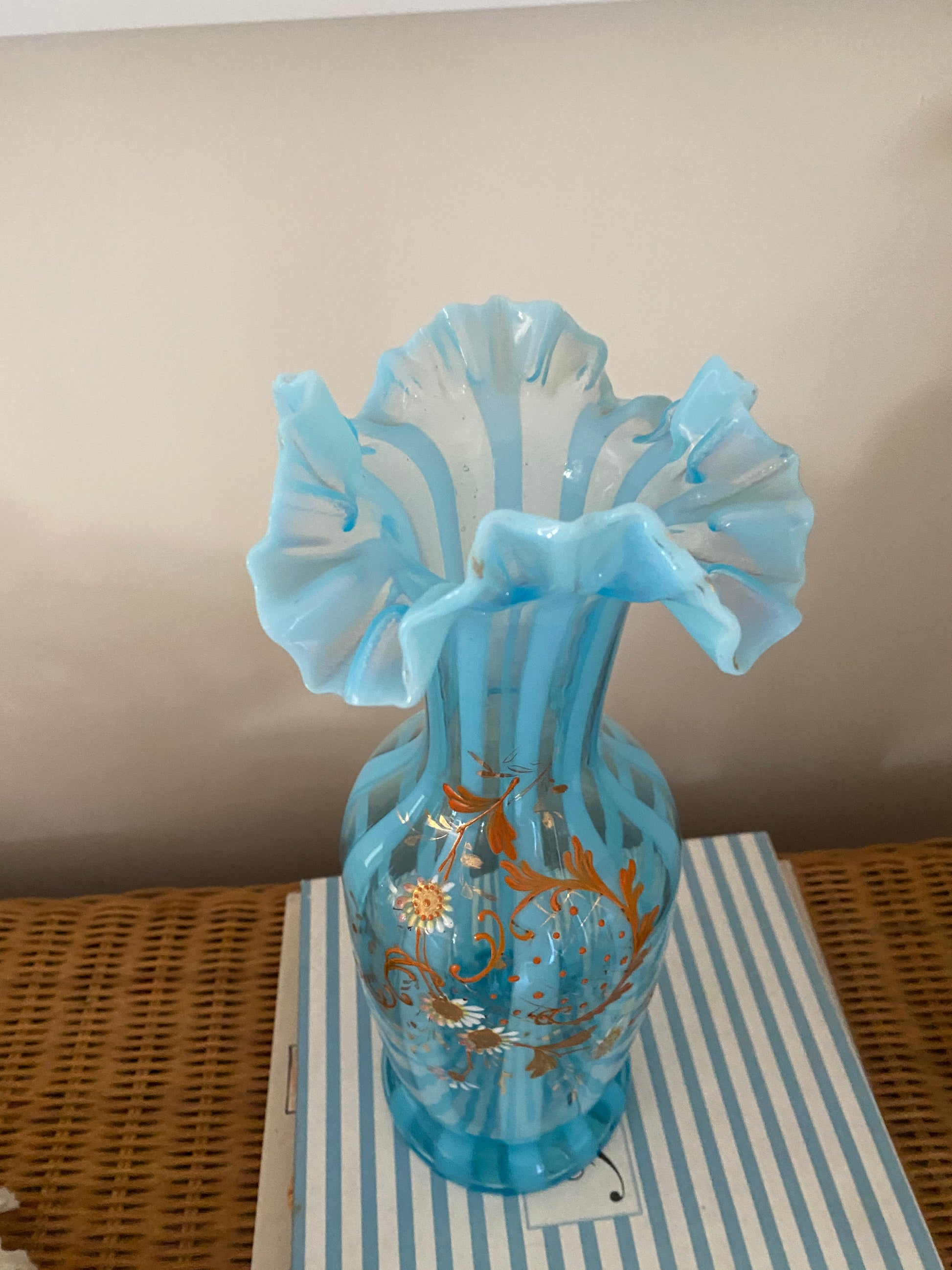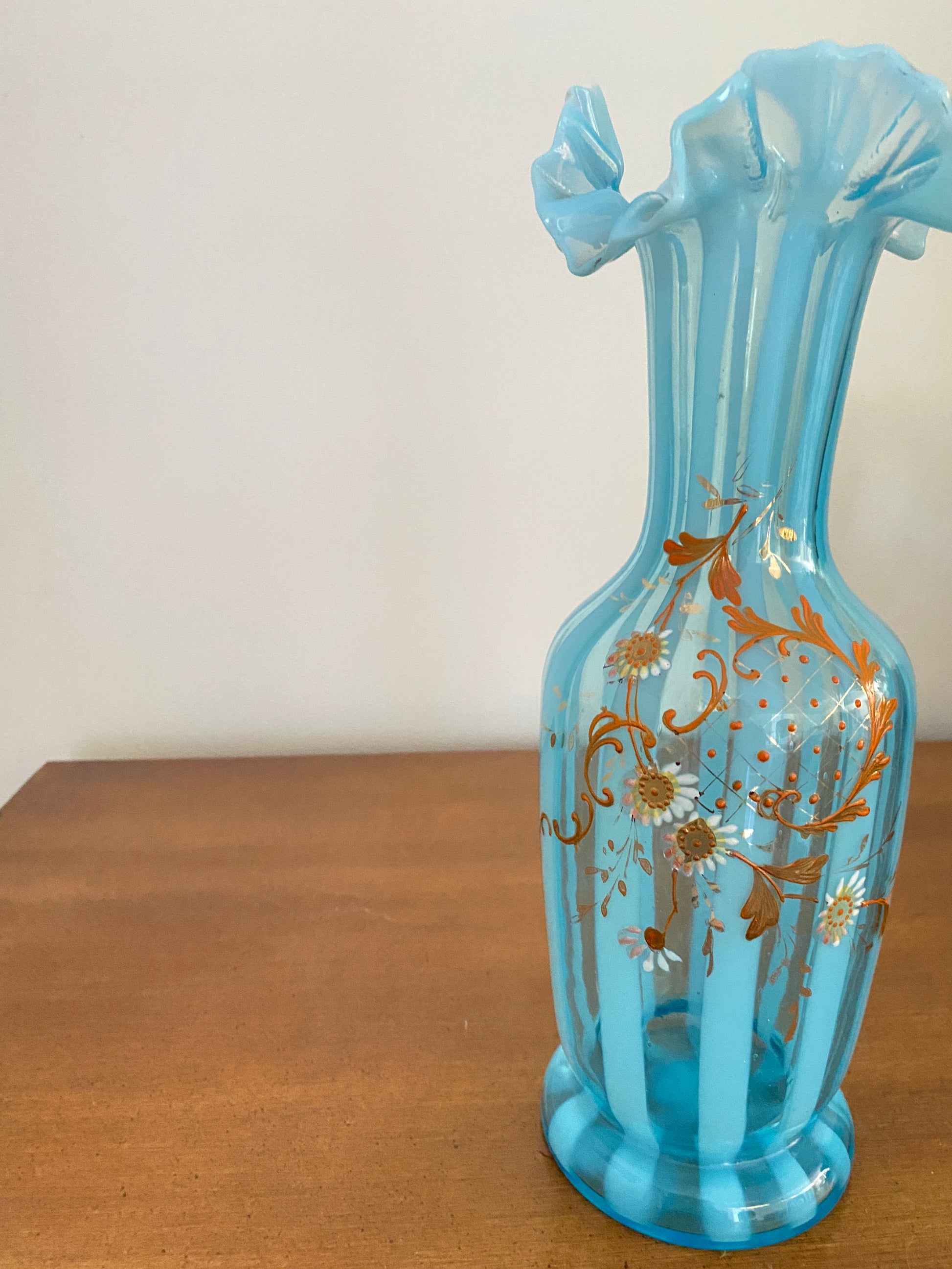 Beautiful hand blown blue glass vase with ruffle edges. Features hand painted daisies.