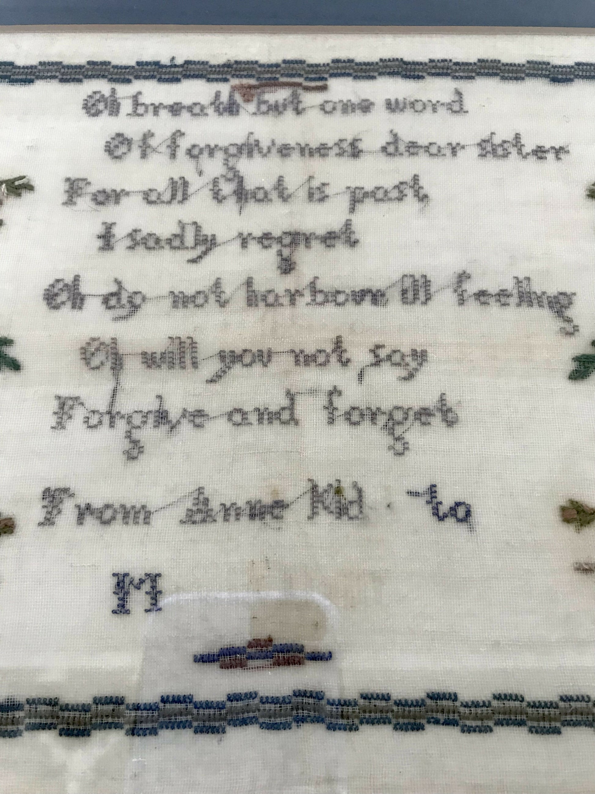 This lovely old sampler tells the story of Anne Kid, pleading forgiveness from her sister for something that has occurred between them. It is SO sweet! Mostly worked in teeny weeny cross-stitch with little stem stitch sprays of flowers in the four corners. It is undated, but was already very old when I bought it at Greenwich Market, South London in 1989.