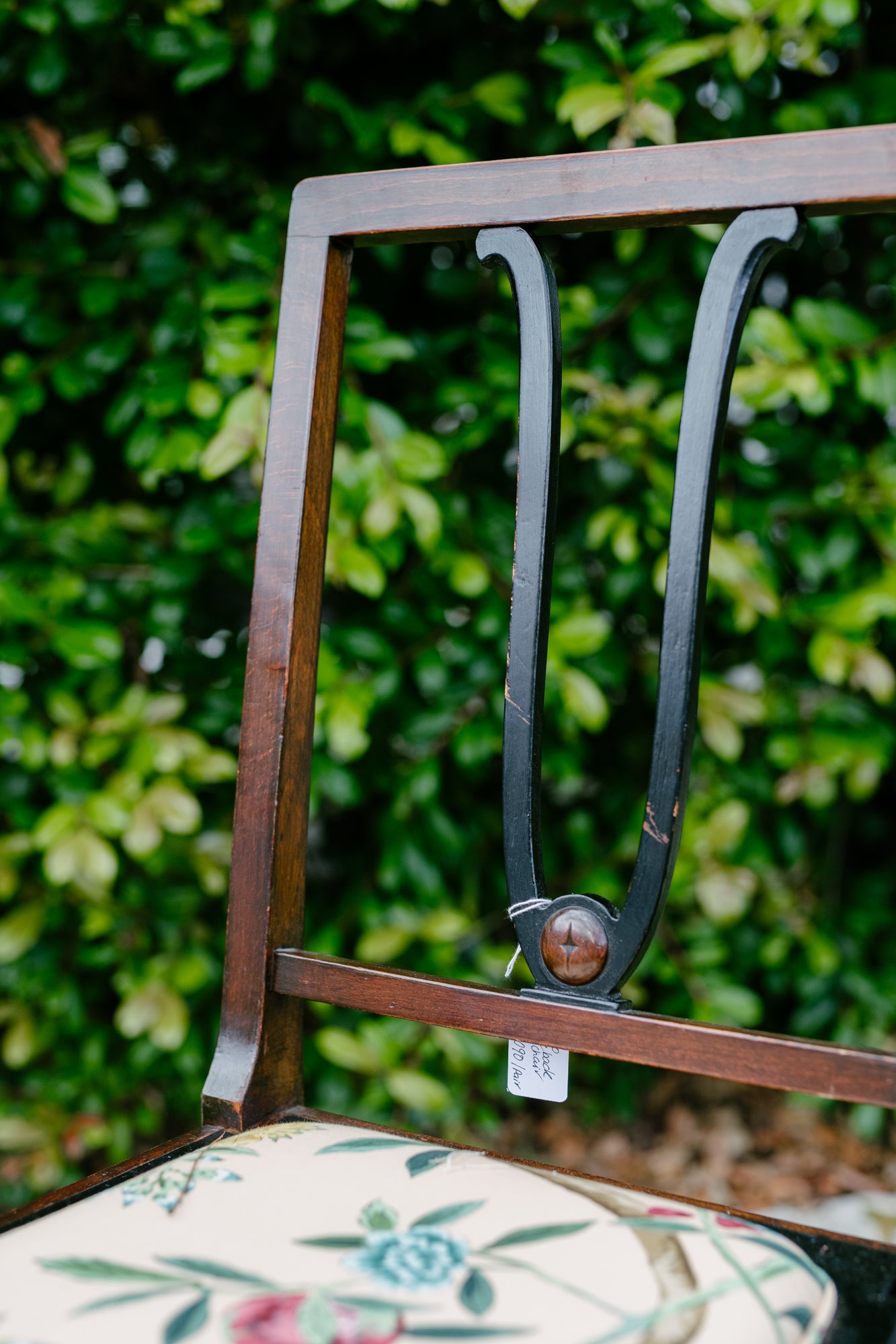 Timber frame with lyre backs and floral upholstered seats. Sold as a pair. Two pairs available.