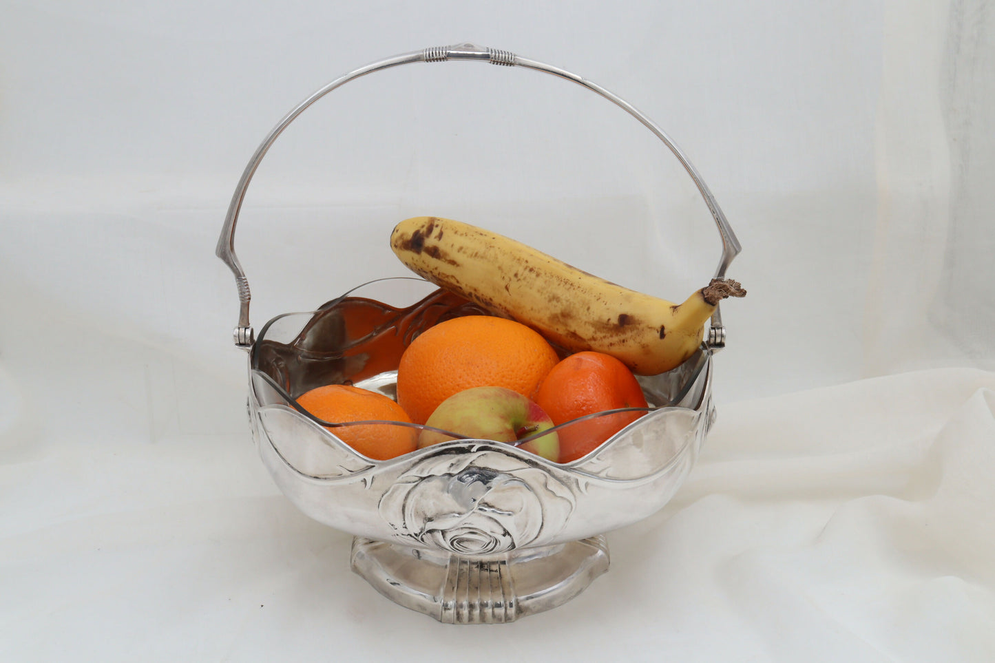 This very attractive silver plated footed fruit bowl with swing handle, was made by Orvit of Germany and is in the classic Art Nouveau style featuring embossed roses and entwined stems. The stand is in excellent condition (it has been replated) and has its original glass liner which is also in excellent condition. It would display wonderfully on a sideboard or in the middle of a table. It stands 270 mm (10.5 inches) high to the top of the handle, and is 250 mm (10 inches) in diameter. C 1905.