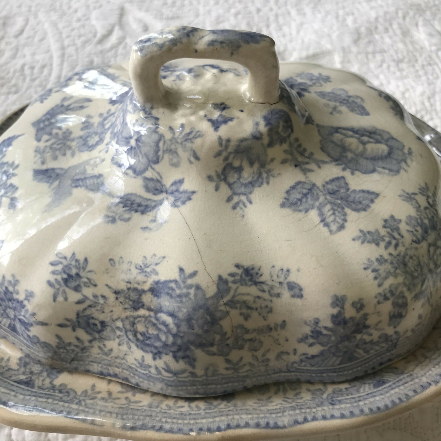 Pretty transferware covered dish measuring 25.5cm x 20.5cm x 12cm to the top of the lid handle. Quite unusual to find one with an intact lid! The lid does have one hairline crack but is otherwise very good. Some staining to the dish and rim of the lid.