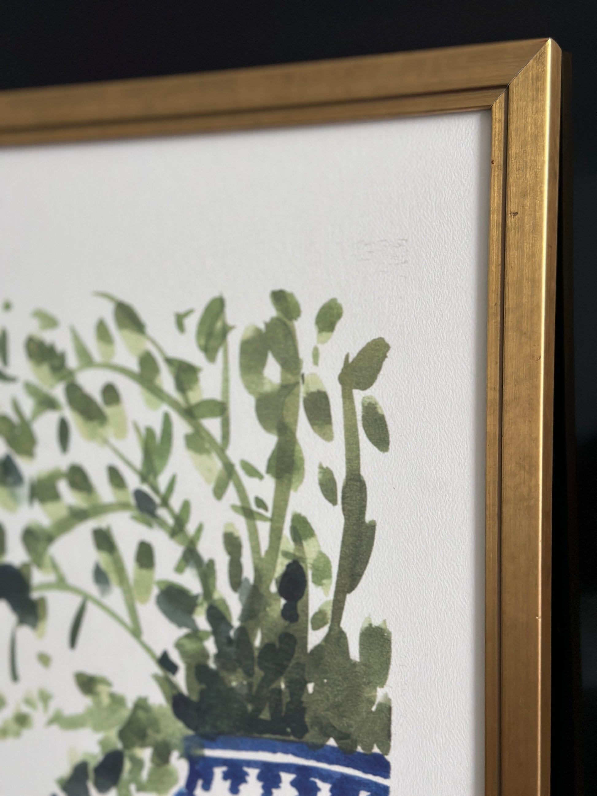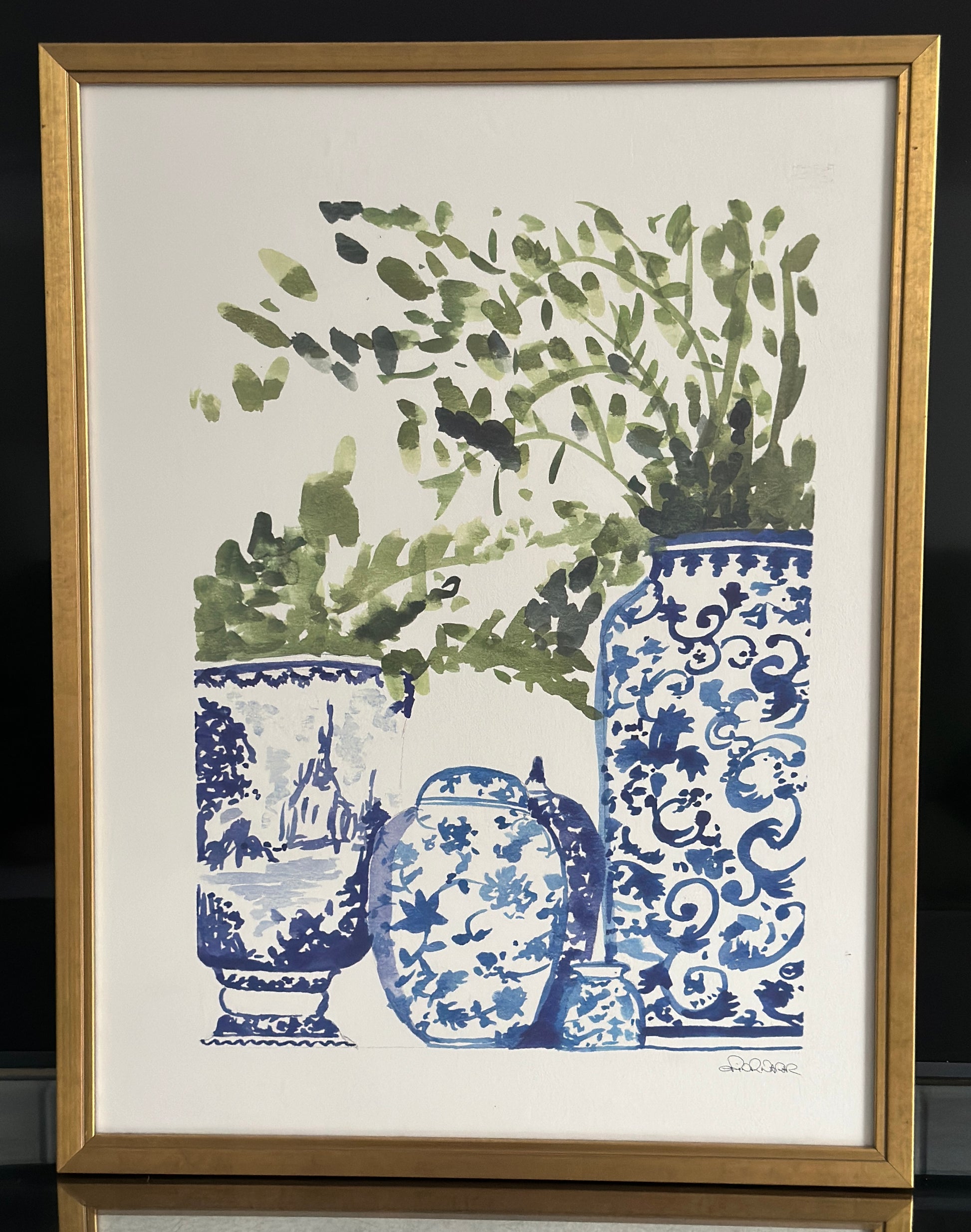Print with blue and white ceramics and greenery. Work on paper with a slim brass frame and glass
