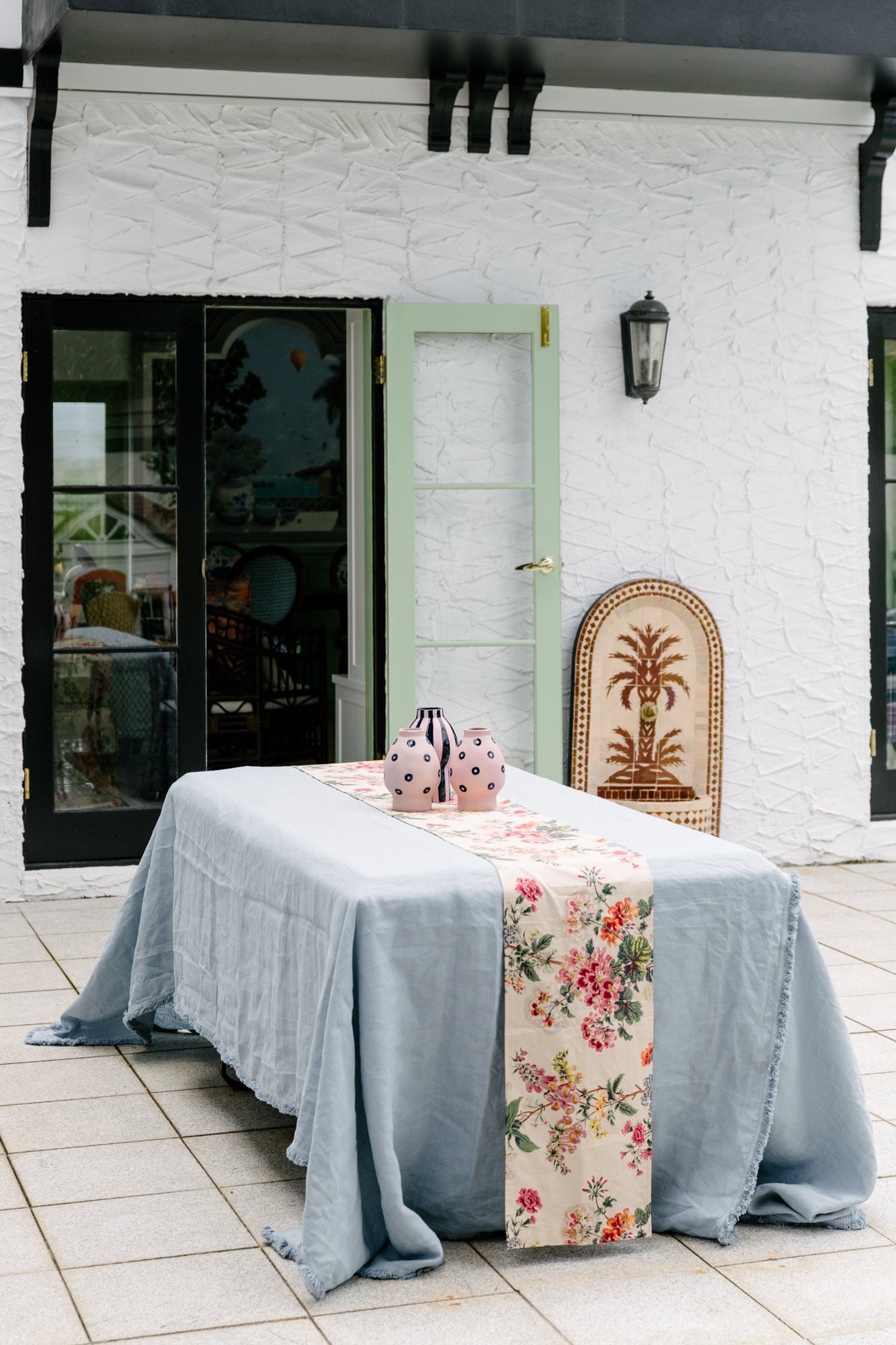 A beautiful blue 100% linen table cloth with sweet edge fringing. This is the perfect neutral blue cloth that works all on its own or to create a layered and eclectic table use is with out mixed napkin sets for a unique look.