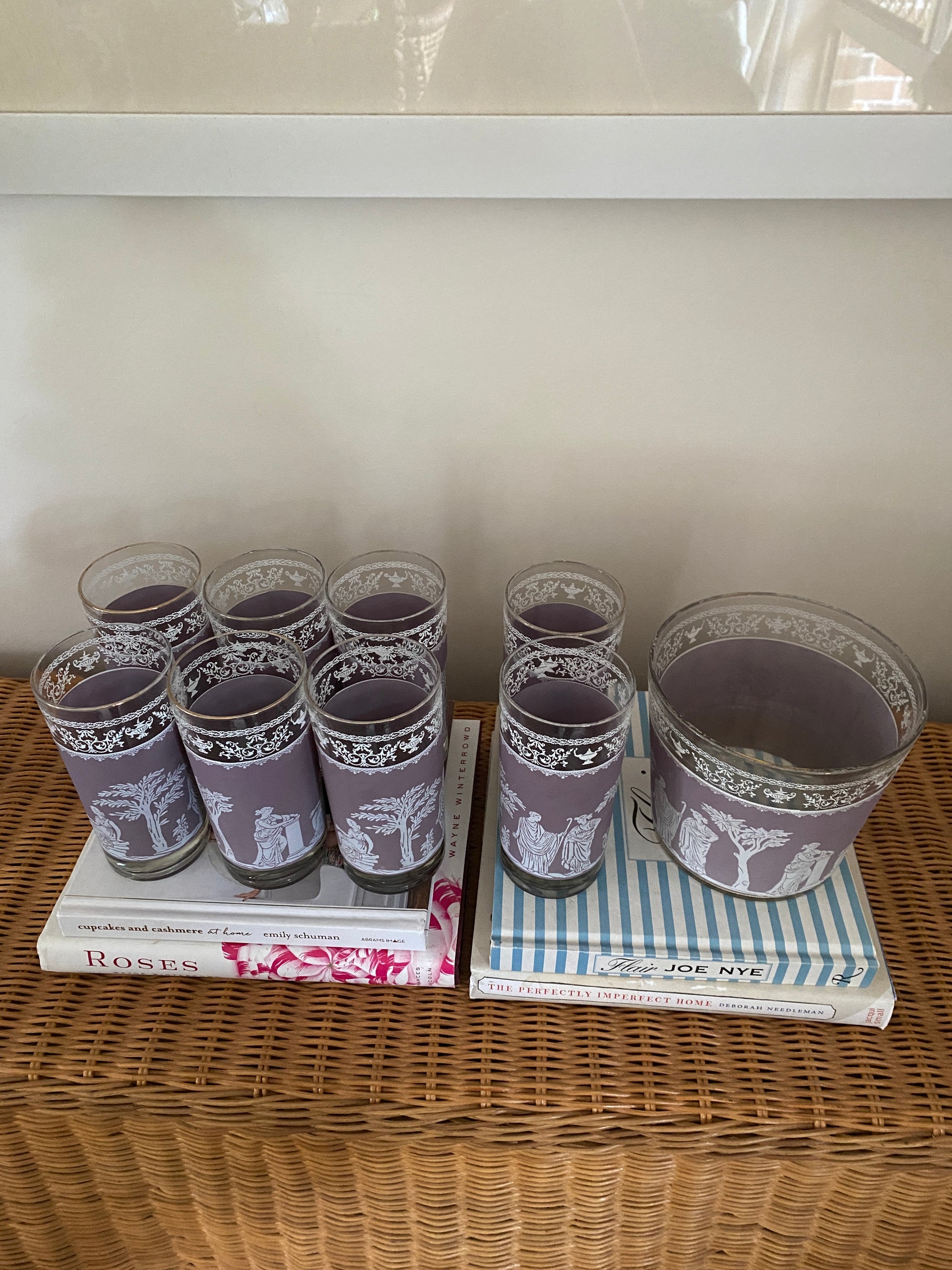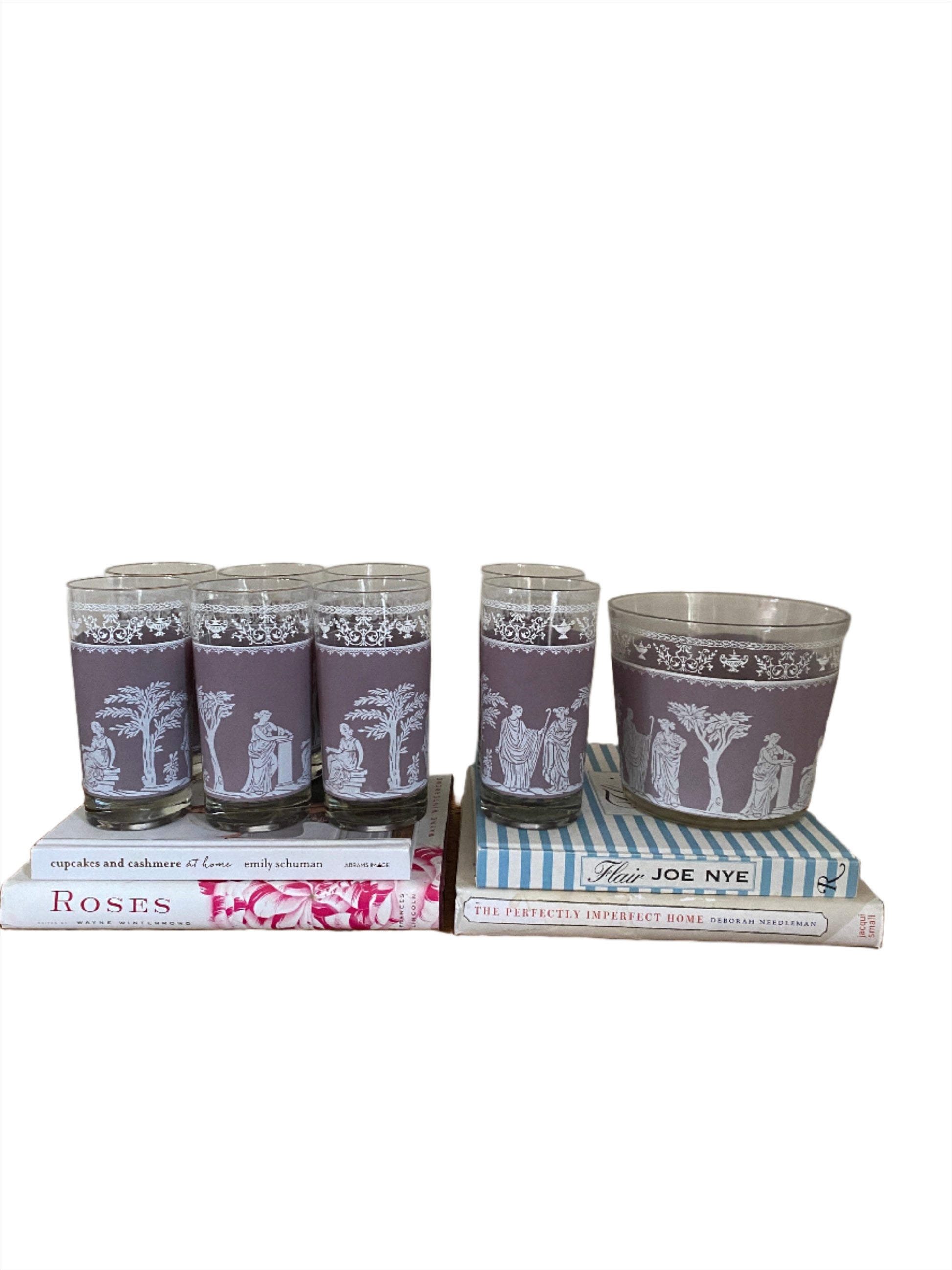 Set of 8 Grecian Purple Motif Glasses and Ice Bucket