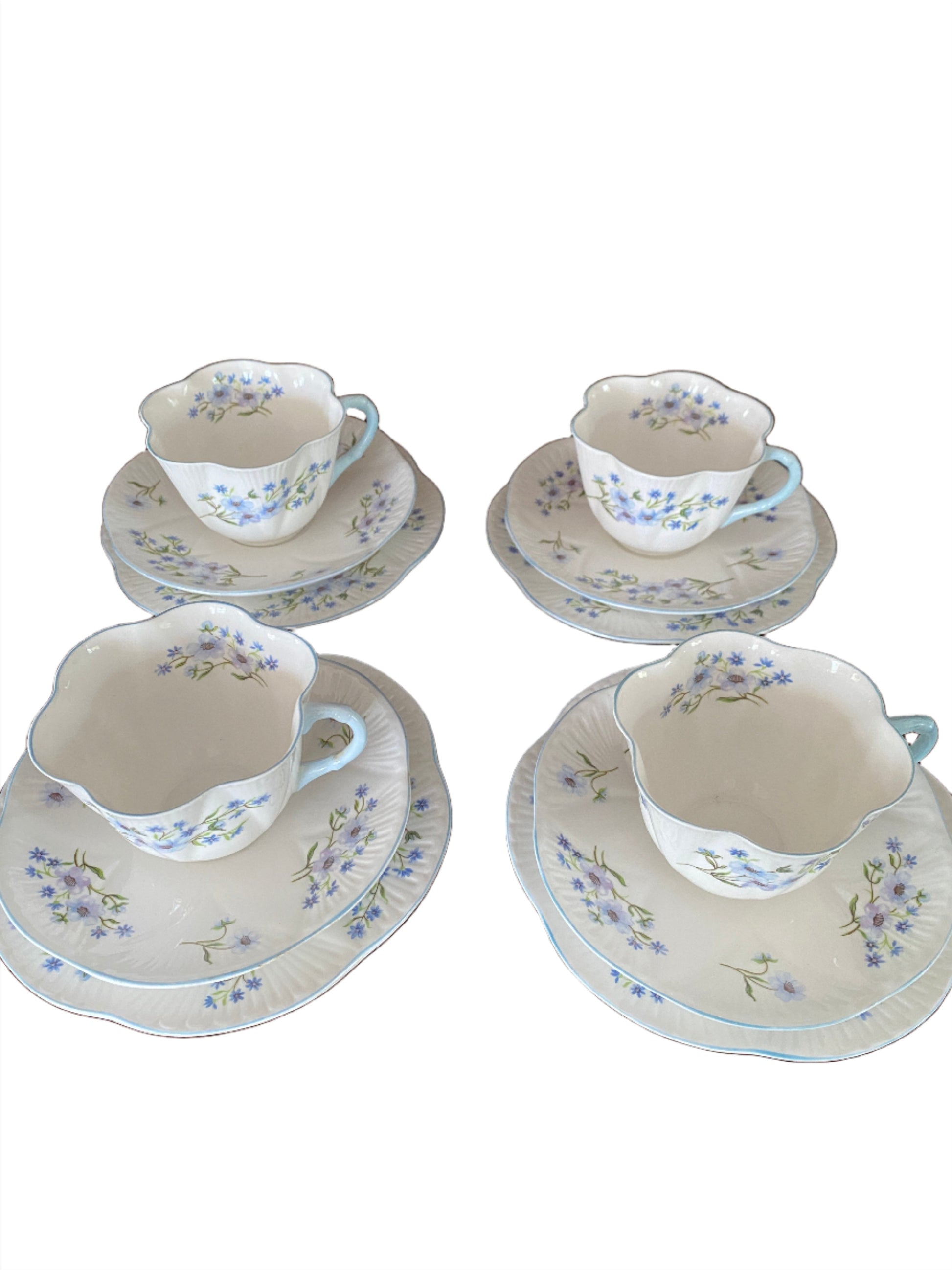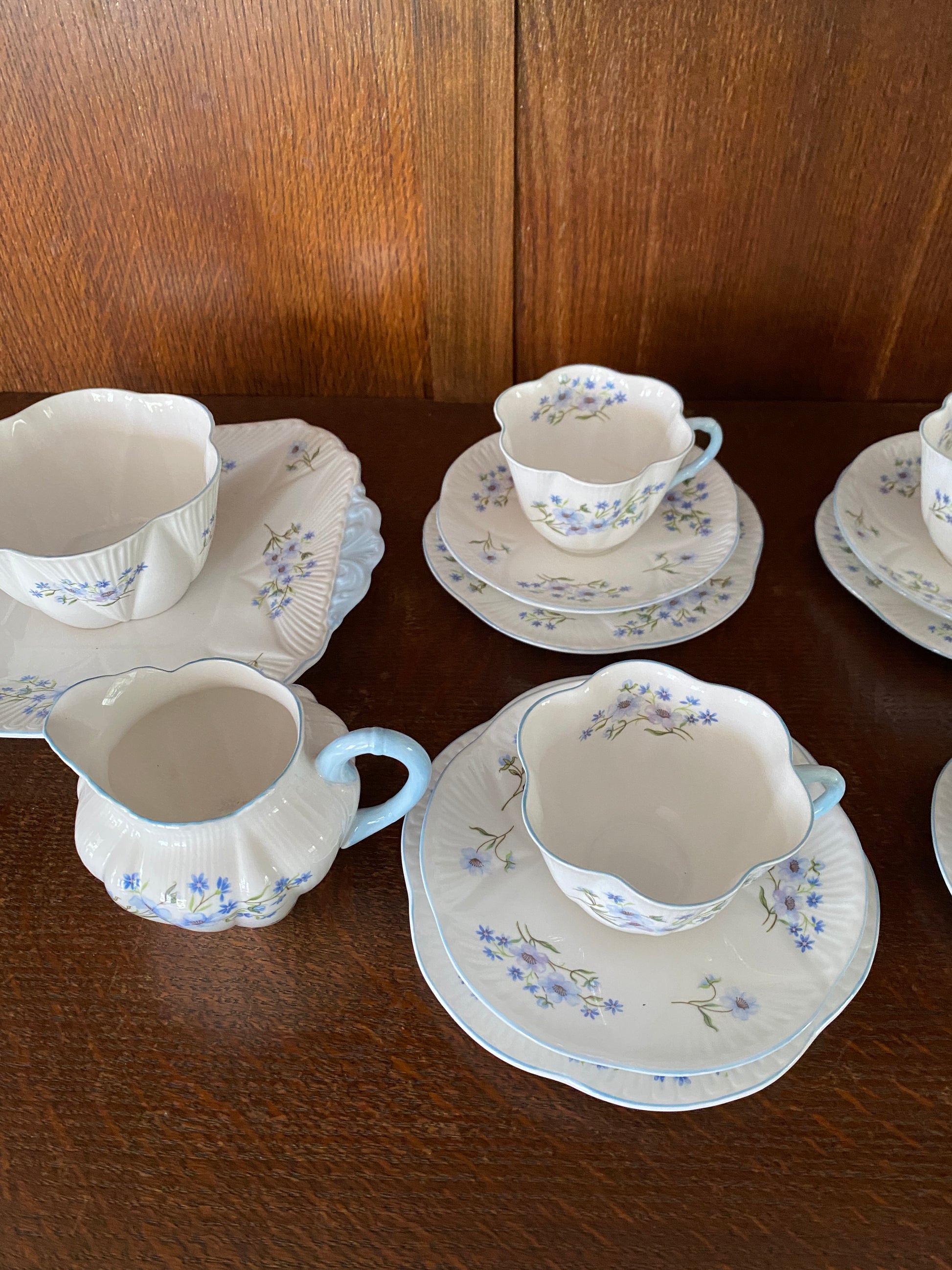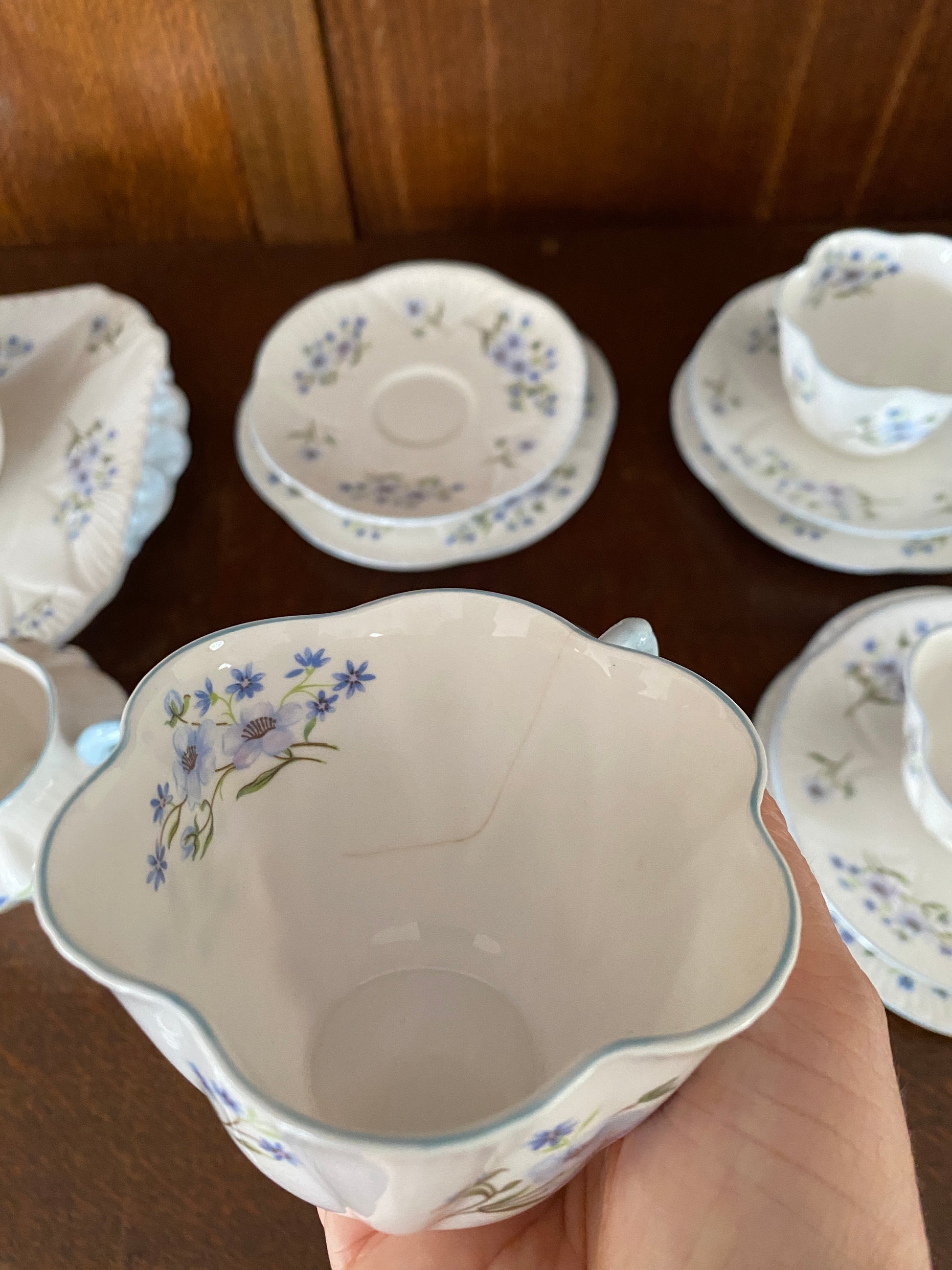 This gorgeous fine bone china tea set by Shelley is just so so divine and pretty! I love the scallop rim, the colours, its just divine. Very fine, this set is delicate. Made in England