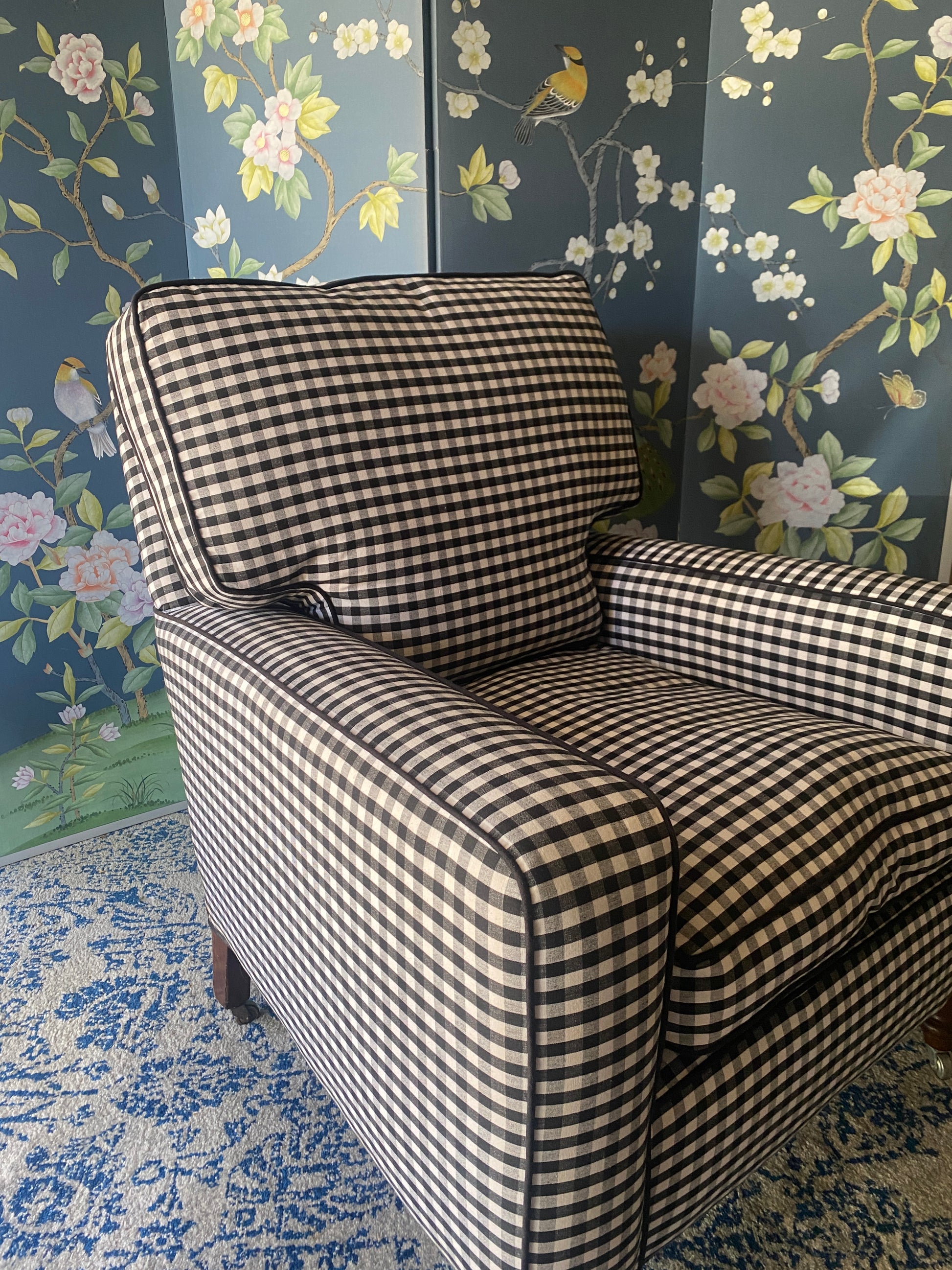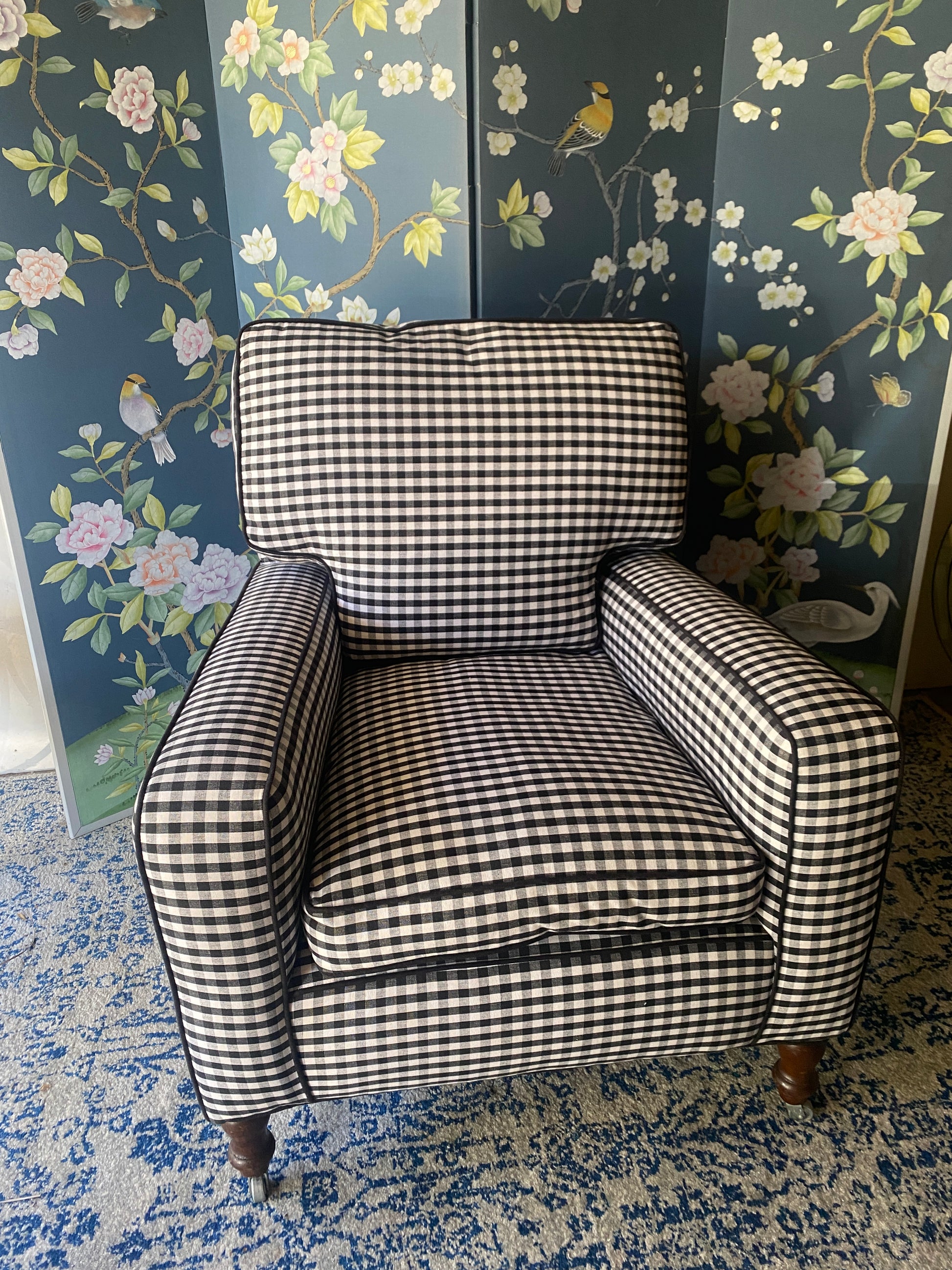 Divine designer black & white gingham armchair. Featuring feather cushions, this chair is insanely comfortable. Also has castors for easy moving in your home.