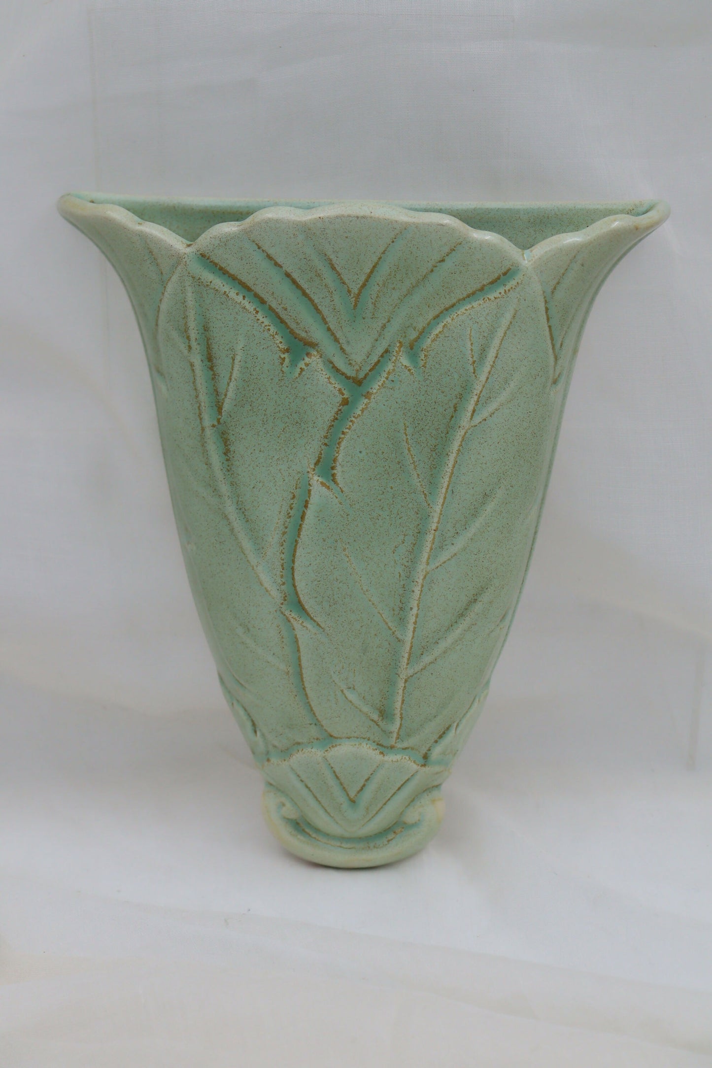 The front of this E G Greenway wall vase takes the form of overlapping stylised leaves under a soft celadon green glaze. It is 255 mm high and 225 mm wide. It has a chip to the base at the rear that measures 22 mm in length and is 7 mm wide. It can't be seen from the front. There is also a chip to the bottom of the vase that is 7 mm long and 4 mm wide. It is not terribly noticeable from the front. This was made by the E G Greenway pottery company, in Blackburn, a suburb of Melbourne in the early 1950's.