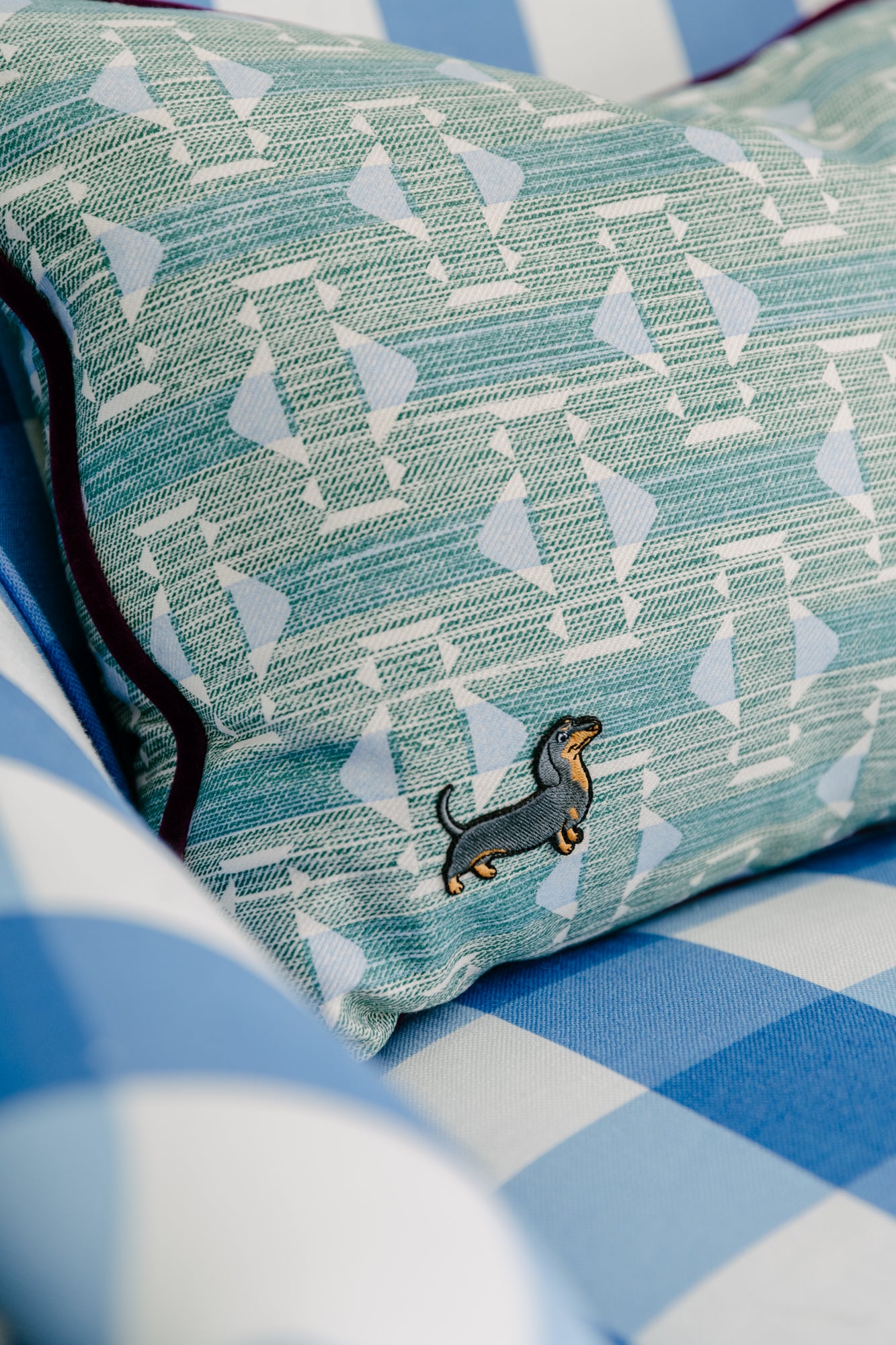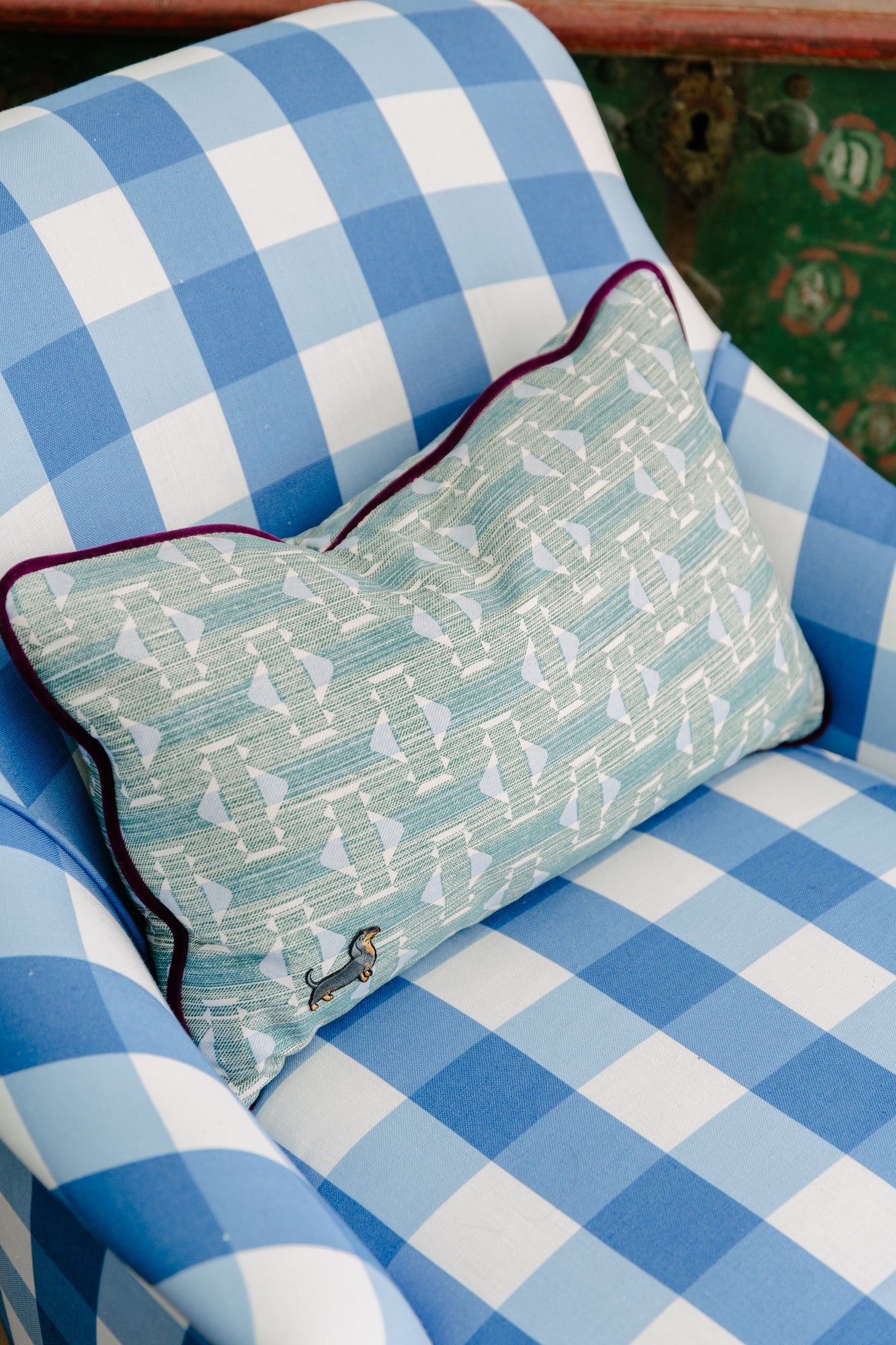 50x35cm lumbar cushion with purple velvet contrast piping and Daschund applique.