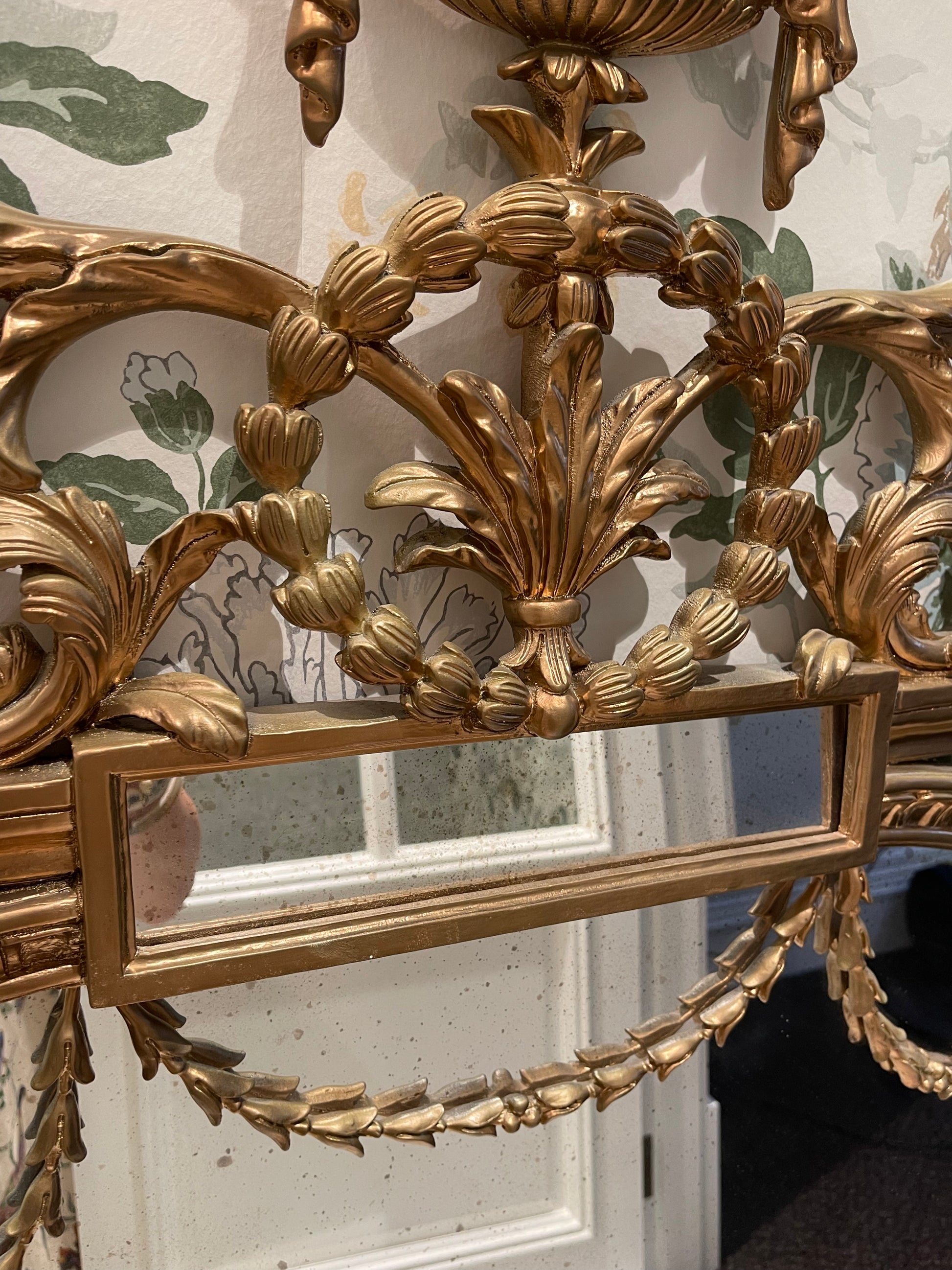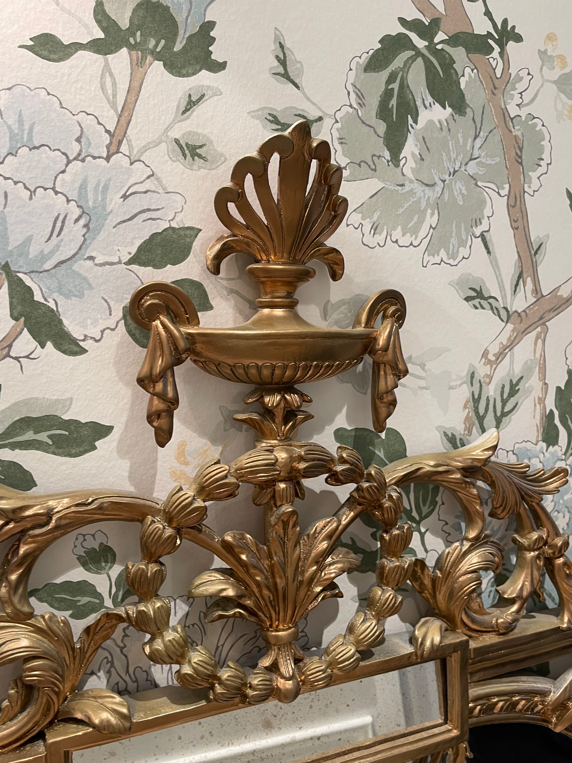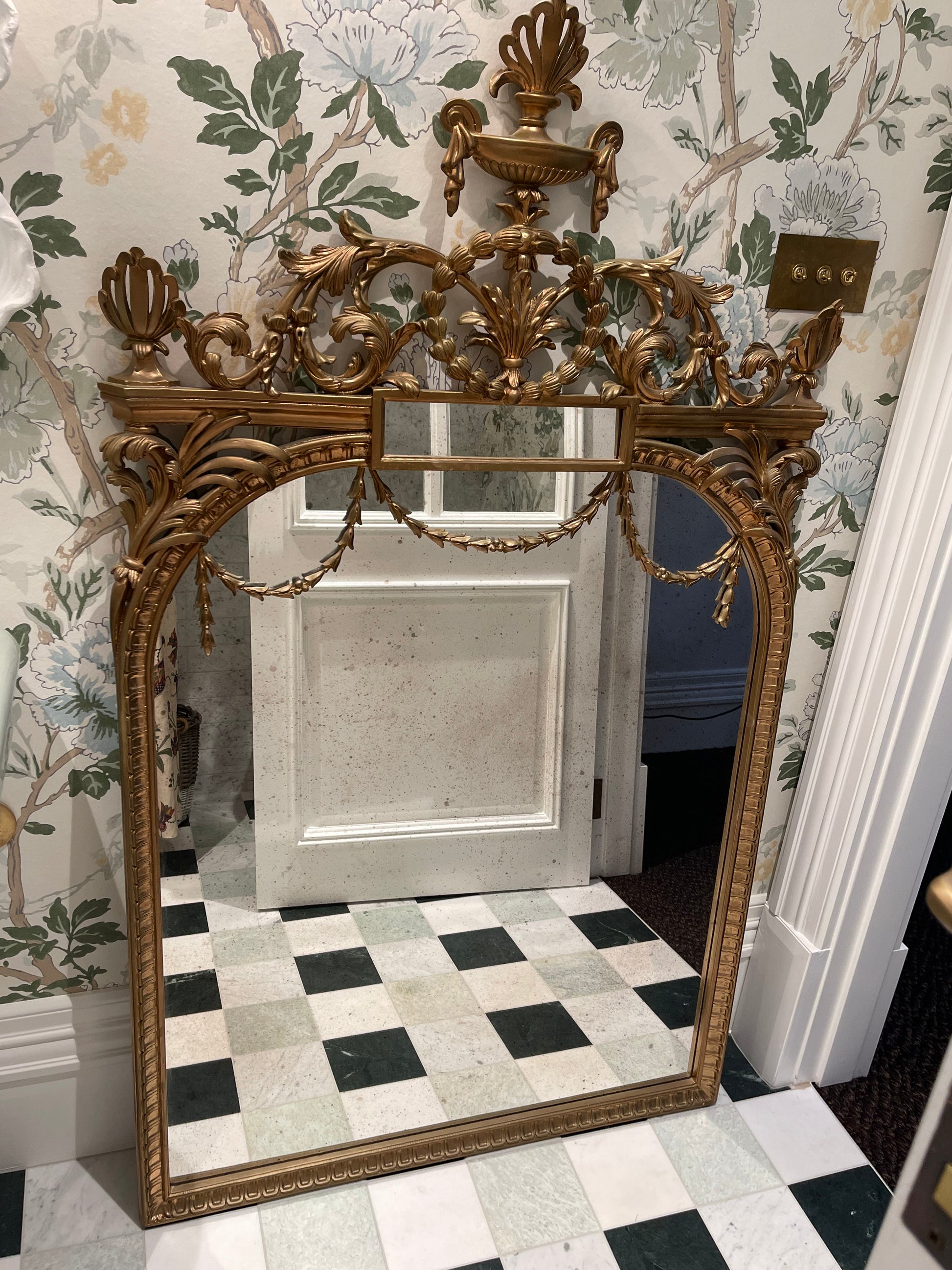 ornate french inspired mirror. Made in Italy by Roberto Giovanni. Purchased through Laura Kincade in Sydney. Hand carved with leaf motif beading across mirror, high urn header and arabesque leaves. Aged mirror to centre. Originally in my home featured in House and Garden. Was purchased in hand painted black and then re-painted in gold for a new home. When purchased was $3500.