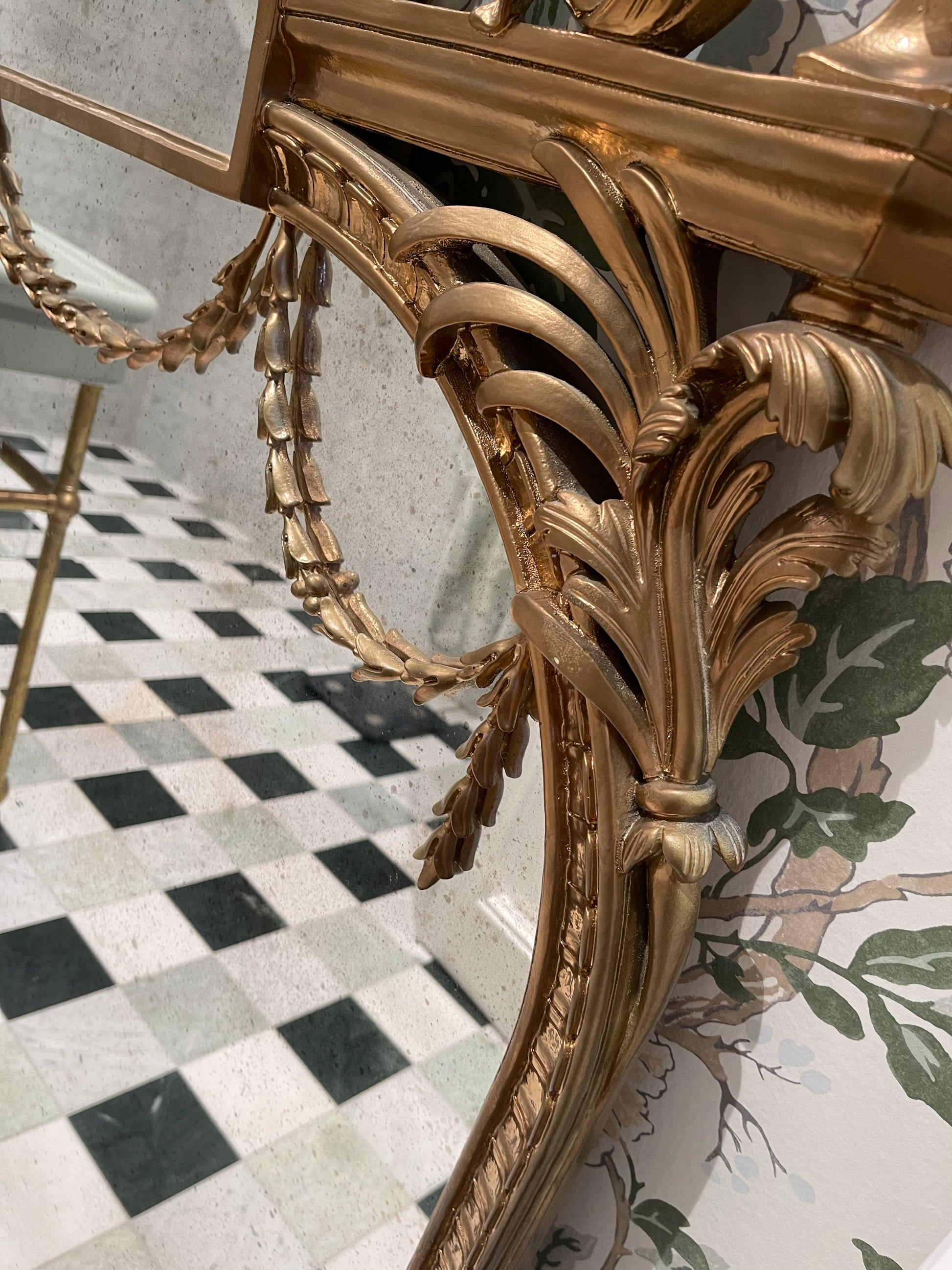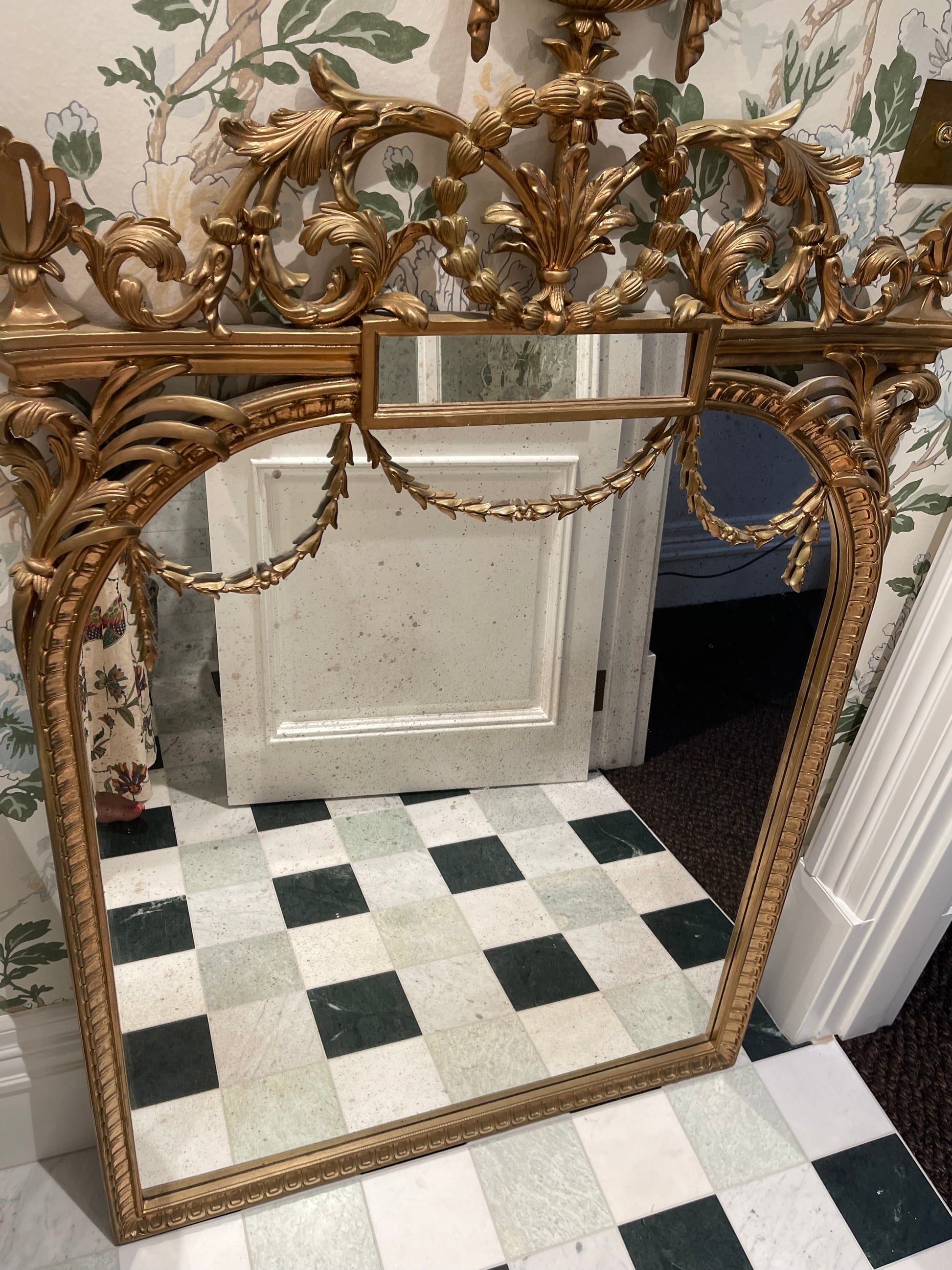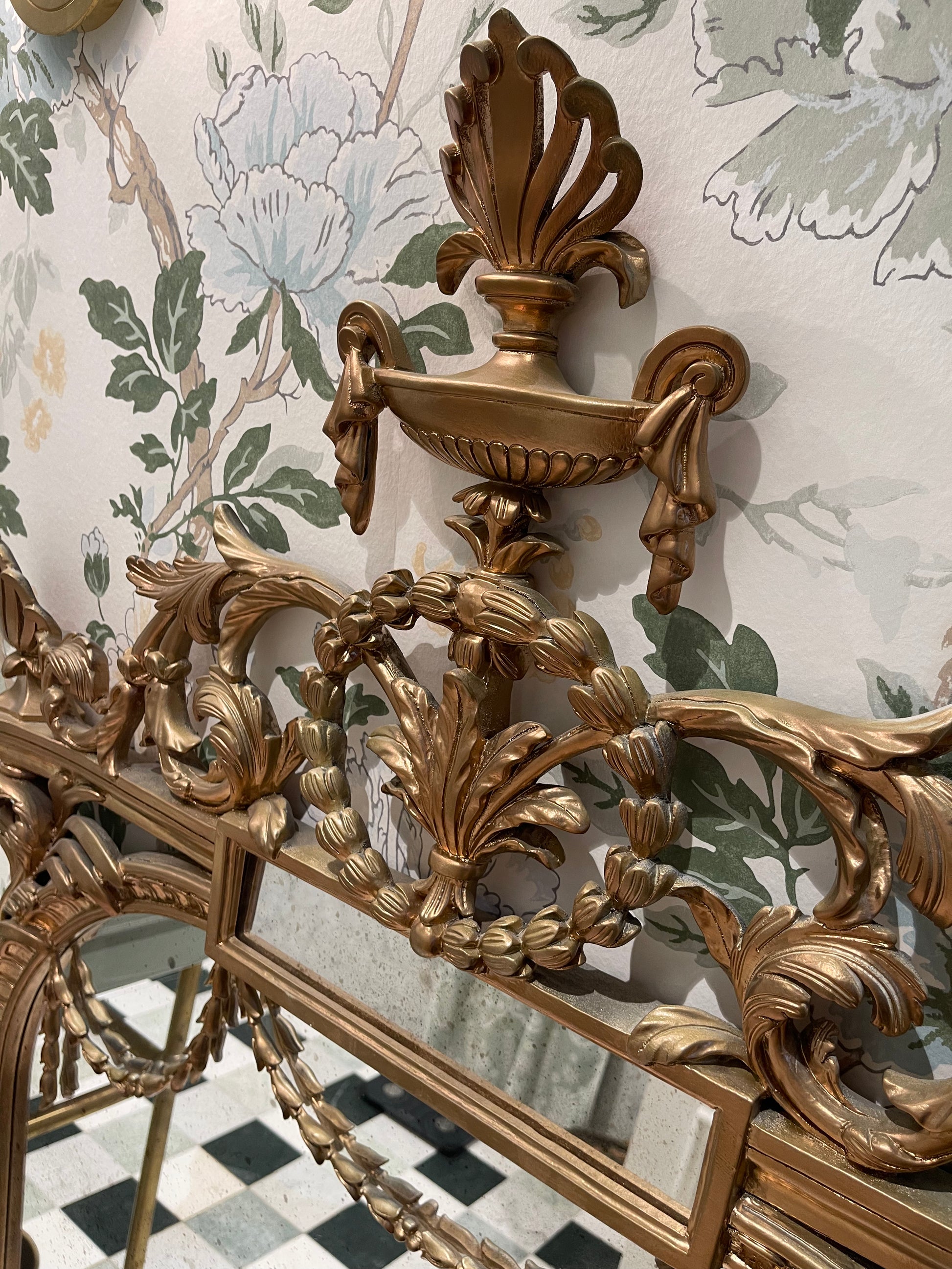 ornate french inspired mirror. Made in Italy by Roberto Giovanni. Purchased through Laura Kincade in Sydney. Hand carved with leaf motif beading across mirror, high urn header and arabesque leaves. Aged mirror to centre. Originally in my home featured in House and Garden. Was purchased in hand painted black and then re-painted in gold for a new home. When purchased was $3500.