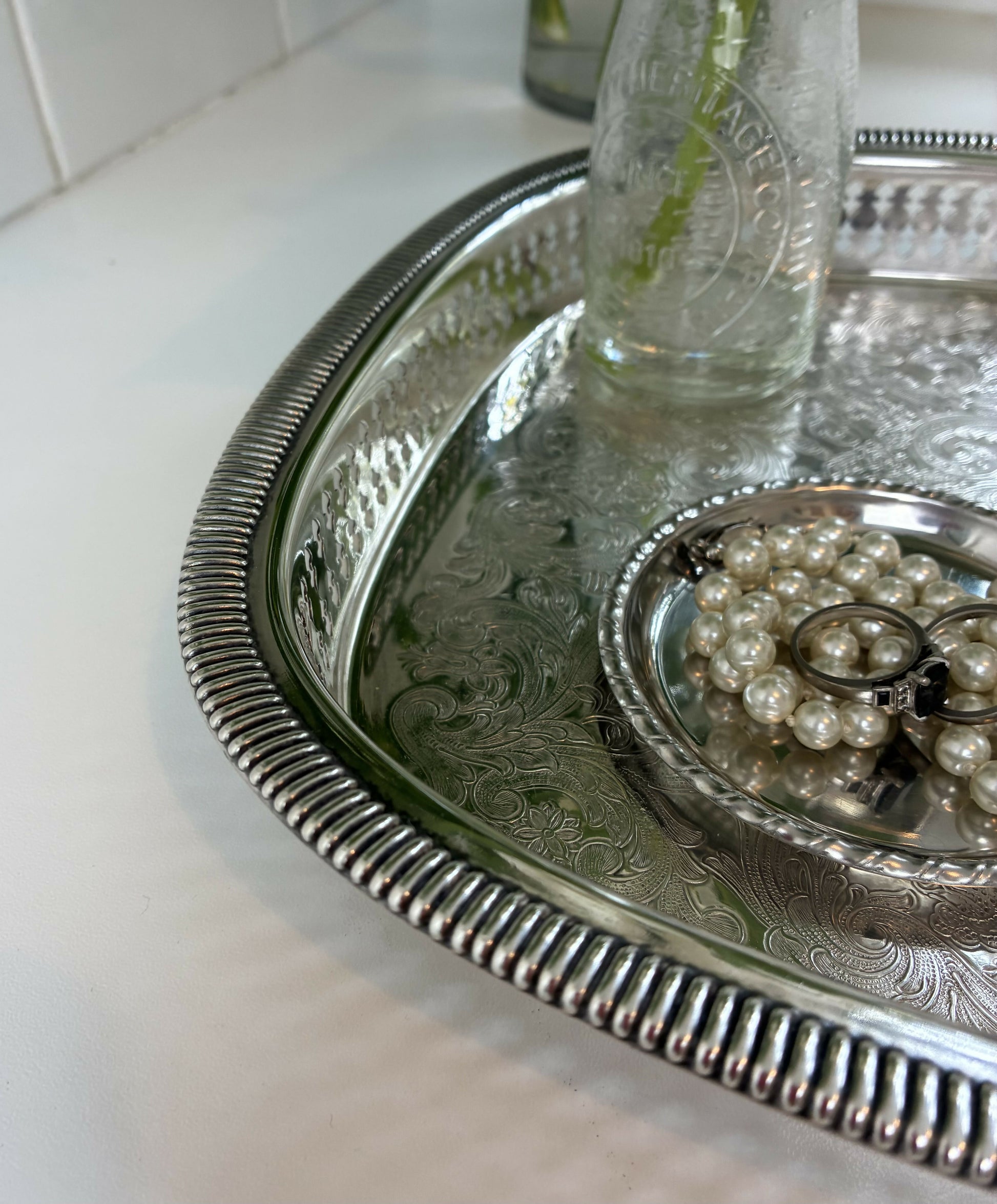 This gorgeous vintage tray is in excellent condition. No obvious blemishes at all. Not super heavy (630 grams), the tray is silver plate on copper. Stamped RODD on the base, it measures 39cm x 28cm x 3.5cm high