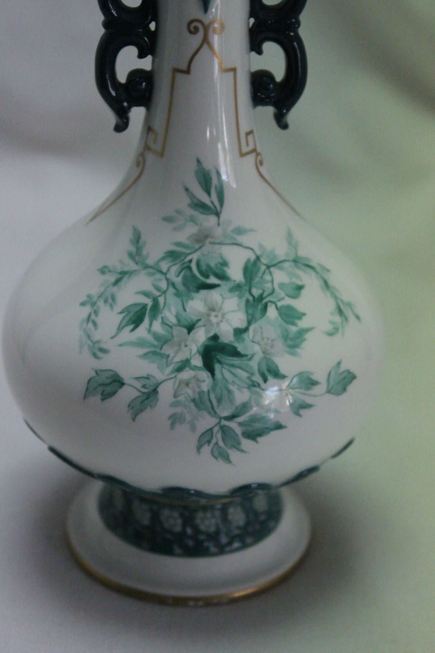 This Hadley Worcester onion shaped vase is decorated with subtle hand painted sprays of white and grey dog roses and green foliage. A smaller spray is on the reverse. It also features a reticulated neck, coloured clay mounts and gilding. The reticulated neck is a frieze of hand cut flowers. It stands 160 mm high (6.25 Inches). The shape number is F127 which is a shape not seen all that often. Its condition is very good, but it does suffer from some loss of the gilding to the rim and the foot which is just visible in the photo. It dates from 1897-1900.