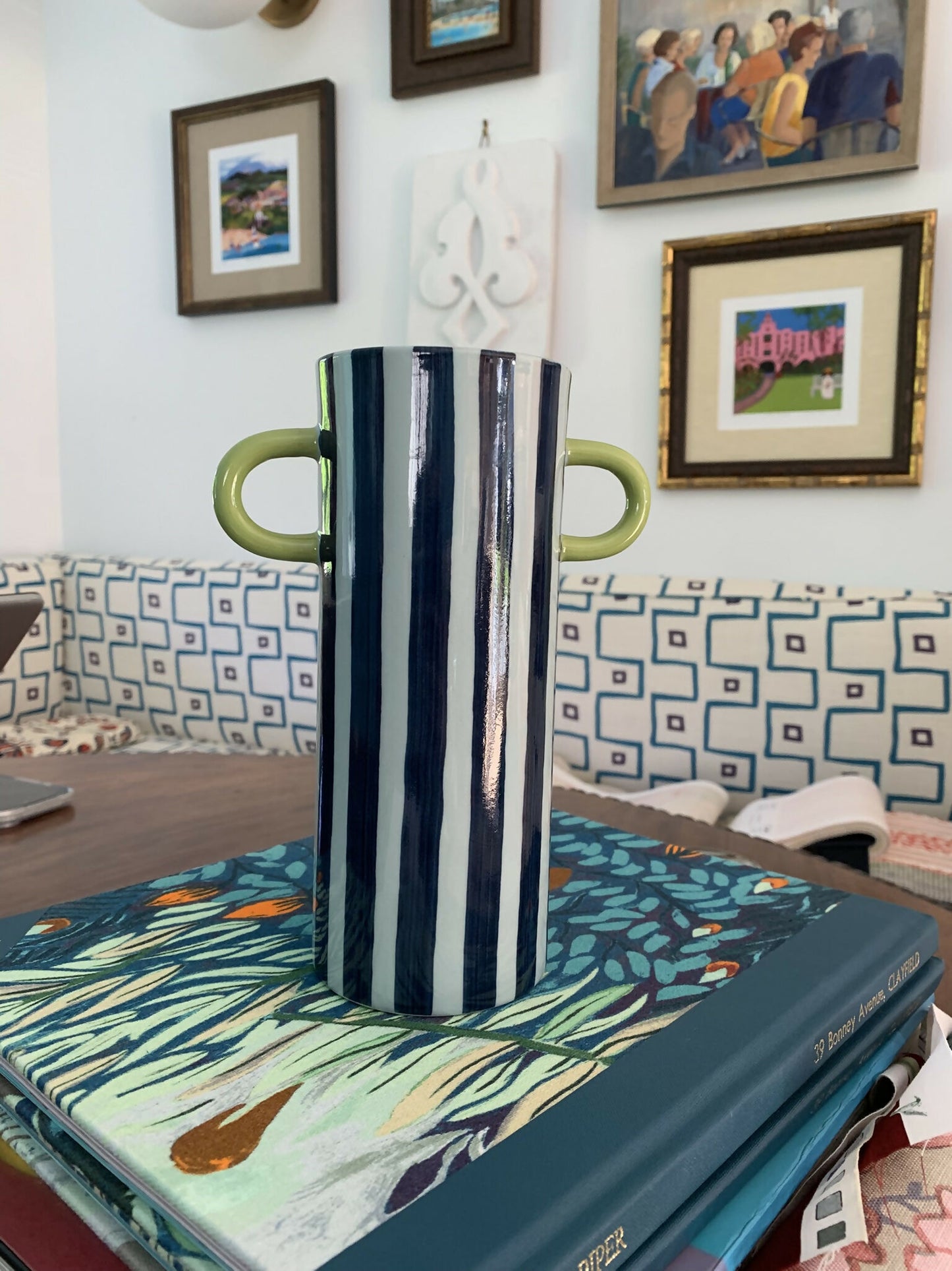 A striking hand-made and hand-painted vase with blue stripes and contrast orange ceramic inside. Perfect for a bouquet of flowers or on its own on display. Beautiful for the kitchen window, guest room or to style in a bookcase.
