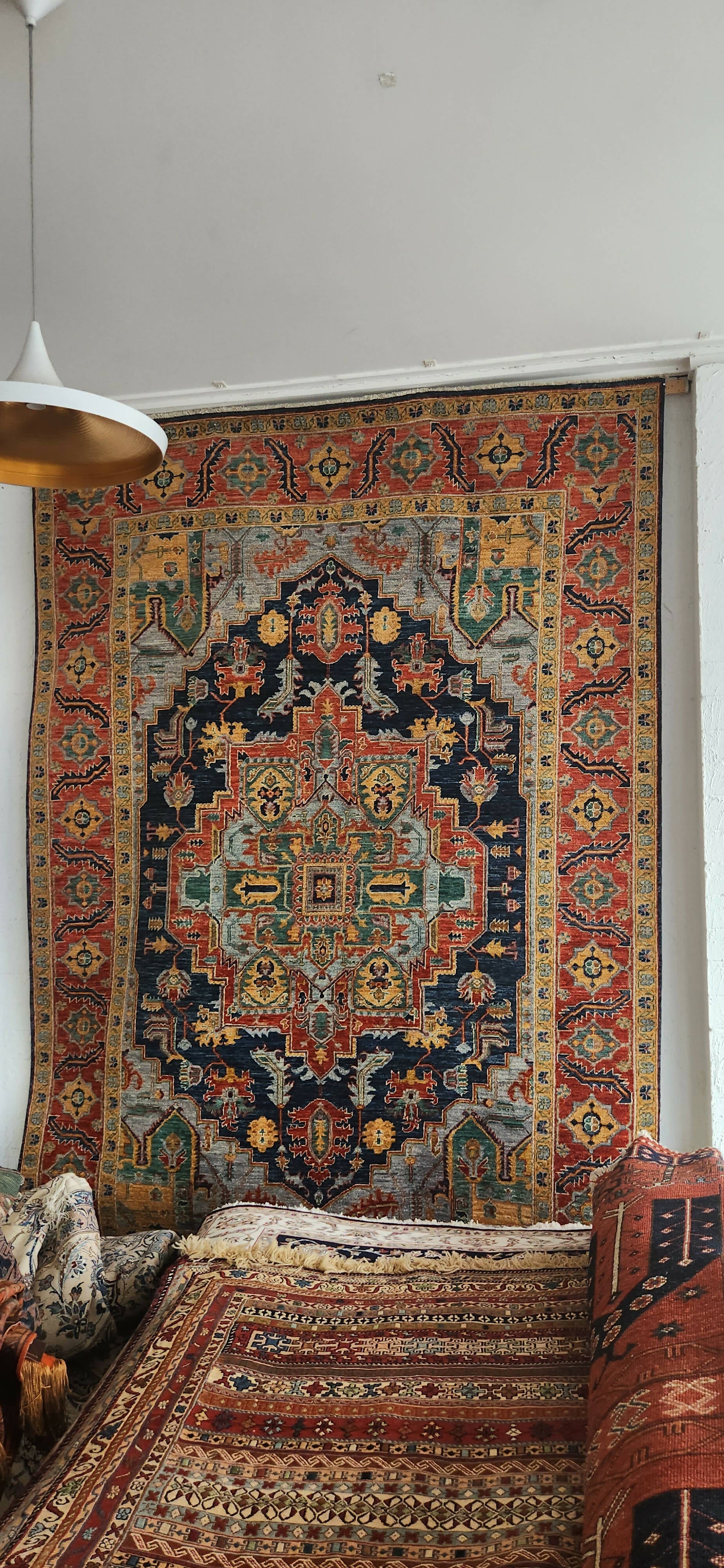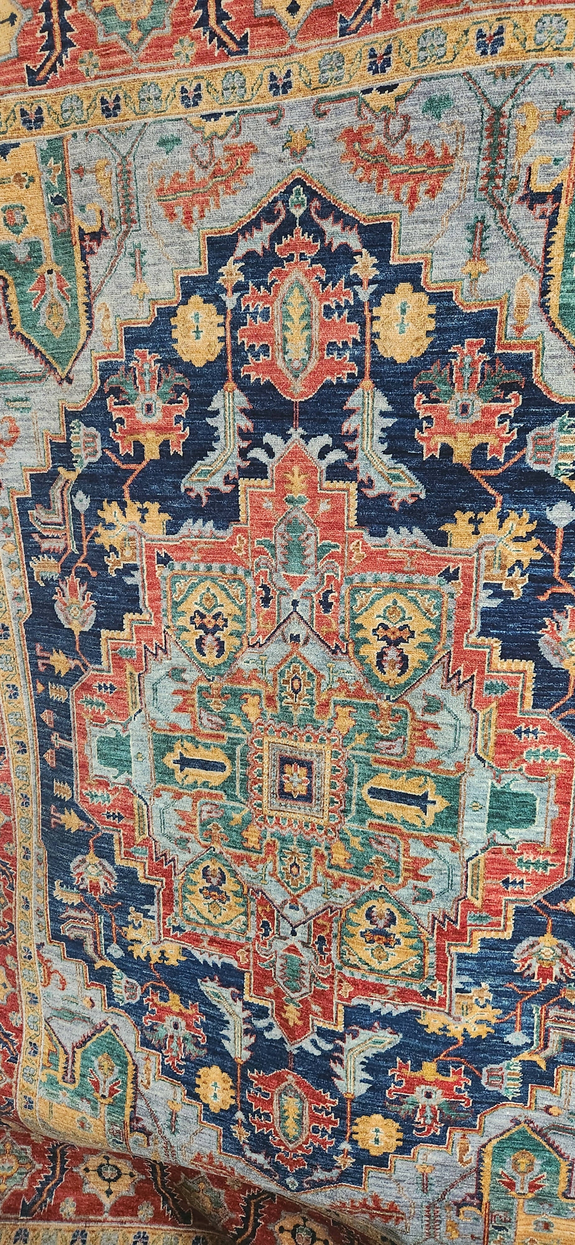 Gorgeous geometric design with navy blue and baby blue background incorporating stunning geometric pattersn of gold, red, yellows, greens, browns. Red and yellow gold borders.