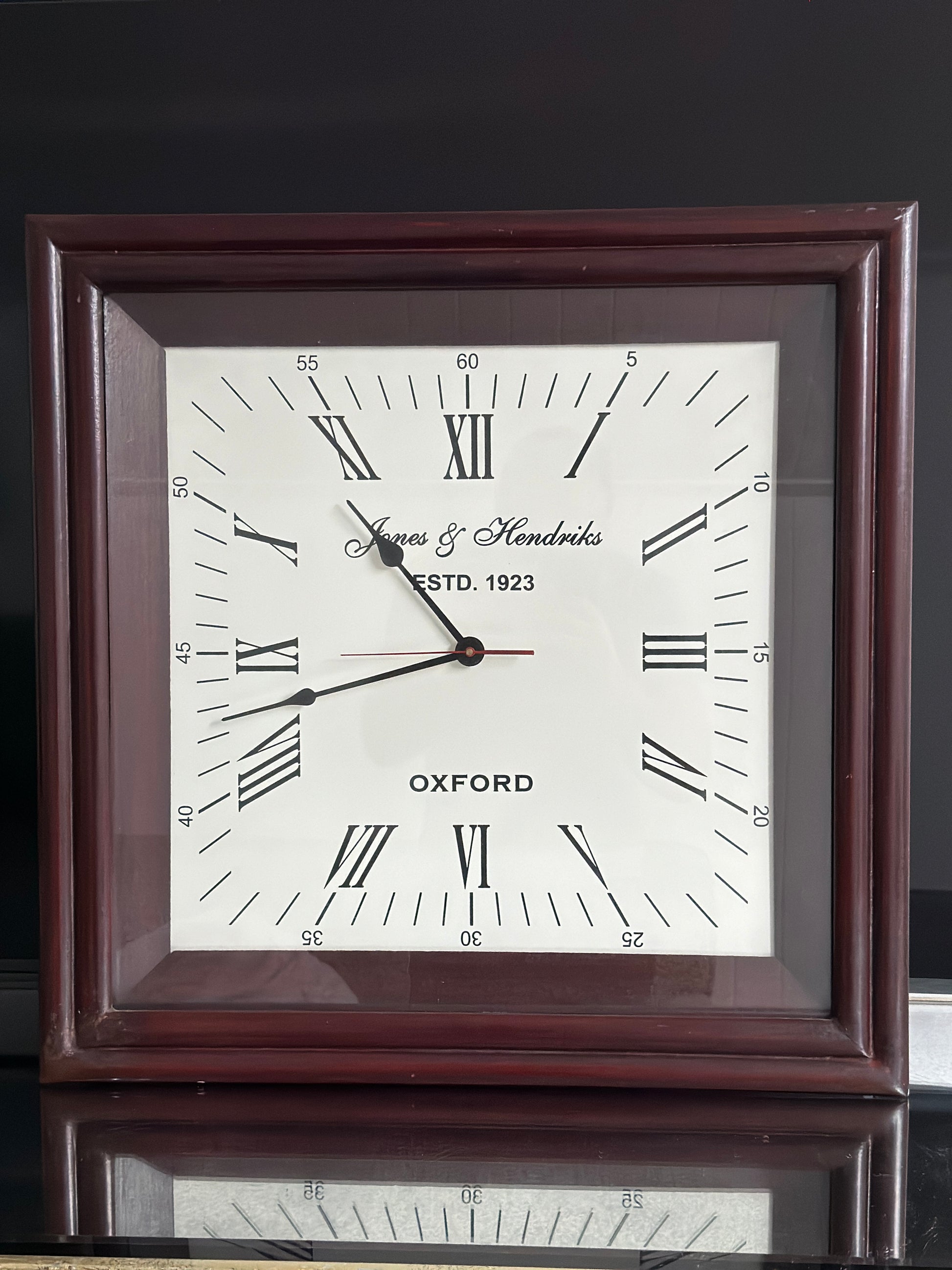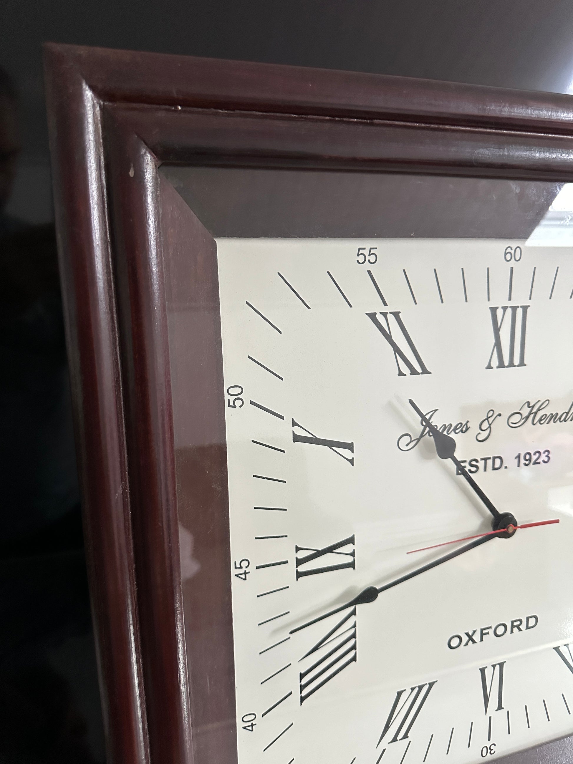 James and Hendricks handsome wall clock with timber walnut stained beaded frame. Traditional style and battery operated.