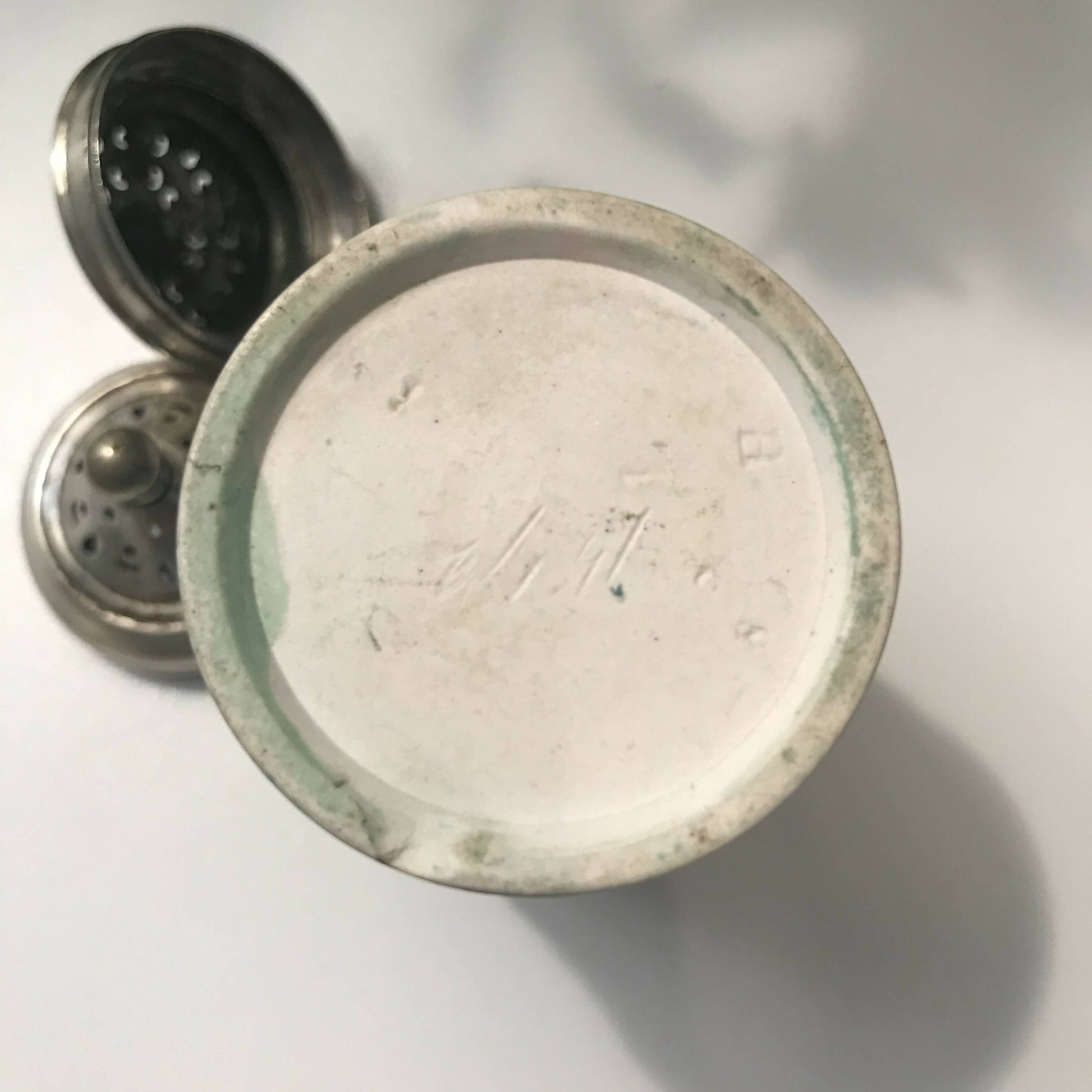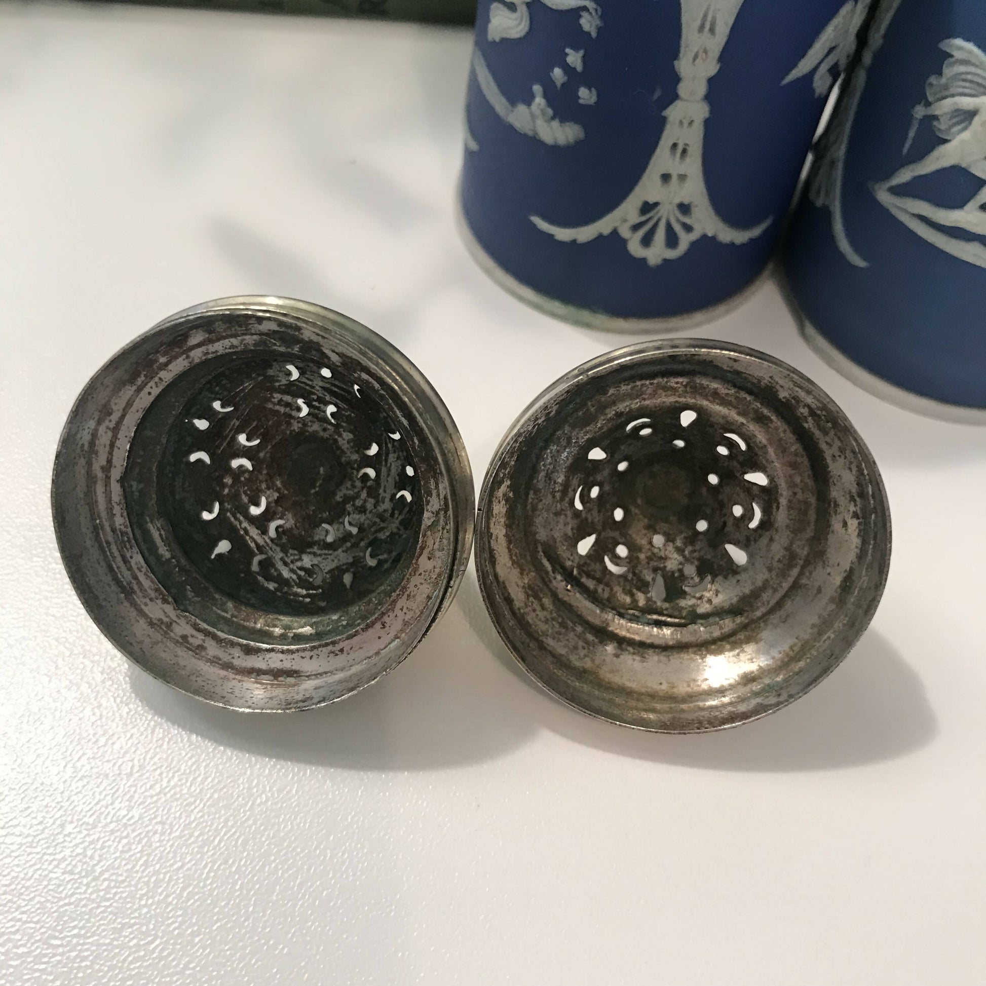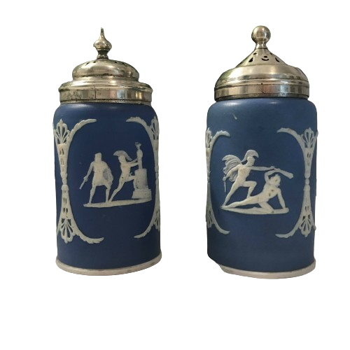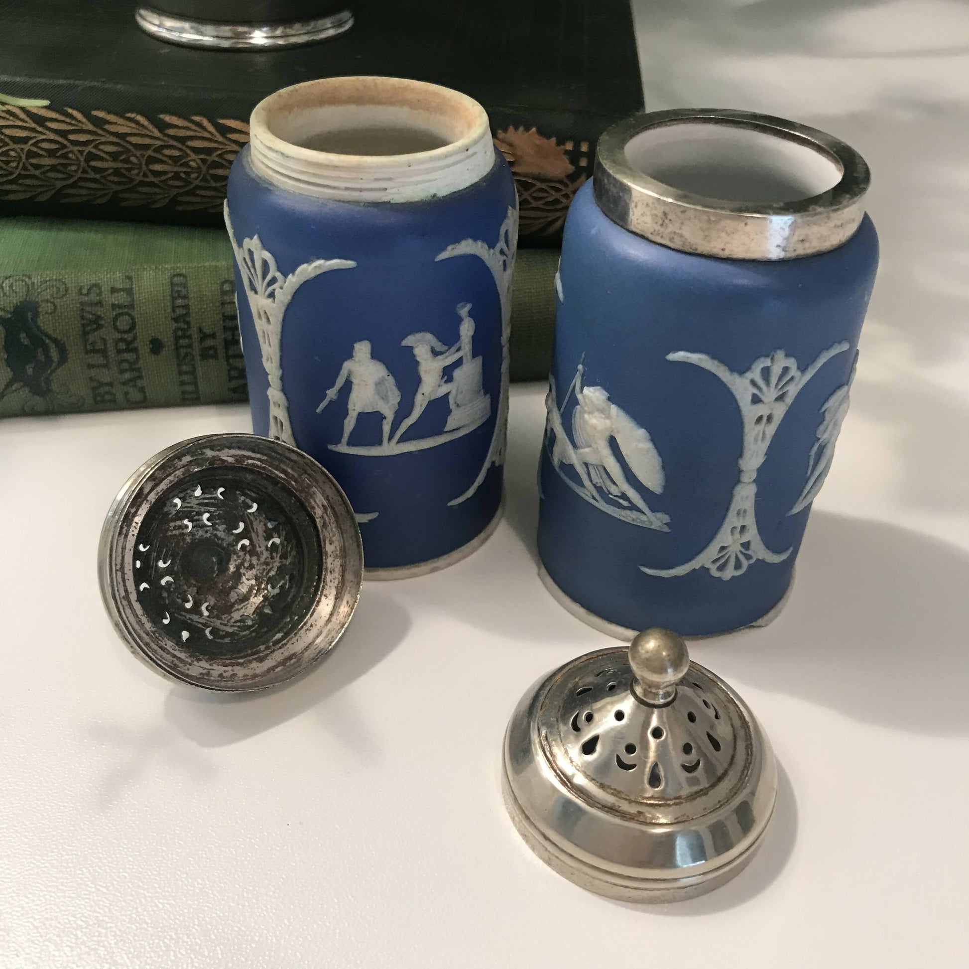 This lovely old pair date from the 1880’s, they are perfectly serviceable, but probably one for the collection! The silver (plated) rim of one has attached itself to the pierced top, the other has a LOT of nibbles to the base. Early Wedgwood? Not sure.They stand 10cm high x 4.5cm diameter