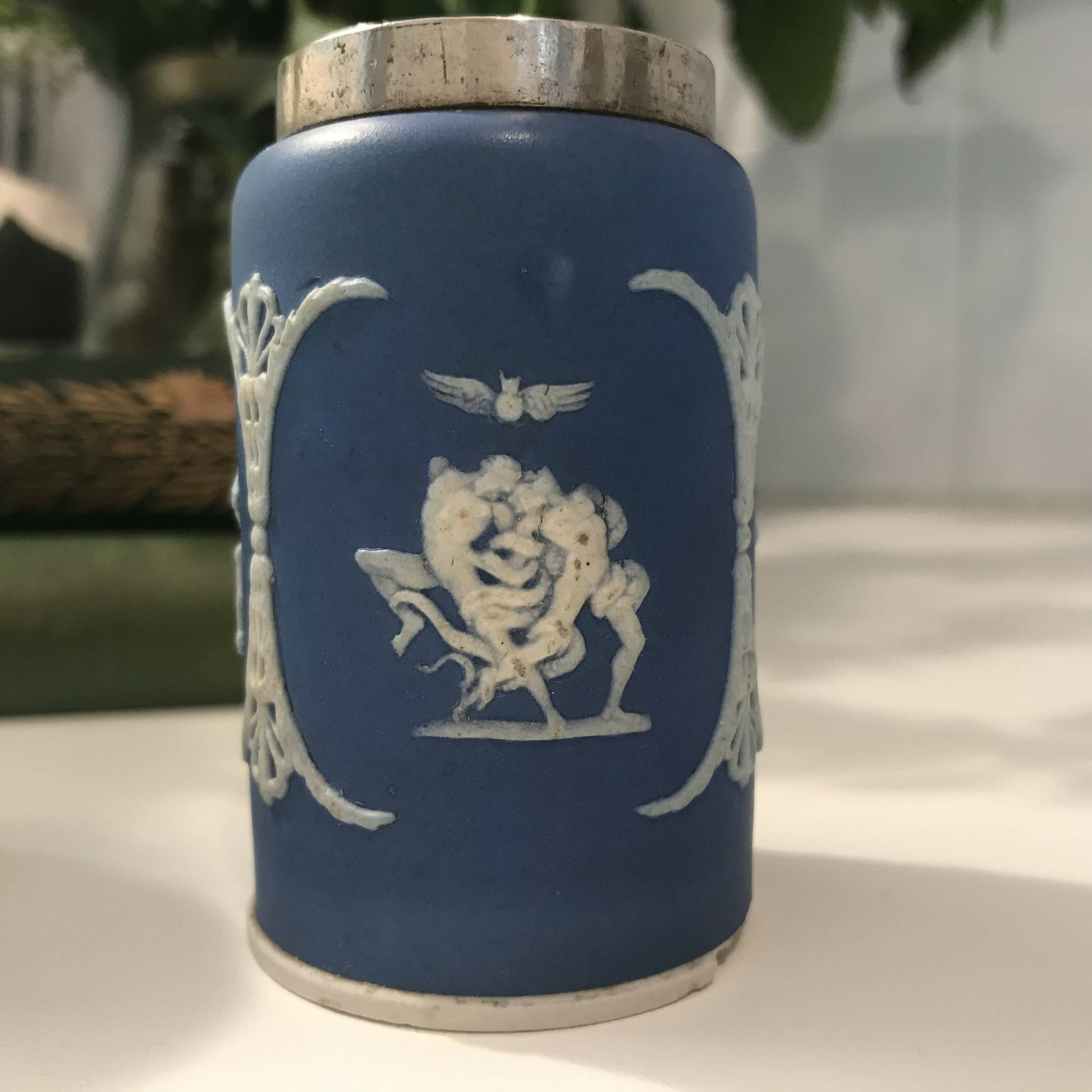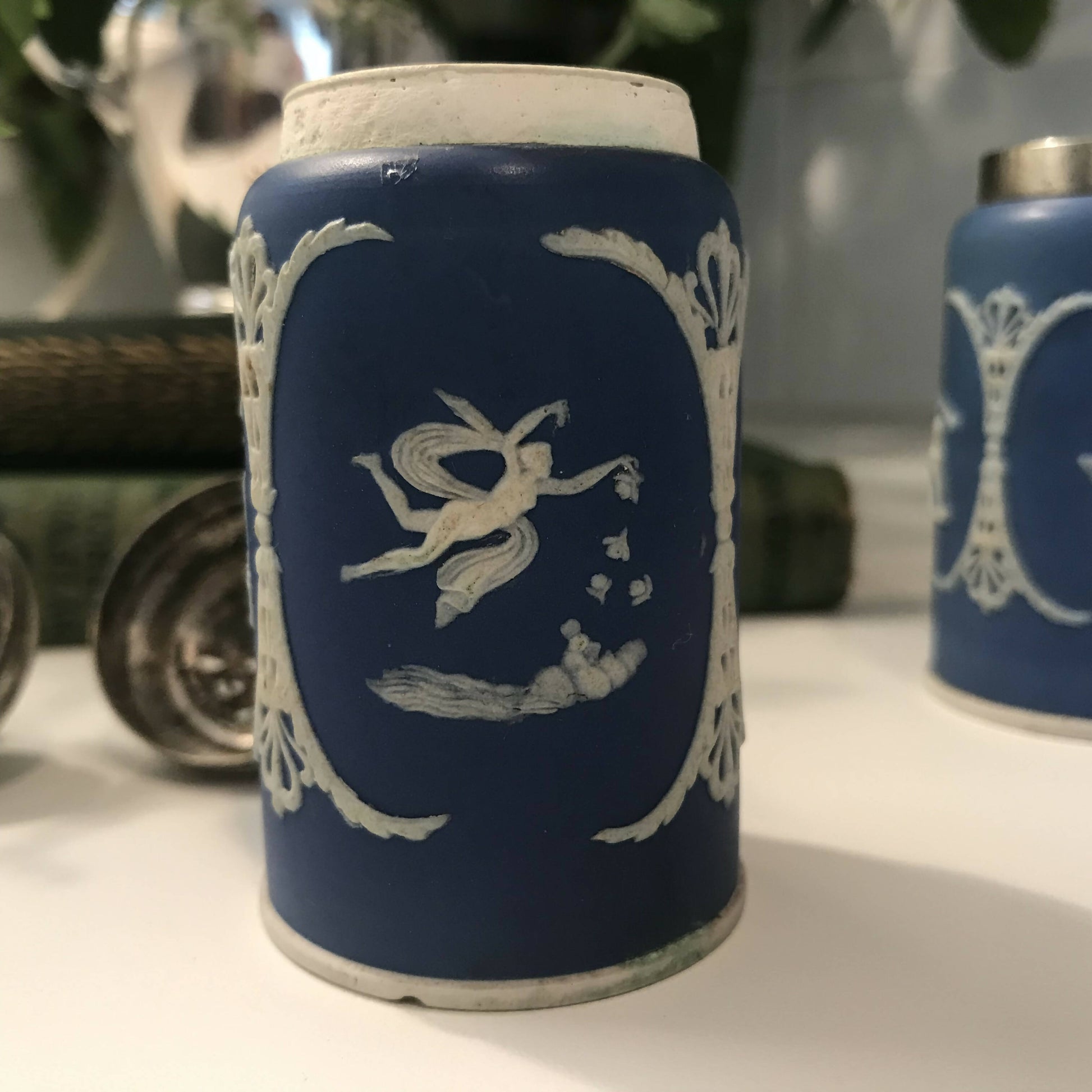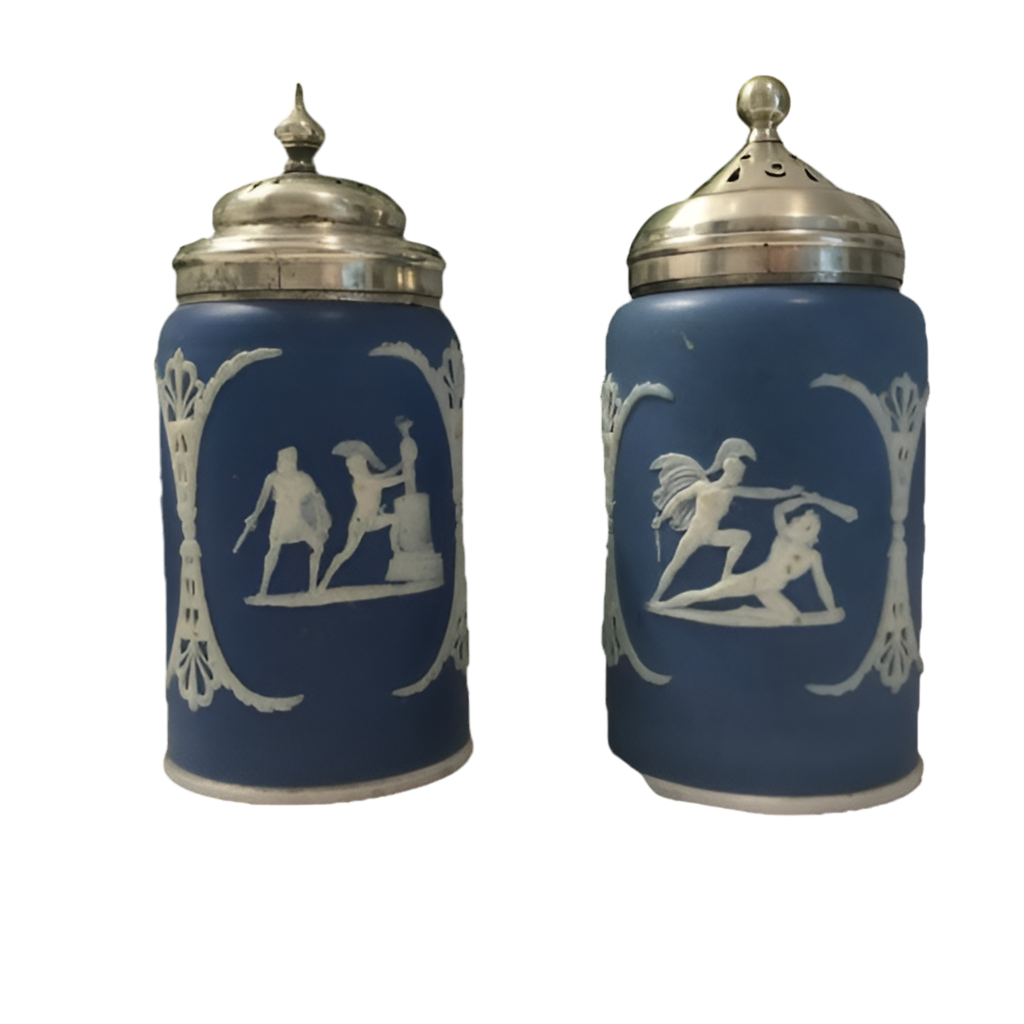 This lovely old pair date from the 1880’s, they are perfectly serviceable, but probably one for the collection! The silver (plated) rim of one has attached itself to the pierced top, the other has a LOT of nibbles to the base. Early Wedgwood? Not sure.They stand 10cm high x 4.5cm diameter