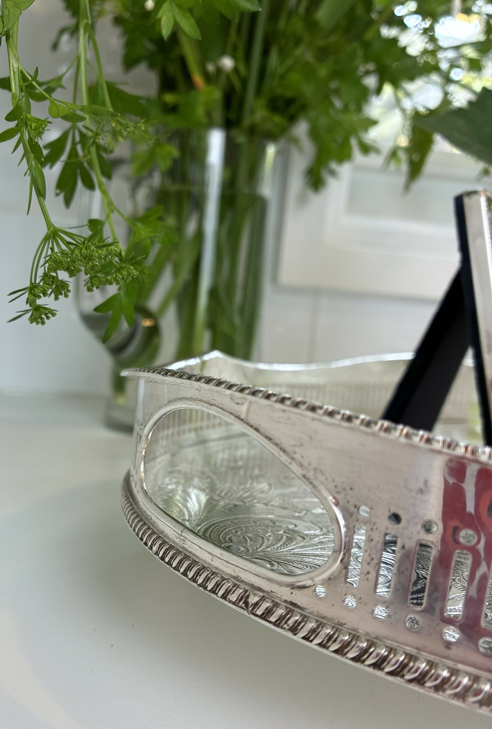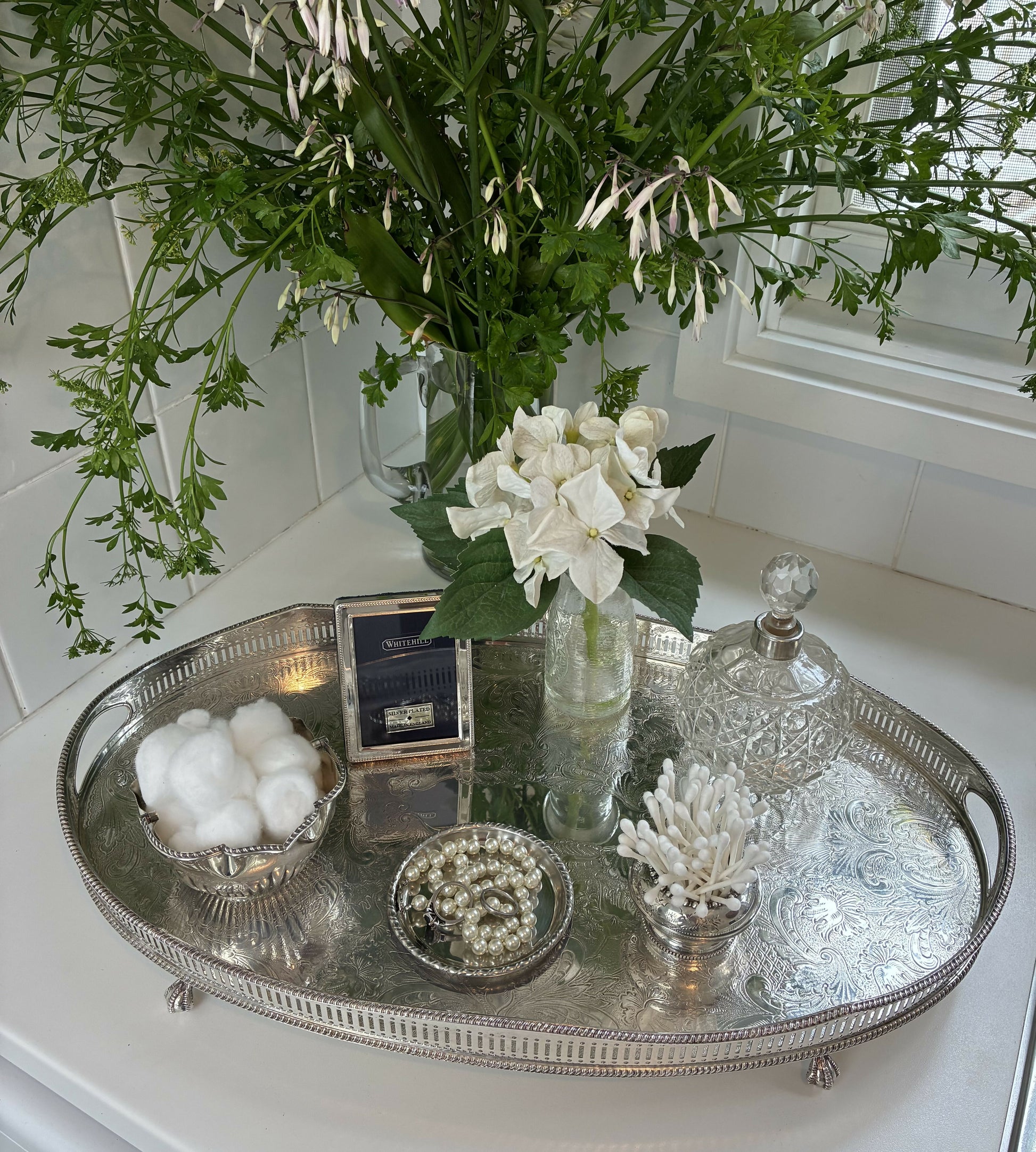 This magnificent big tray with it’s gorgeous ball and claw feet is in very good vintage condition. There are 3 tiny spots of wear (see photo) but none along the gallery or handles, and no major scratches. Quite heavy (about 1430 grams), the tray is silver plate on copper. Stamped Whitehill, Sheffield, England on the base, it measures 51cm x 31cm x 6.5cm high