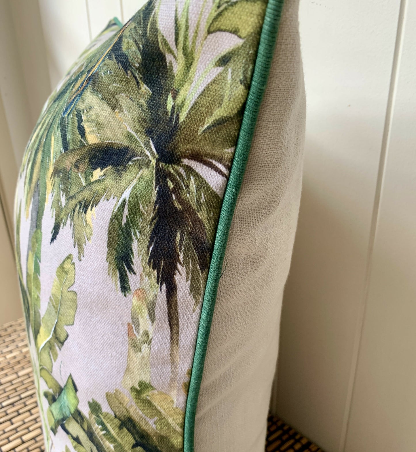 Cotton canvas front, linen look back with lapped zip finish, ribbed cotton piping.