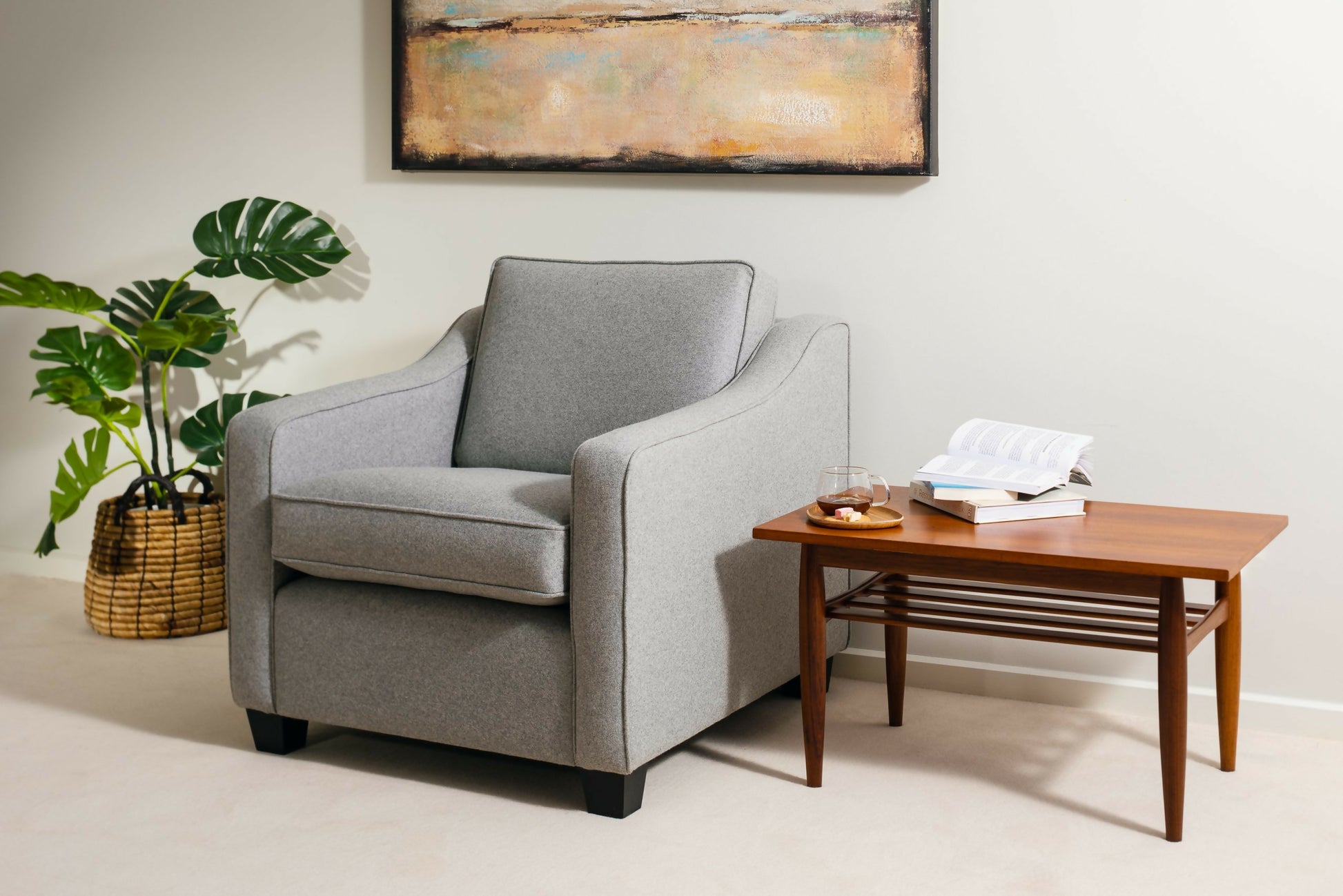 The Macquarie Armchair is a masterpiece of modern comfort and classic design. With its plush grey upholstery and elegantly curved armrests, this chair adds a touch of sophistication to any living space. Its sleek lines and understated elegance make it a versatile piece that complements both contemporary and traditional interiors.