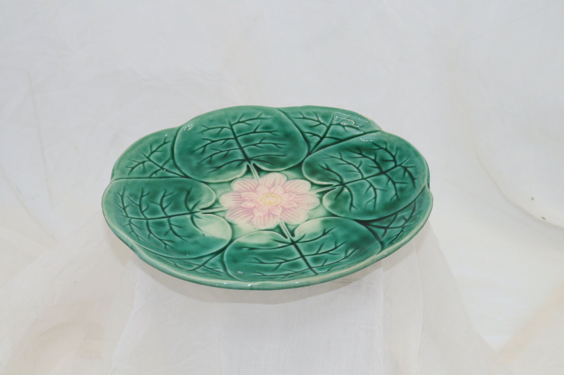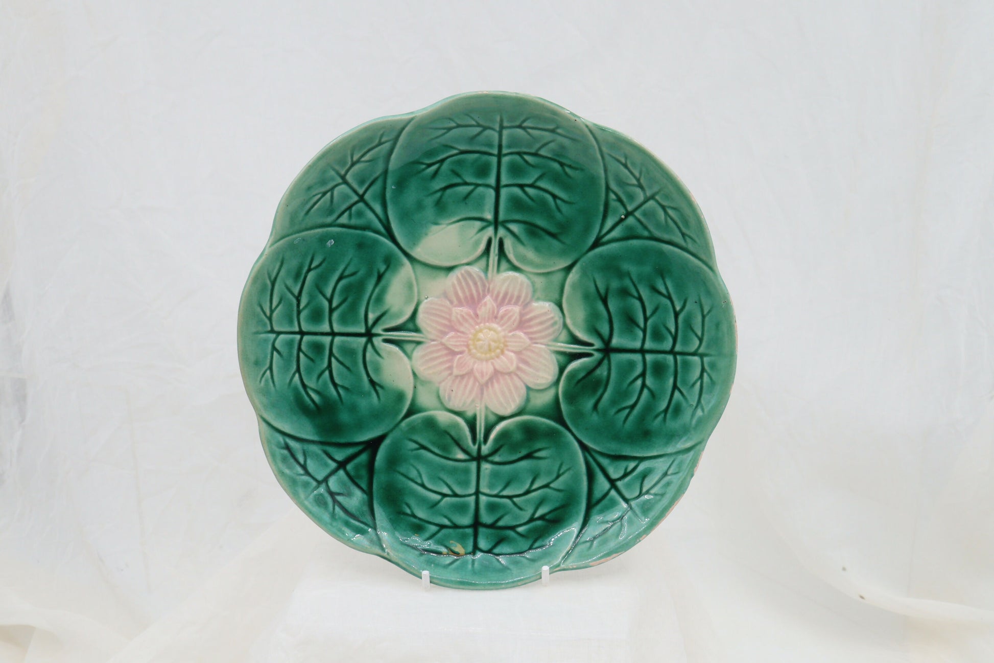 Surrounding the pink water lily flower in the centre of this majolica plate are eight overlapping green leaves, and is possibly by Thomas Forester of Longton, Staffordshire. The diameter is 227 mm (9 inches) and there is some slight loss of the green glaze to a section of the rim, It would date from around 1890.