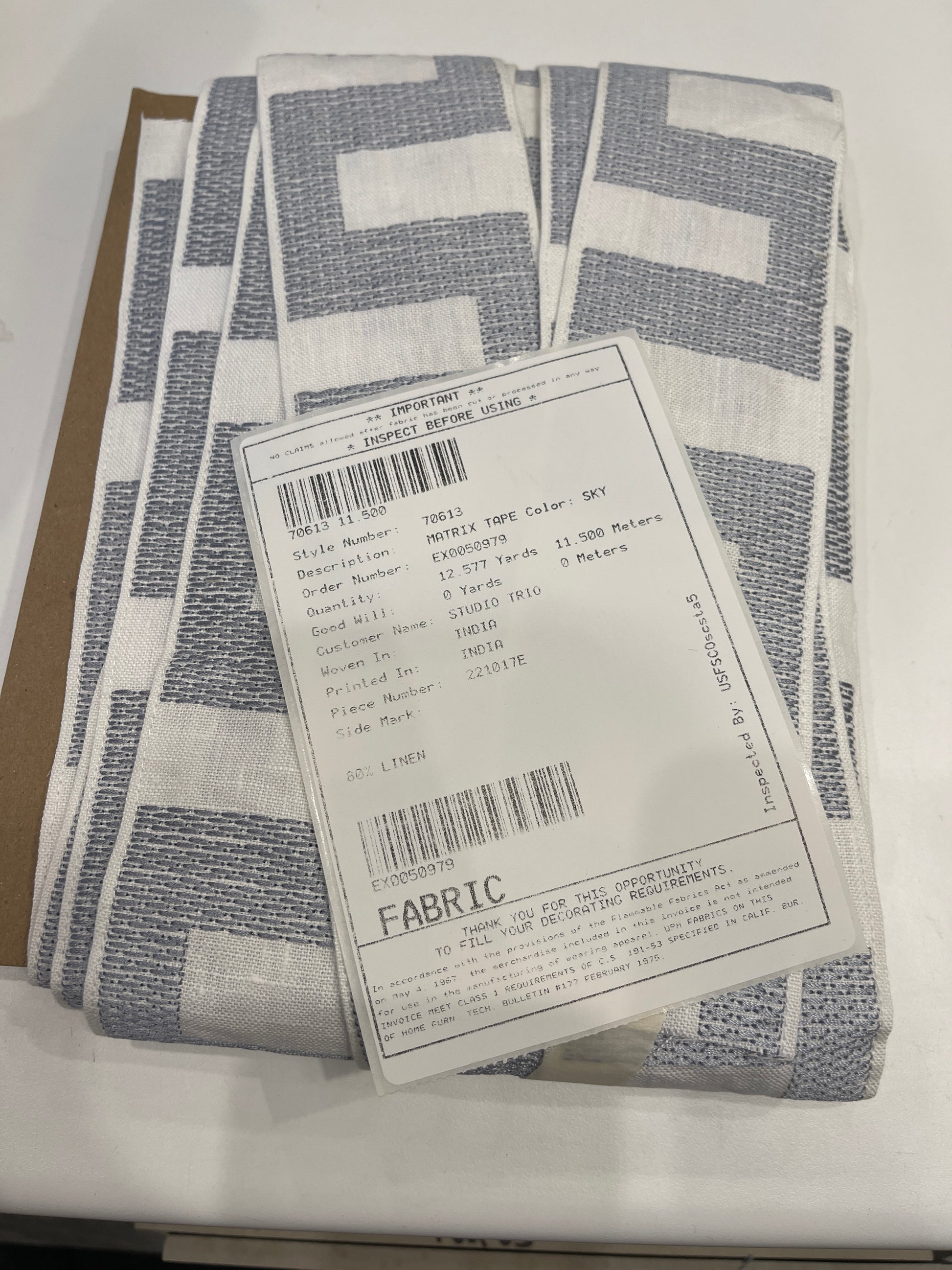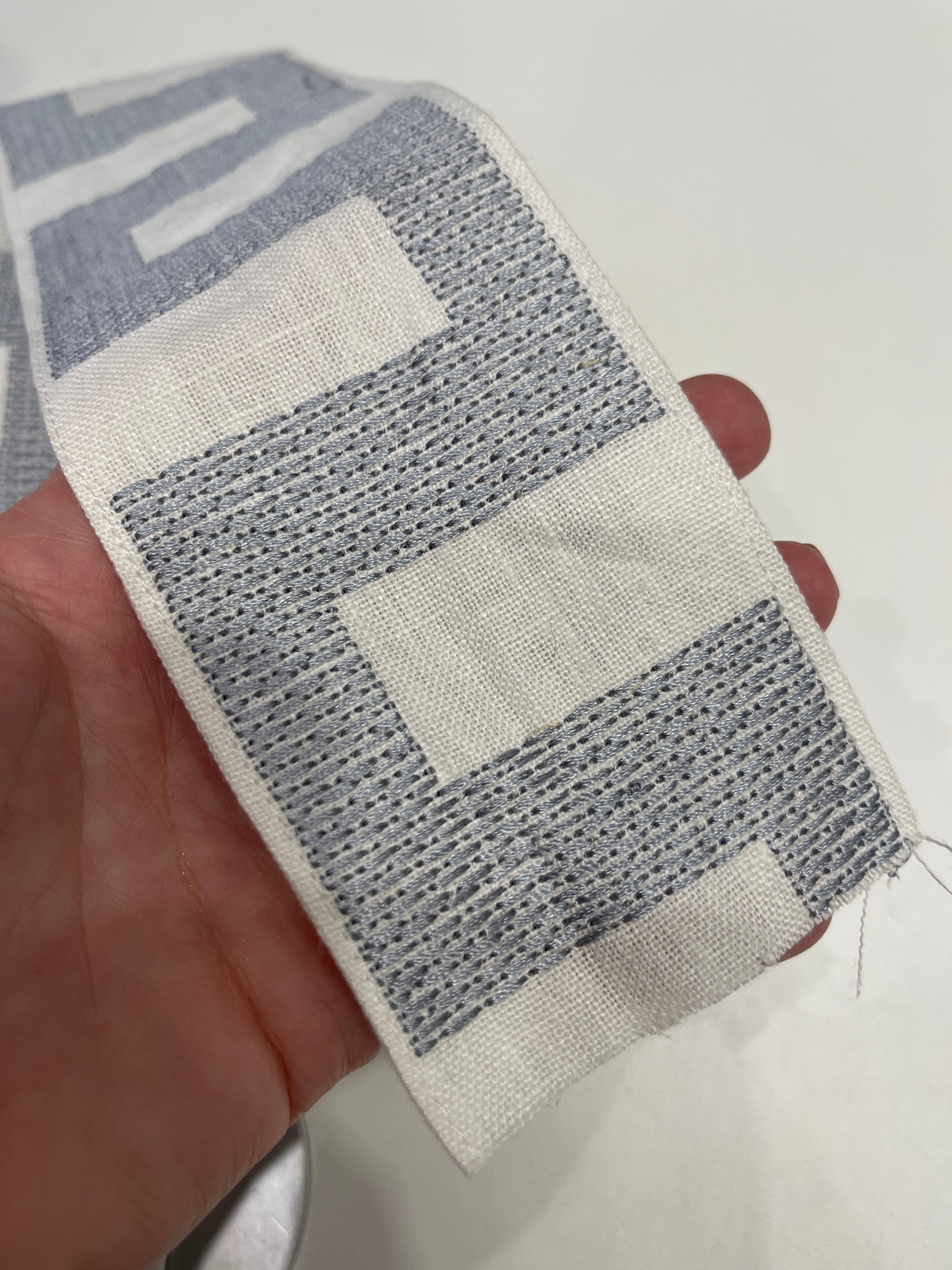 11.5m long x Schumachers Matrix tape 8cm wide, linen with embroidered thread of Navy in a geometric design. Valued at $2300