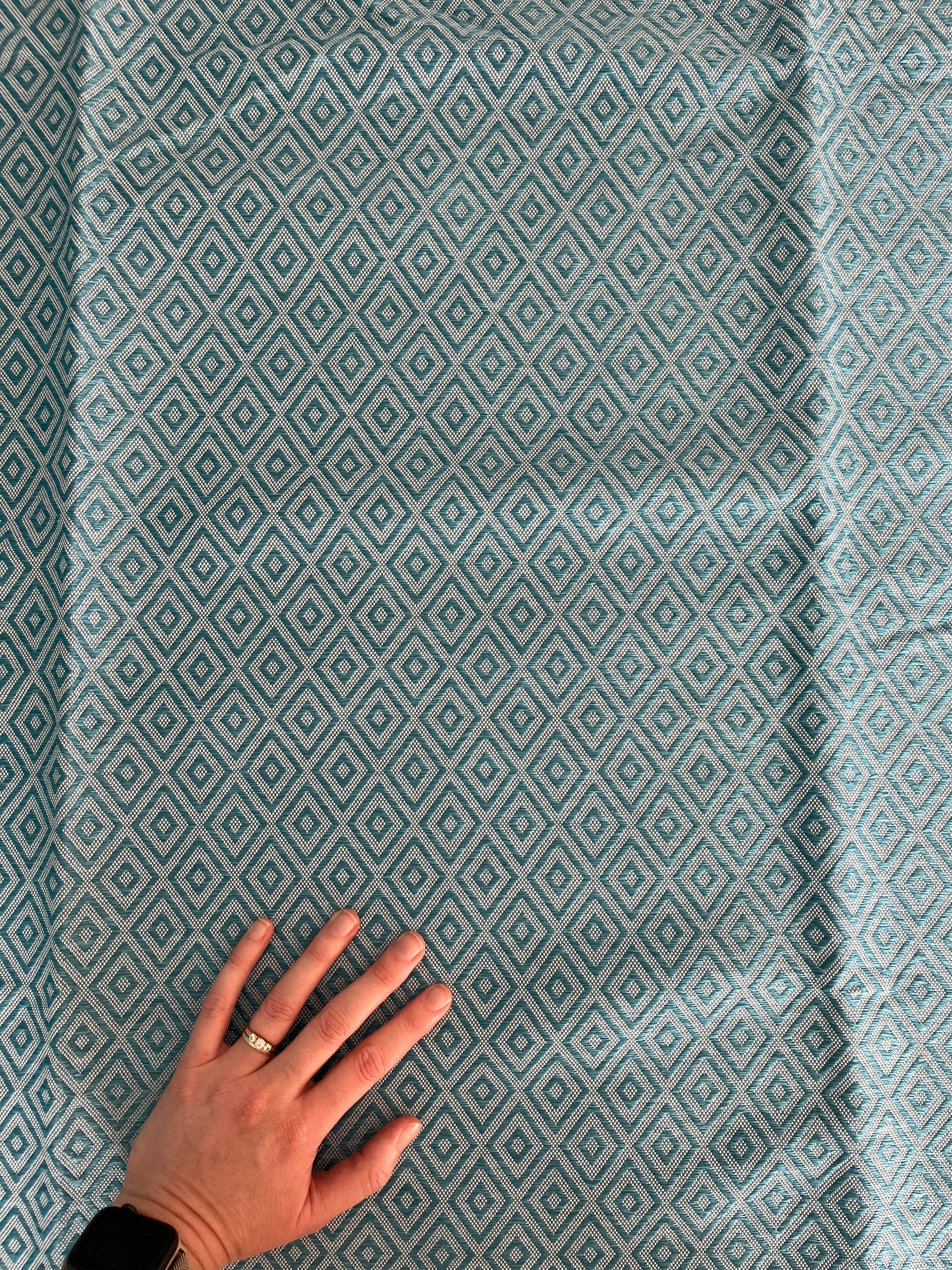 Indoor/Outdoor woven diamond geometric in Turquoise. Now discontinued. Fabulous to make cushions, lampshades or an upholstery project