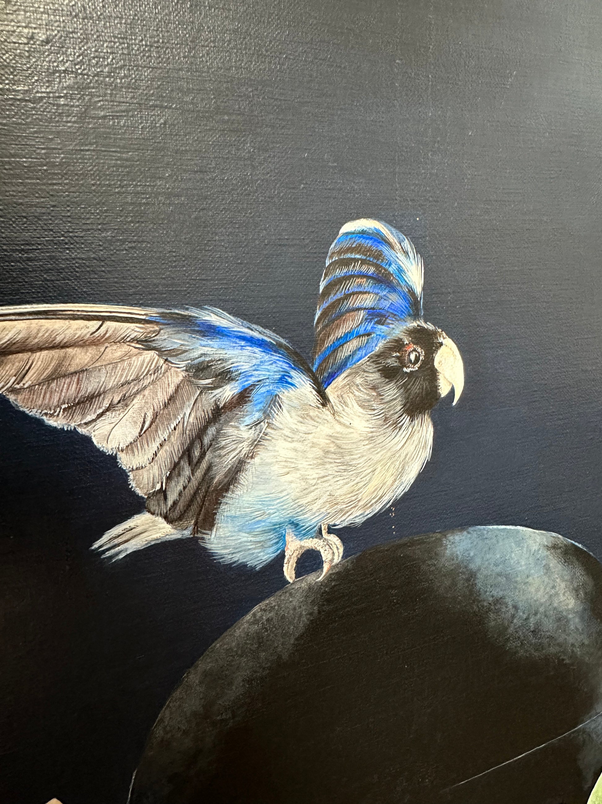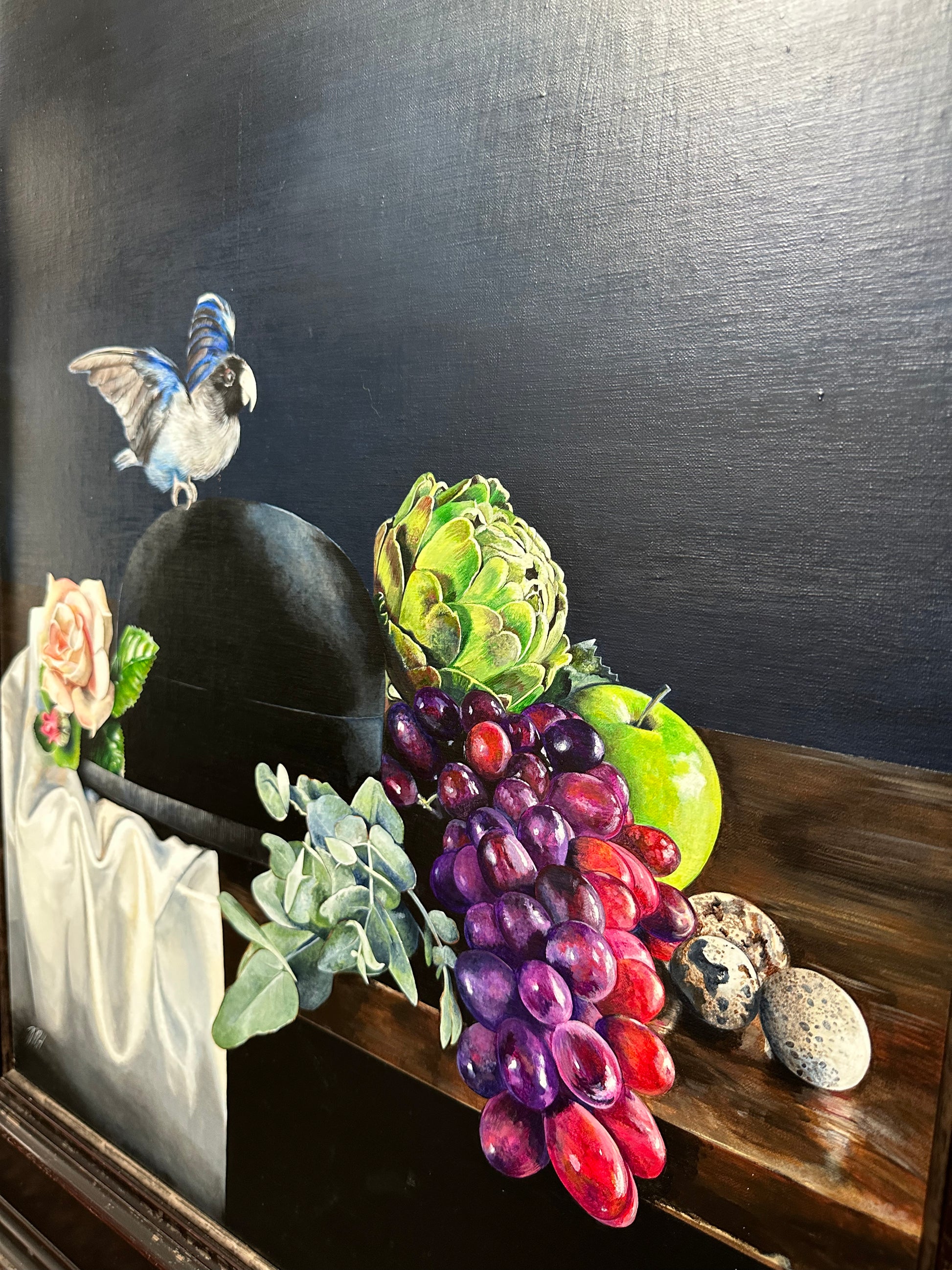 Australian Artist Melissa Hartley. One-off commission for previous home. Still Life Collection "Heart and Soul" acrylic on linen painting custom framed in an Italian walnut frame. Composition: Gentleman's hat, artichoke, grapes, rose, blue bird on walnut table. Intricate and stunning detail. Commission piece bought for $4000