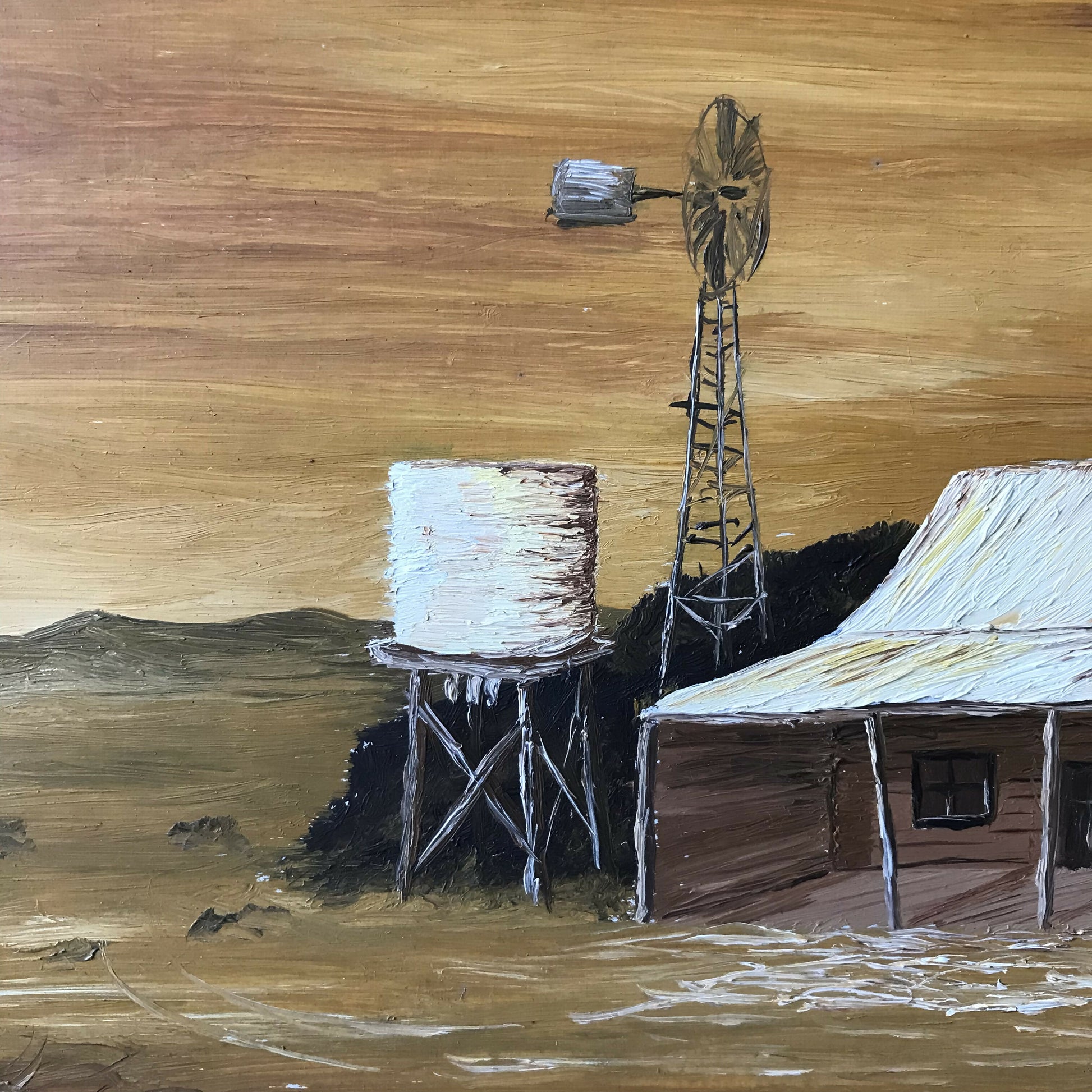 Uniquely Australian, this original work by Alan Melbourne evokes images of bush sunsets and dusty tracks. Dated 1975 and styled in the manner of Russell Drysdale, the work measures 42.5cm x 52.5cm