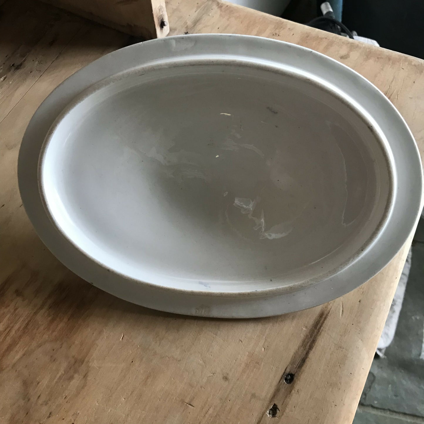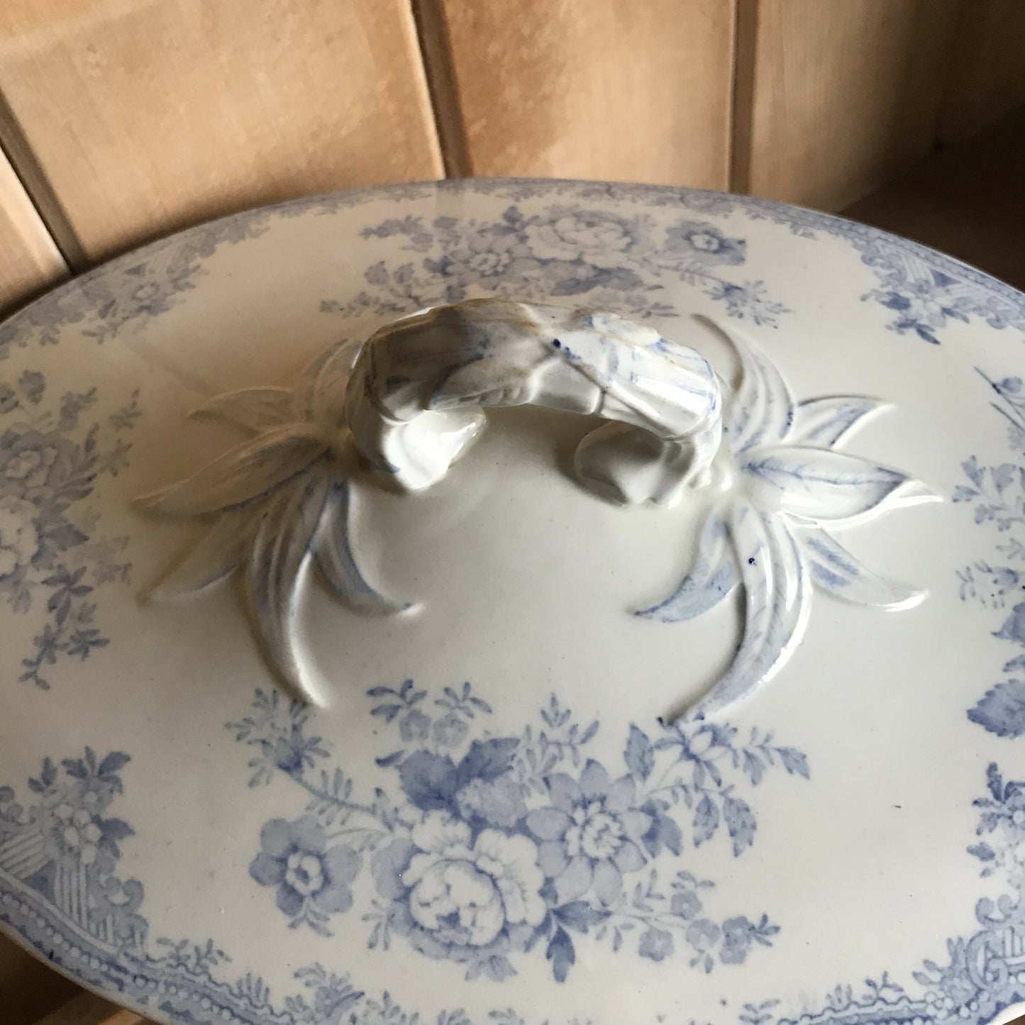 Lovely oval transferware covered dish measuring 28cm x 17cm x 15cm to the top of the lid handle. It is missing one of the handles, but does have an intact lid with a very pretty handle. The base has quite a lot of staining, and one crack near the missing handle.It is quite a rare find.