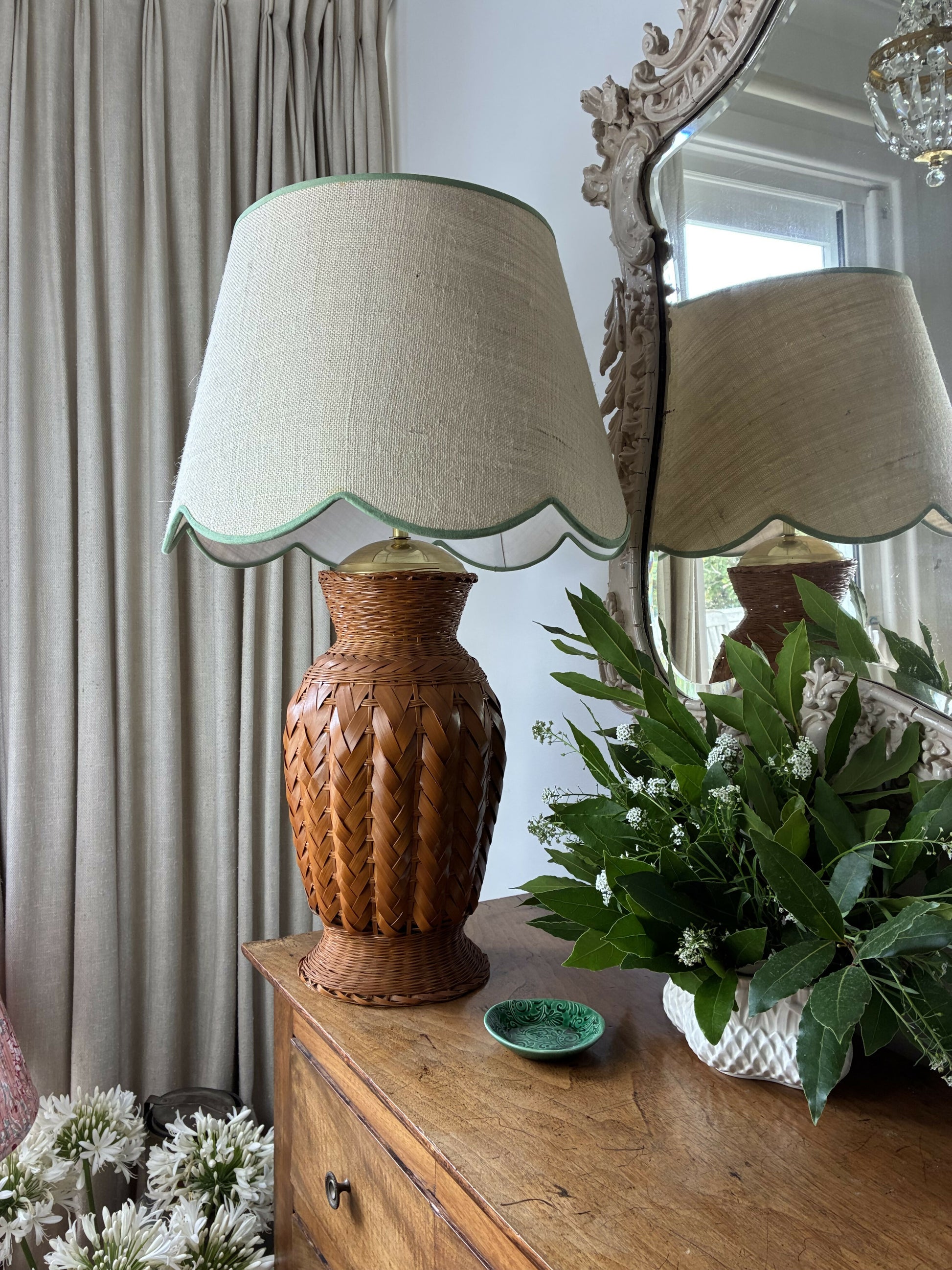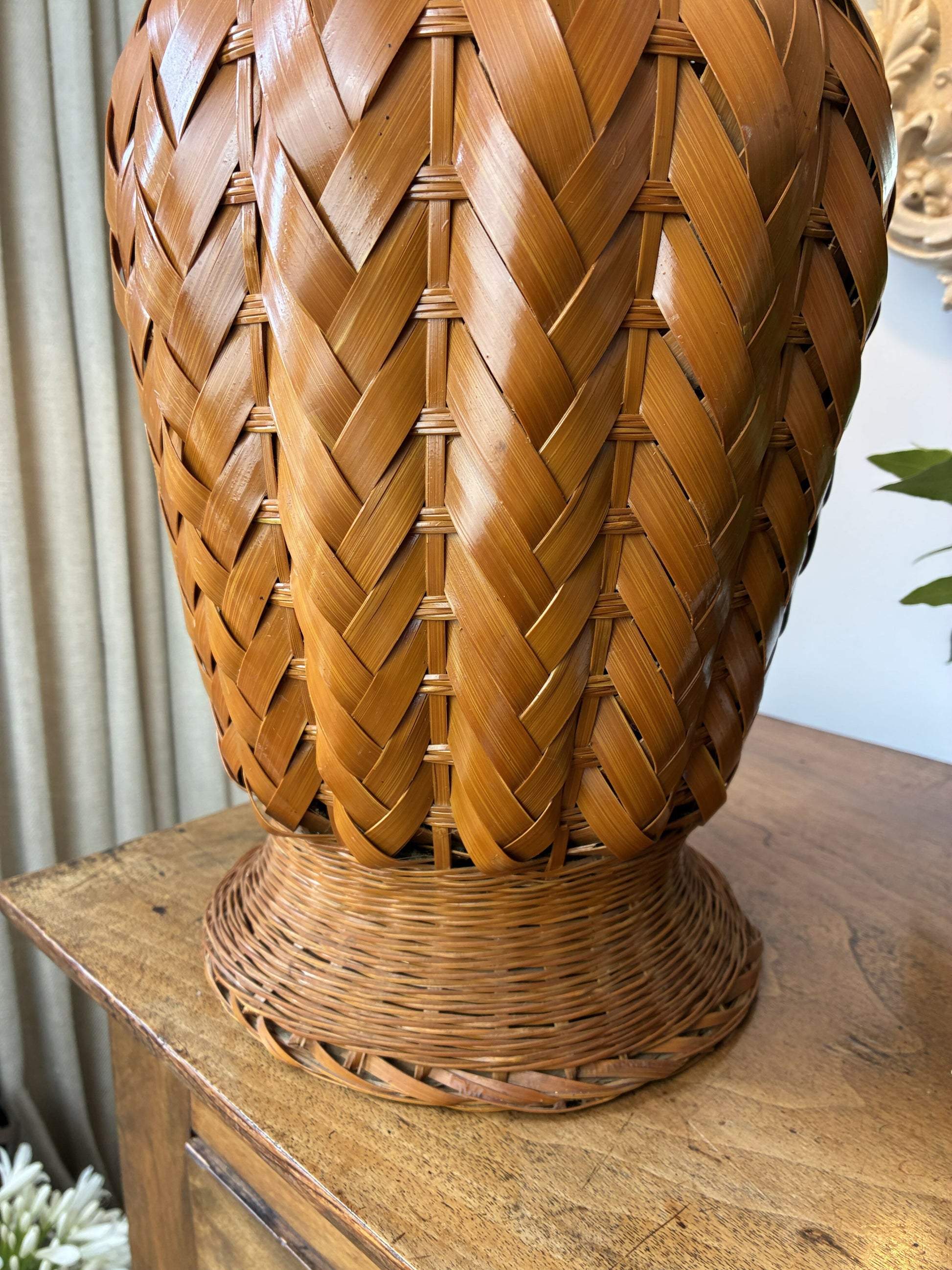 This one off vintage cane base is fabulous! Quite large, it stands 53cm tall to the top of the brass bayonet fitting. The weighted base has a 19cm diameter. It has an in line switch.
