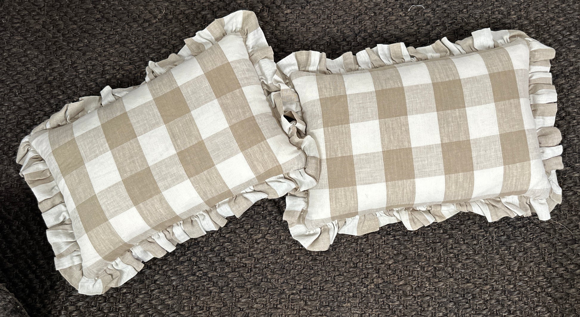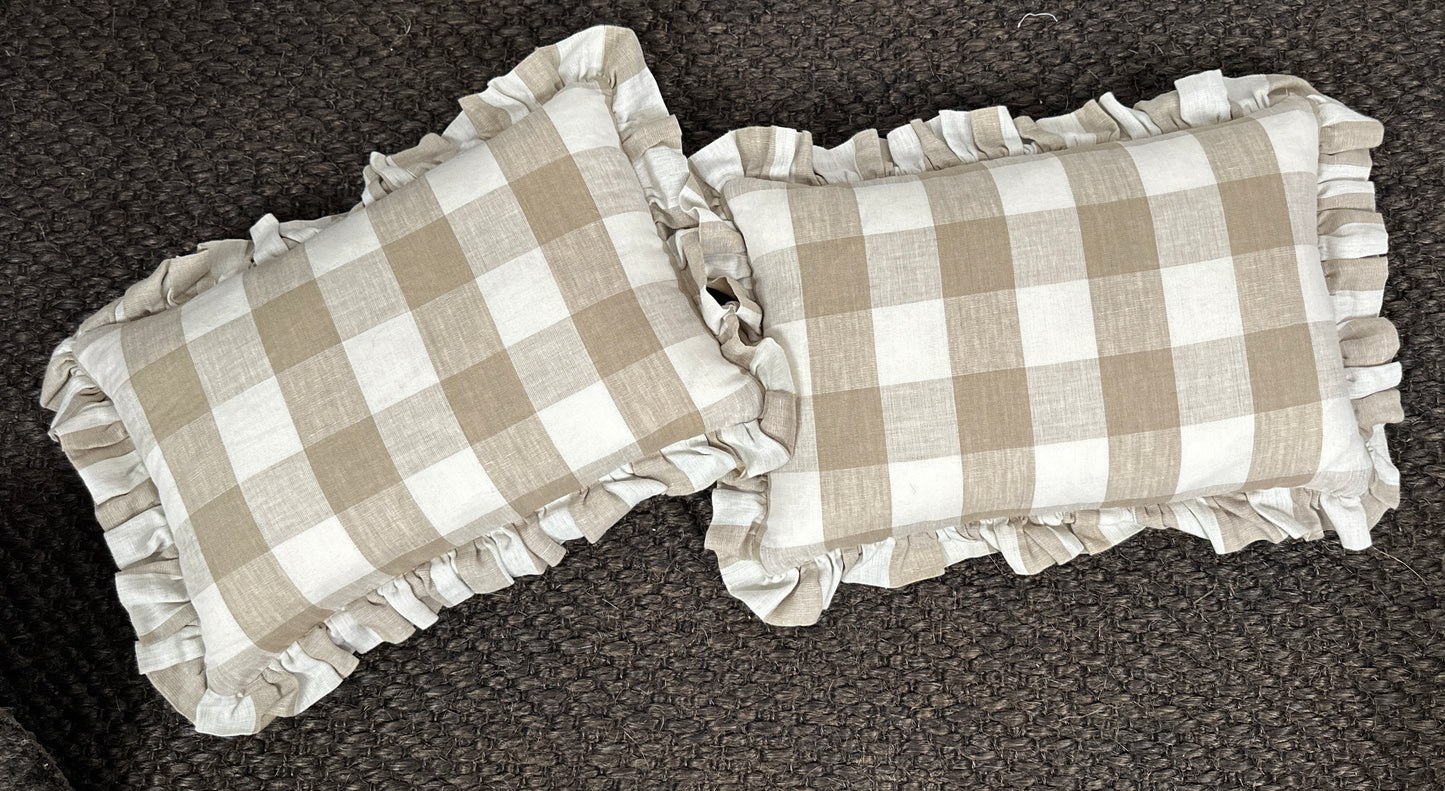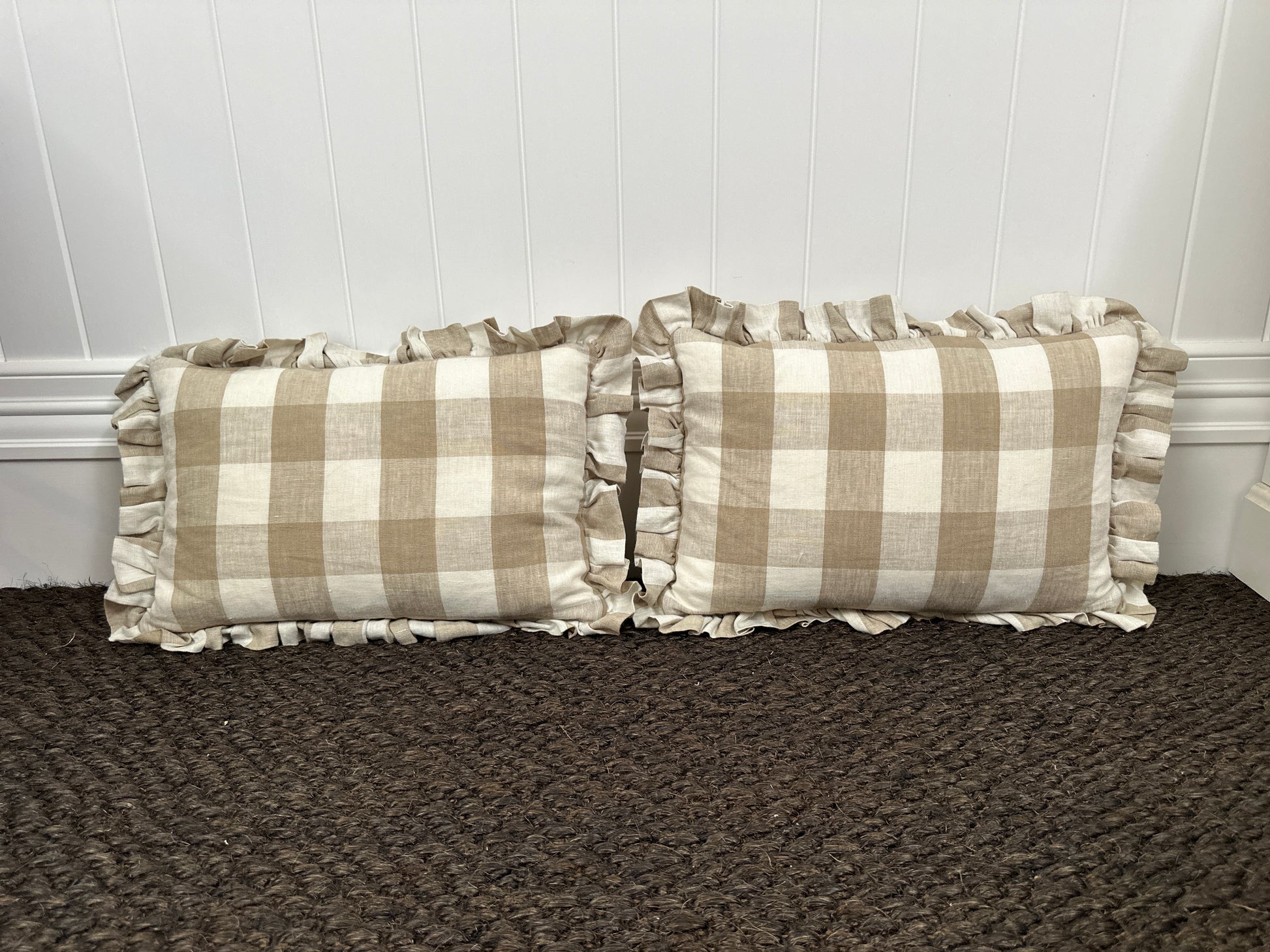 Pair of custom made ruffle rectangle cushions in Schumacher fabric which is a large gingham linen fabric in Beige/White. Inserts sold separately. Sold as the set