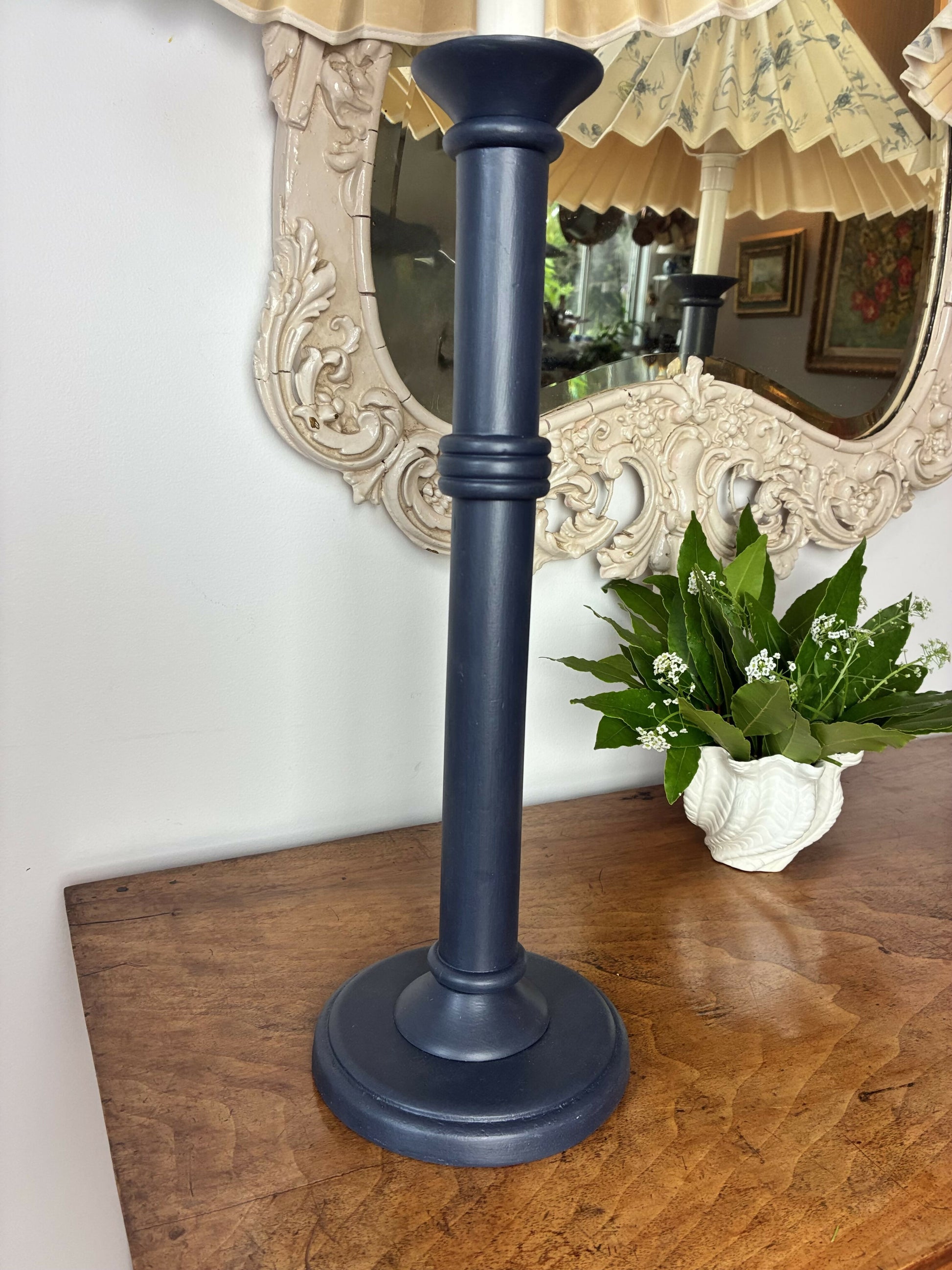 Sold as a pair, this pair of lampbases have been painted a midnight blue. The shades are in original condition, made by Biggie Best in the 90’s. If you are after new shades, then these are not for you, as there are small areas of spotting (see photos) That said, the fabric is divine!