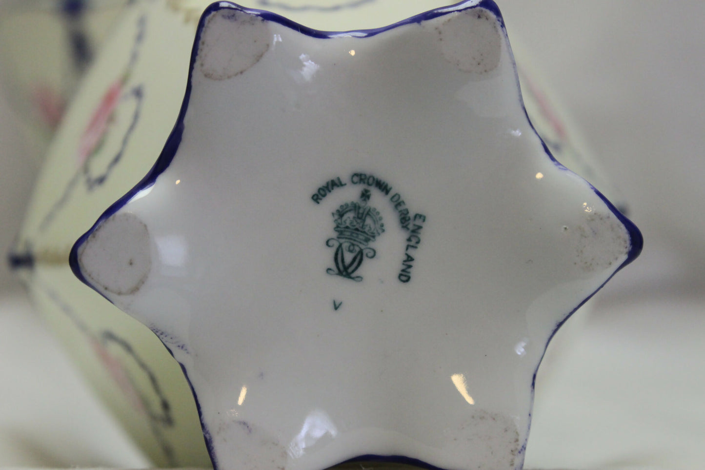 This delightful pair of six sided Royal Crown Derby porcelain vases feature hand painted roses and swags on a pale yellow ground, with the mounts between the panels picked out in blue. The panels are separated with gilding and there is more gilding to the top. They stand 100 mm (4 inches) high and measure 102 mm (4 inches) across. Their condition is very good. One vase has a faint scratch, there is some very minor loss of gilding to the rim and there is a very small piece of the rim that has been damaged but gilded over, possibly ex factory. The date letter is for 1904.