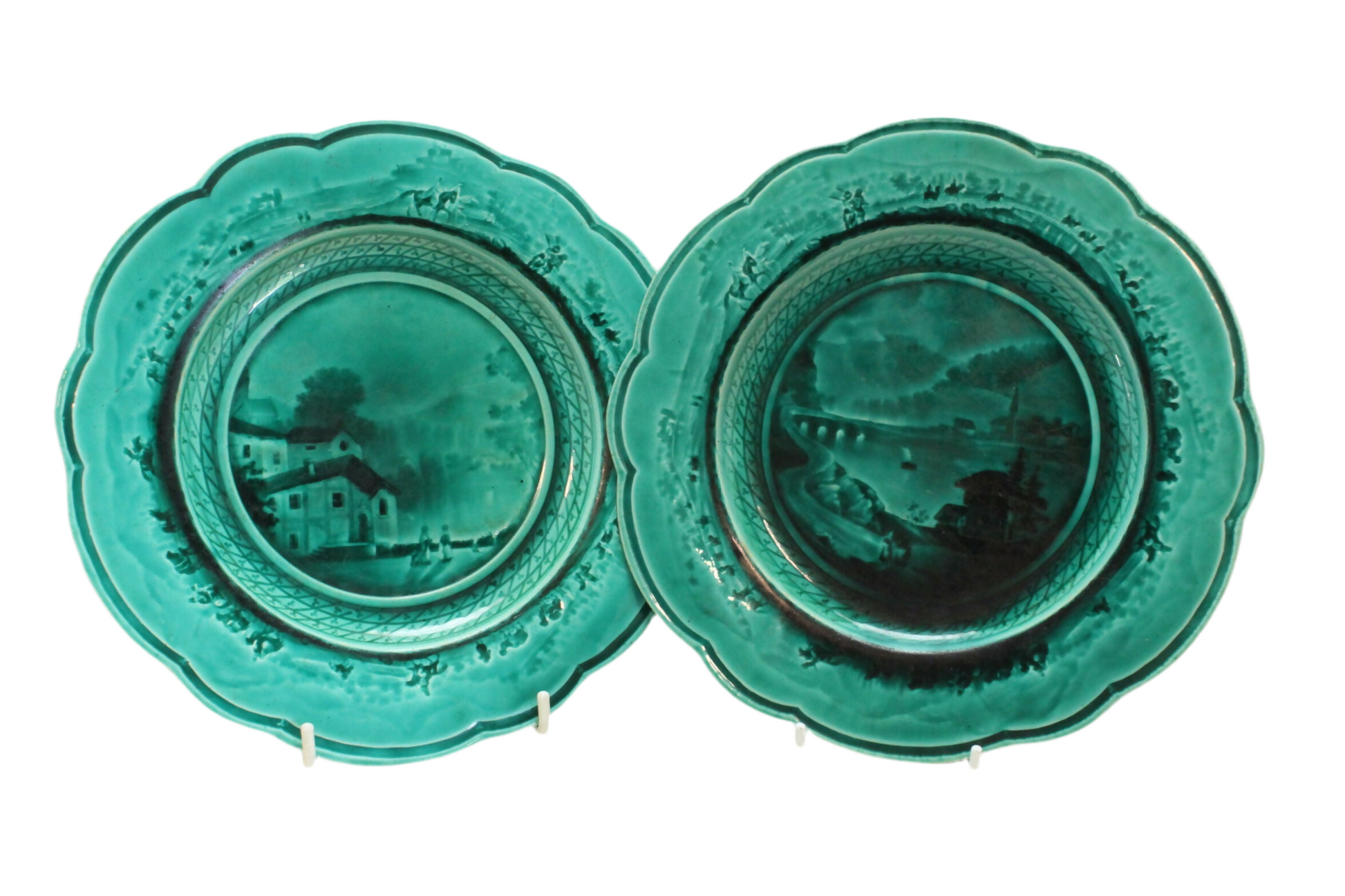 The decoration on this pair of Email Ombrant majolica dessert plates from the Rubelles factory is achieved using graduated intaglio designs that are then flooded with the glaze to give form to the design. In some ways it is similar to the technique to create lithophanes. Around each rim are scenes of riders on horseback and camel trains with delicate backgrounds of castles, a ship at sea and forests. The centre decorations are different scenes of European lakes and lakeside buildings. The patent for this technique was taken out in 1827 by Baron Amable, who later set up a factory in Rubelles with Baron Alexis du Tremblay whose initials appear in the mark on the base. The diameter of these plates is 210 mm (8.25 inches). A new glaze was introduced in 1852 that was later found to be easily scratched and the light scratches on the glaze to the centres indicate that these plates probably date from the period 1852-7. The factory closed in 1857.