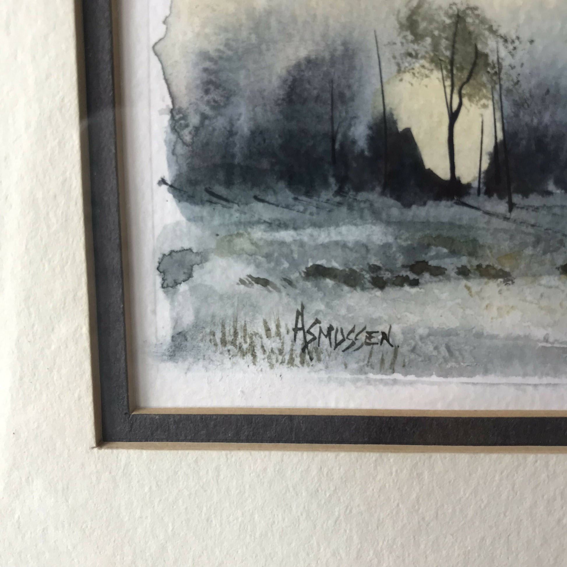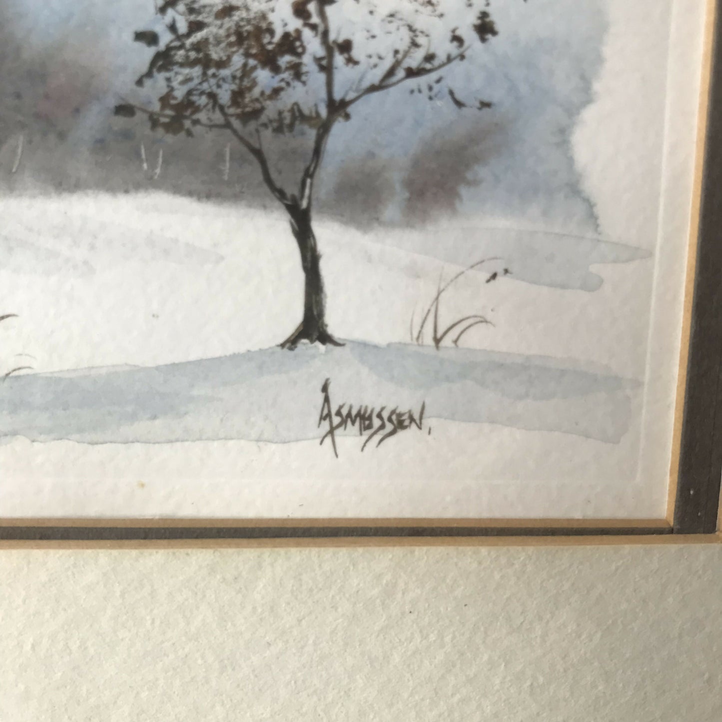 Sweet little pair of vintage watercolours, one of a snowy scene, the other depicts crops, perhaps rows of grapevines? In both, the colours are still bright. The “snowy scene” has a faint watermark on the lower edge of the mount board.