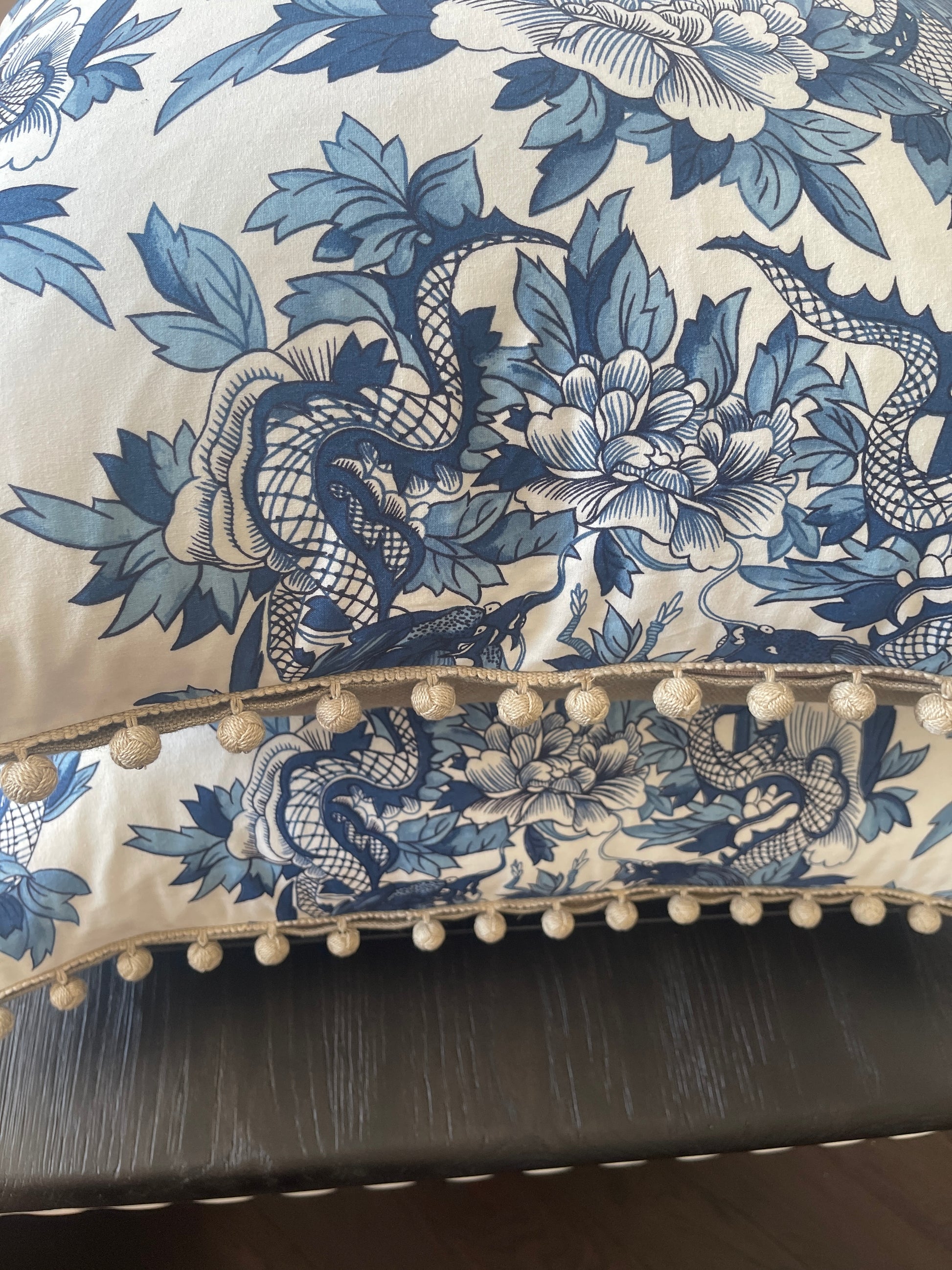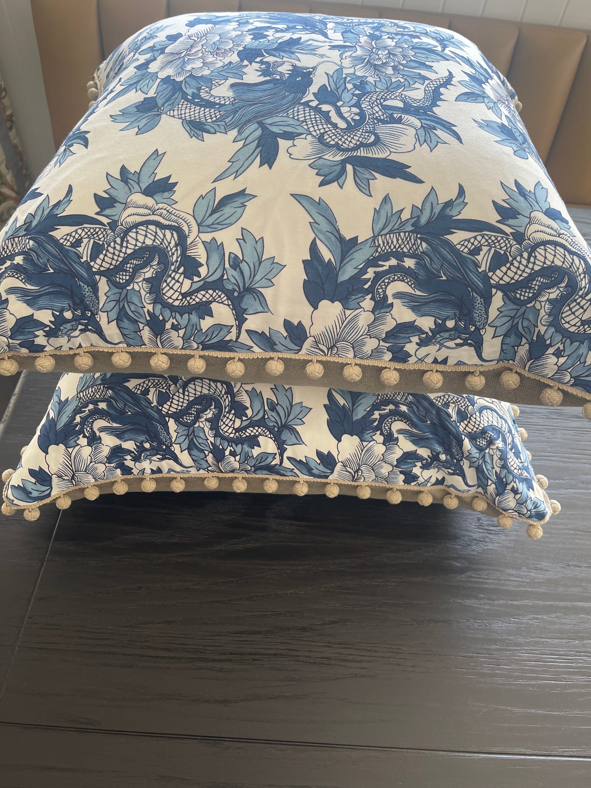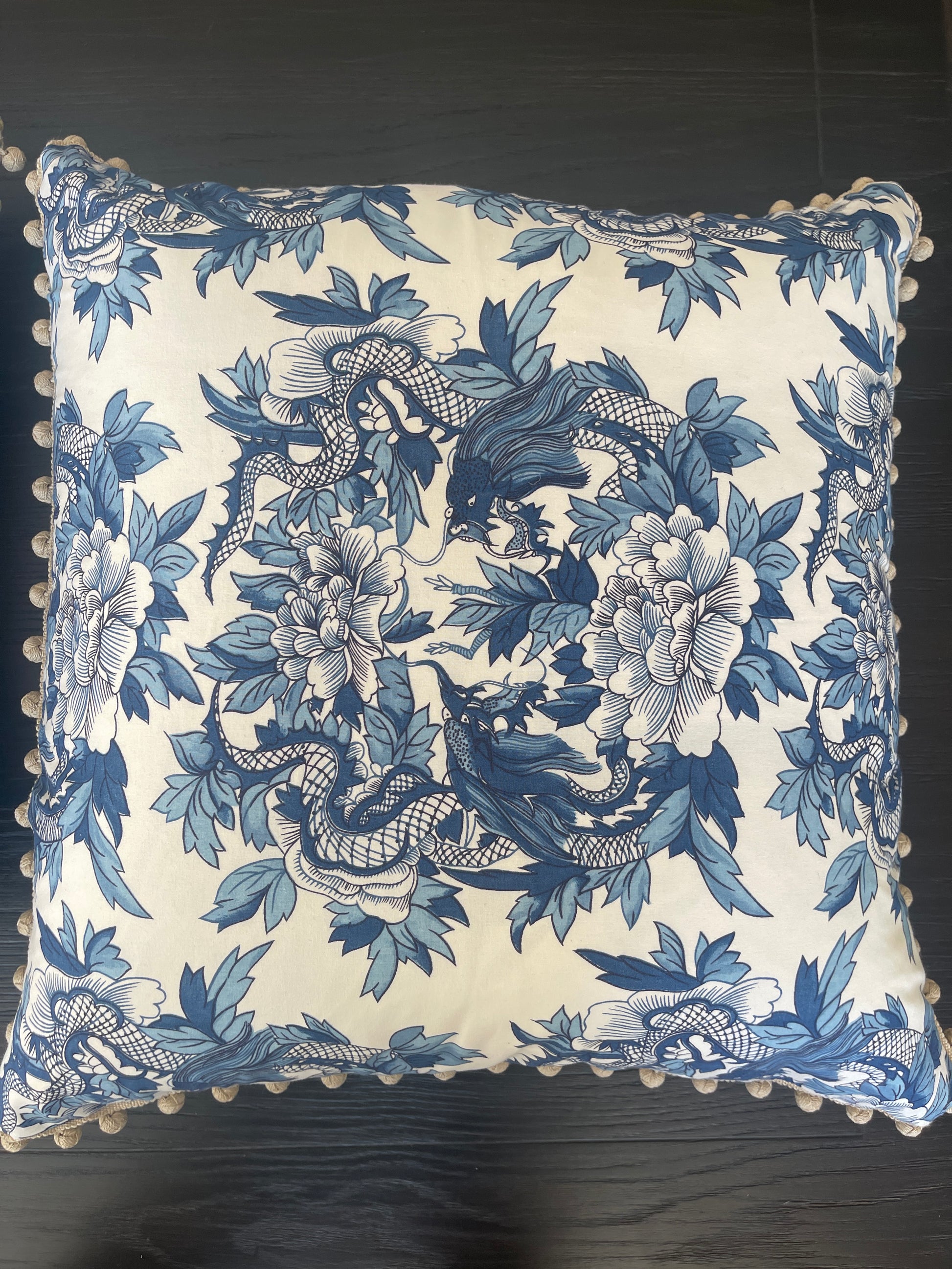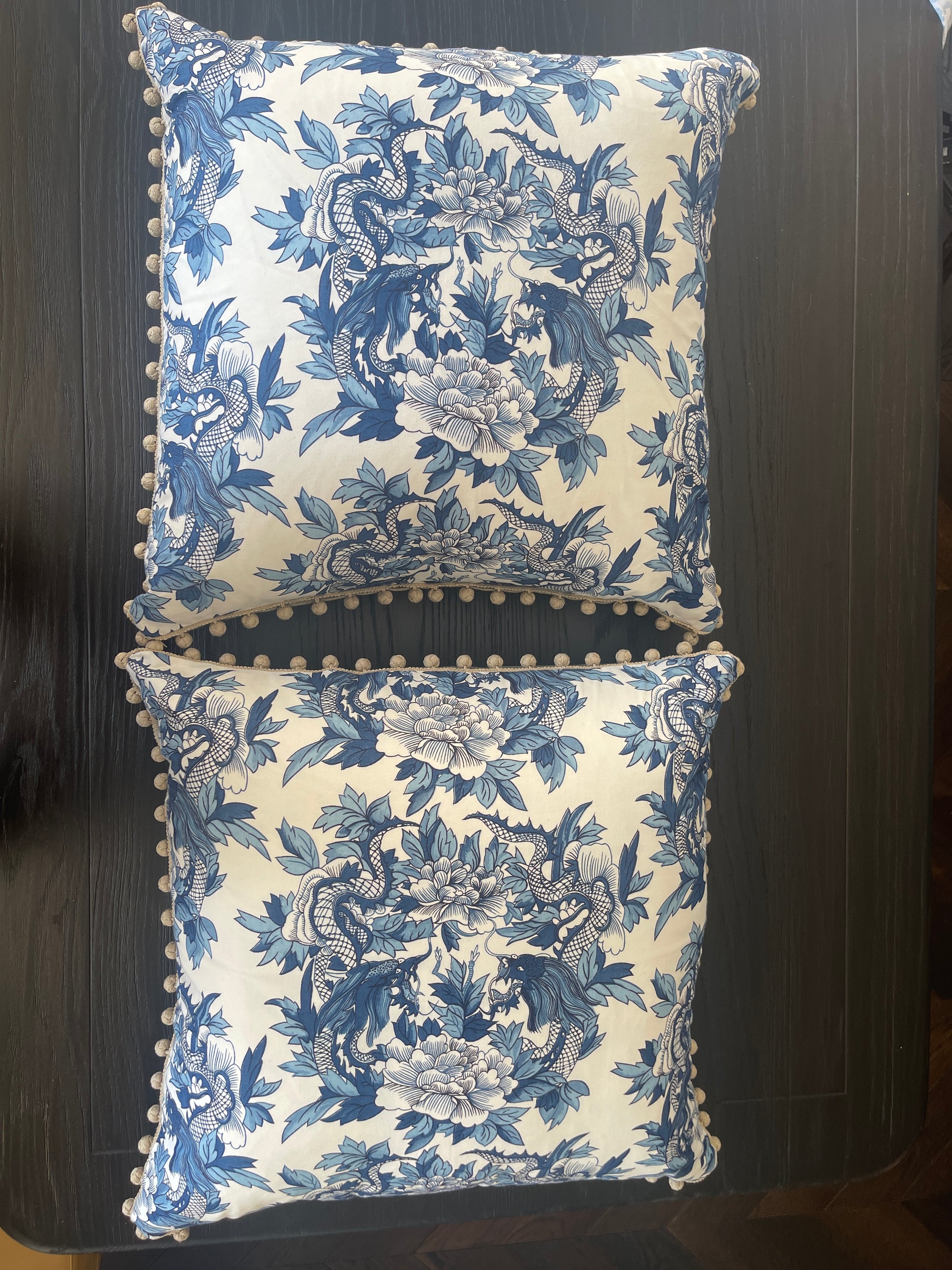 Pair of gorgeous Ralph Lauren "Nanking Ming Blue" cotton percale cushions with plain 100% linen backing. 65cm x 65cm square. Beautiful feature pillows for a bedroom. Edges in Schumacher linen bobble fringe. Feather inserts included.