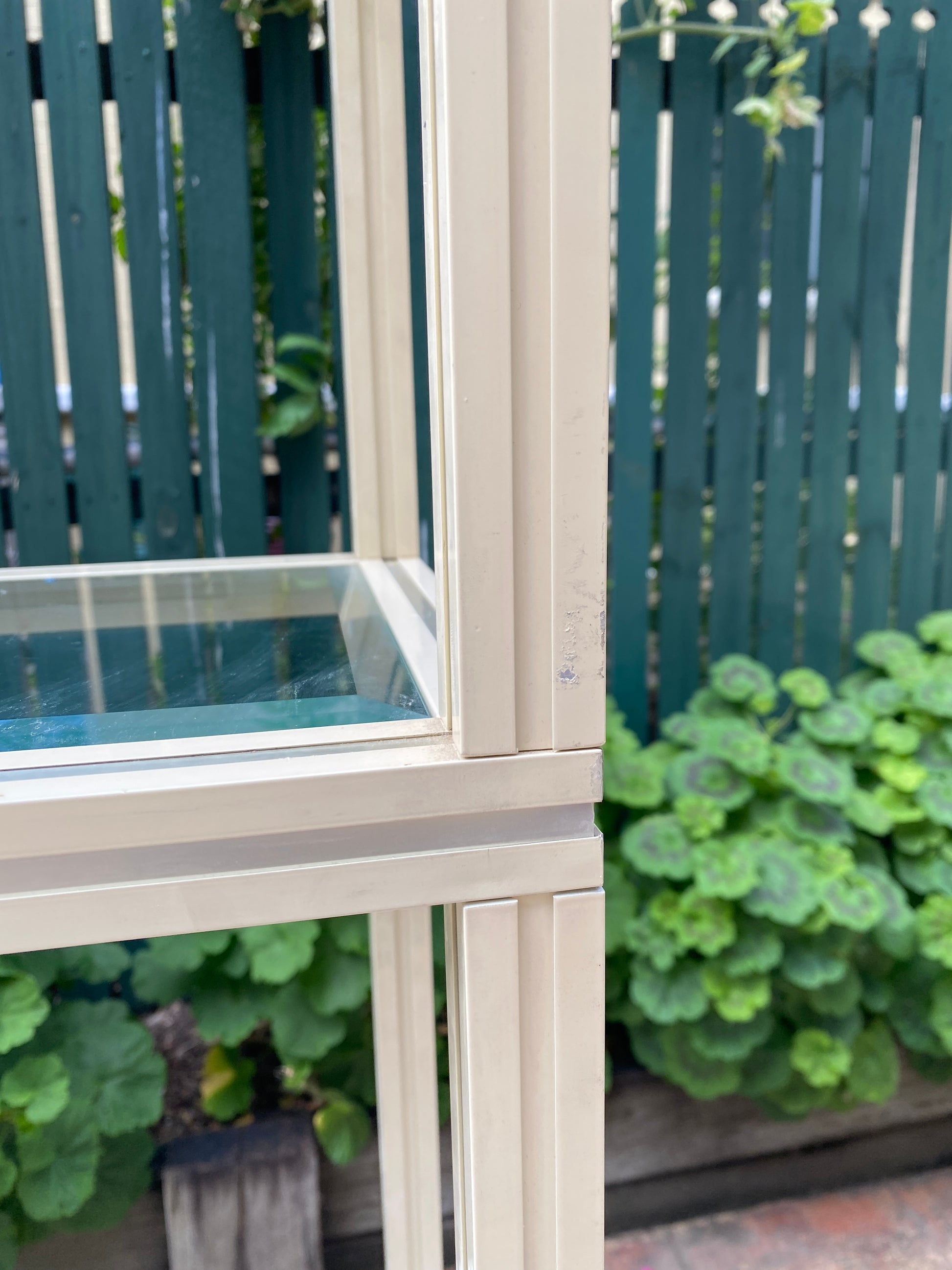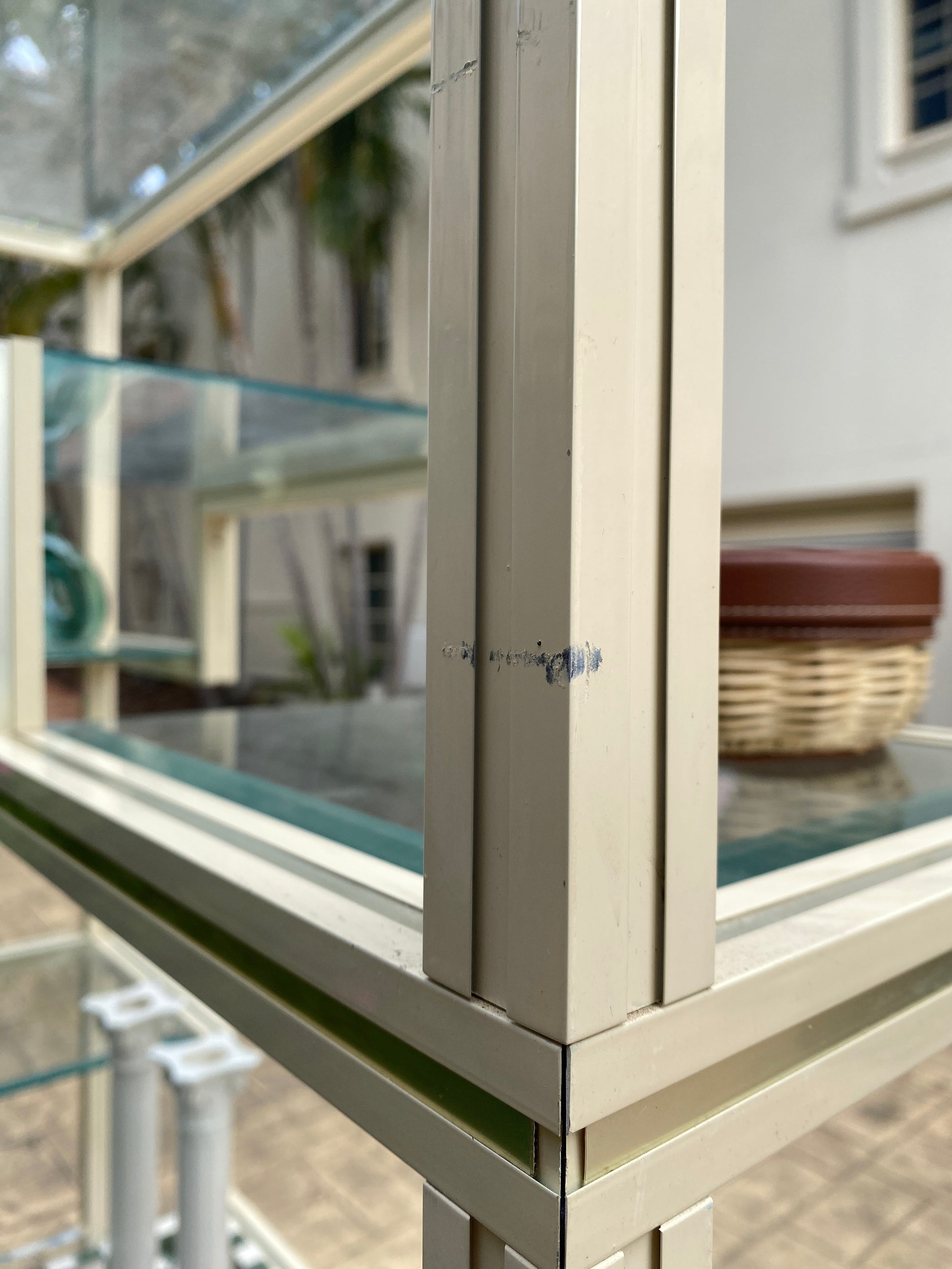 In good condition for its age, does have some scratches to paint. All glass is intact and does come out for easy transport.