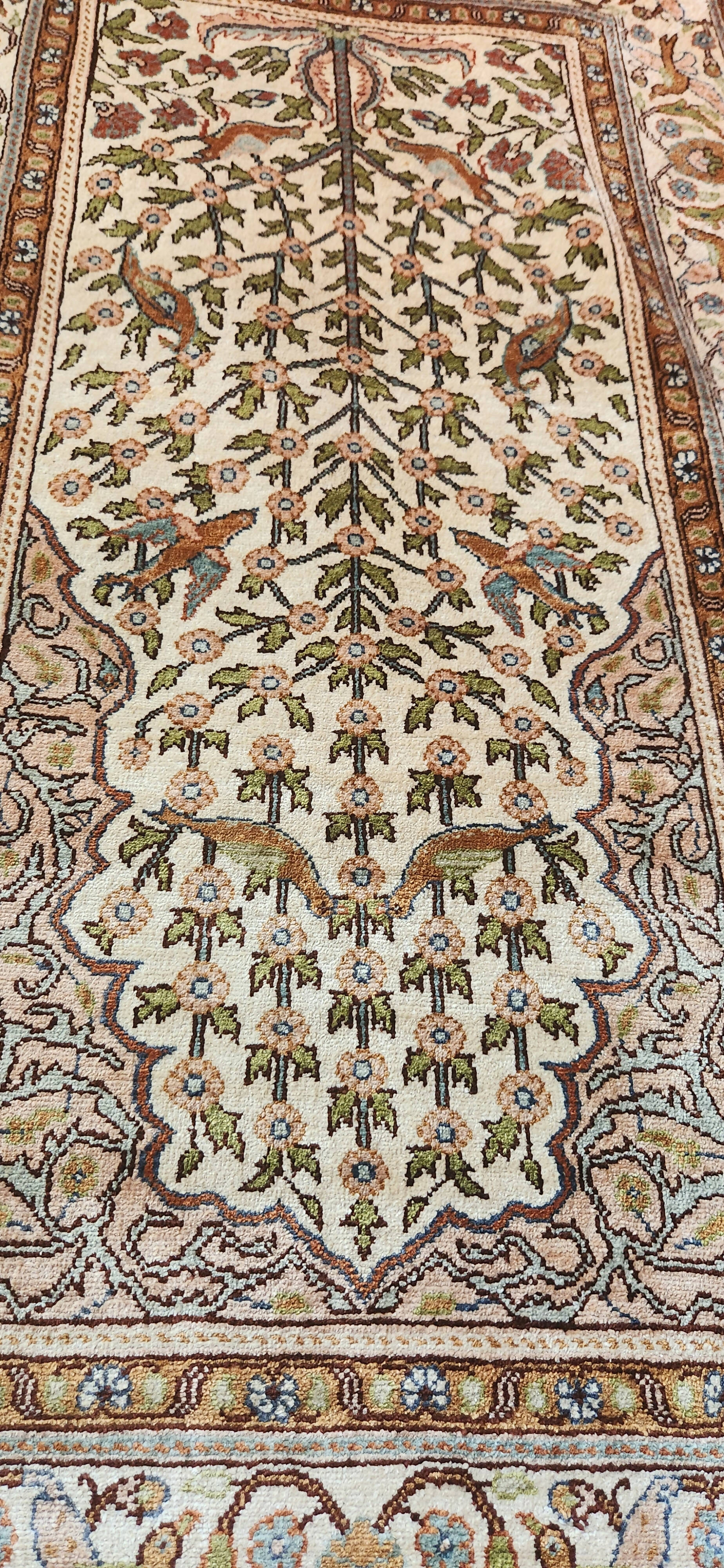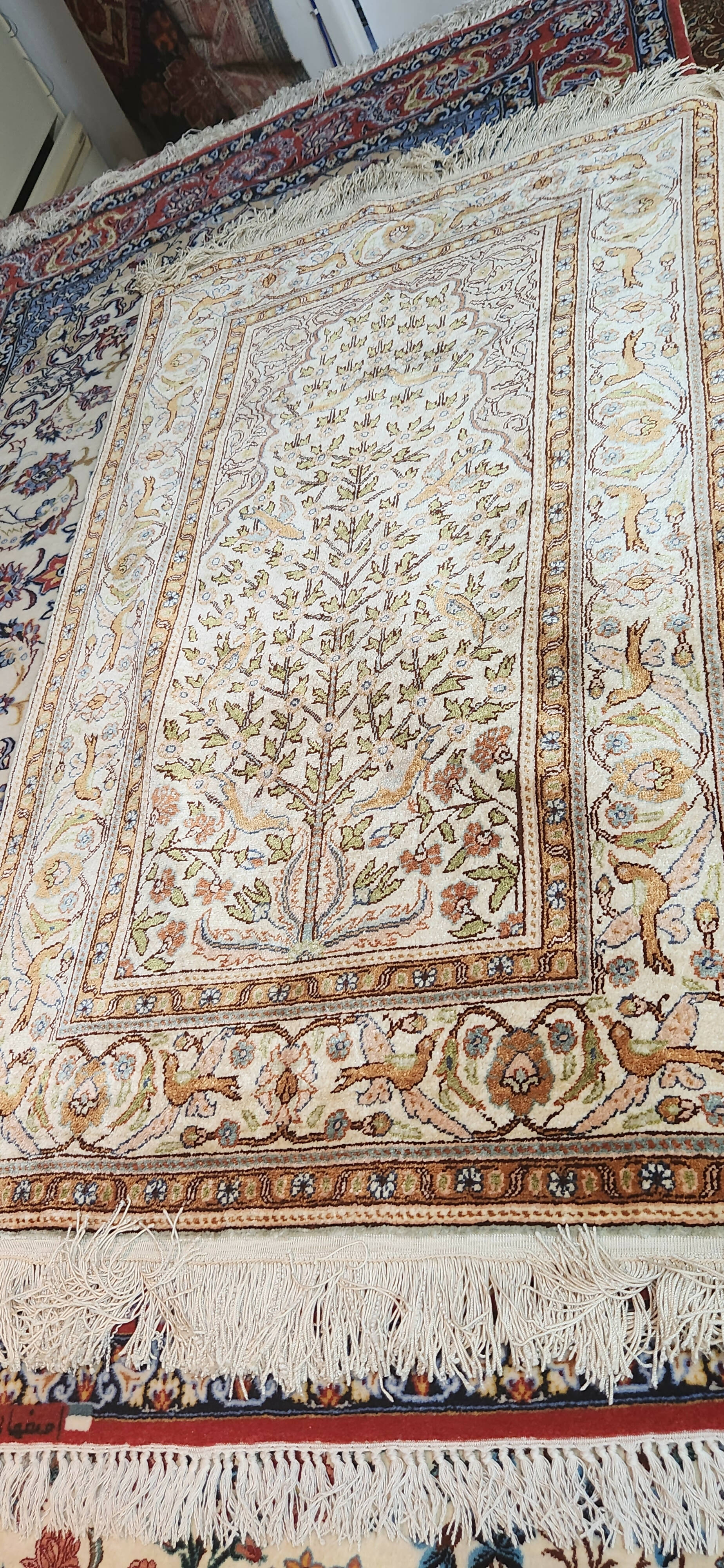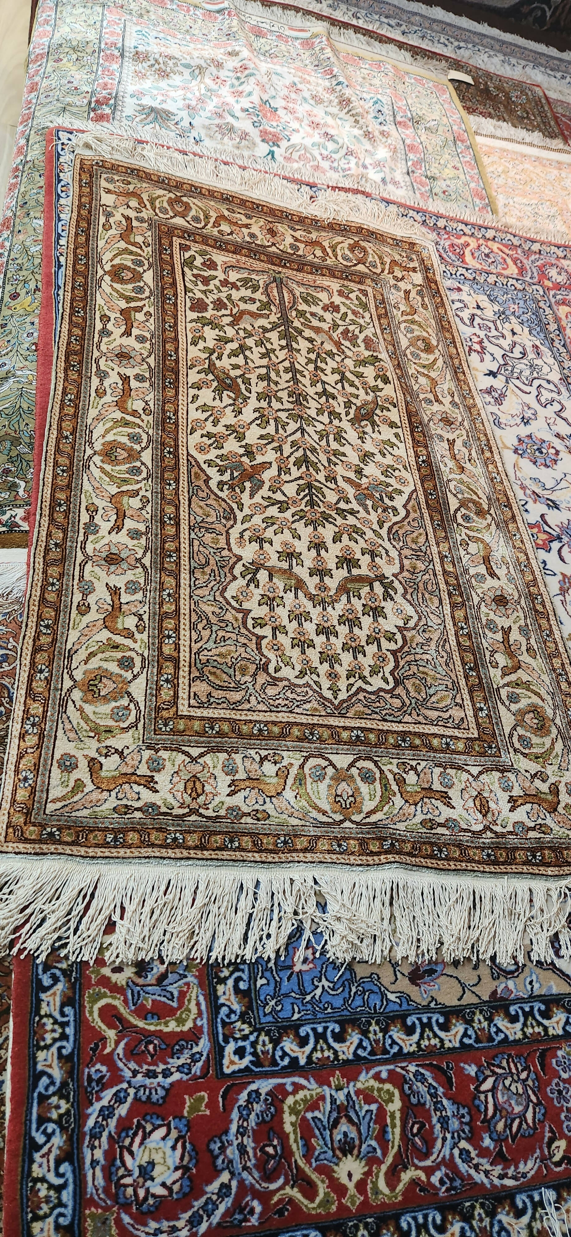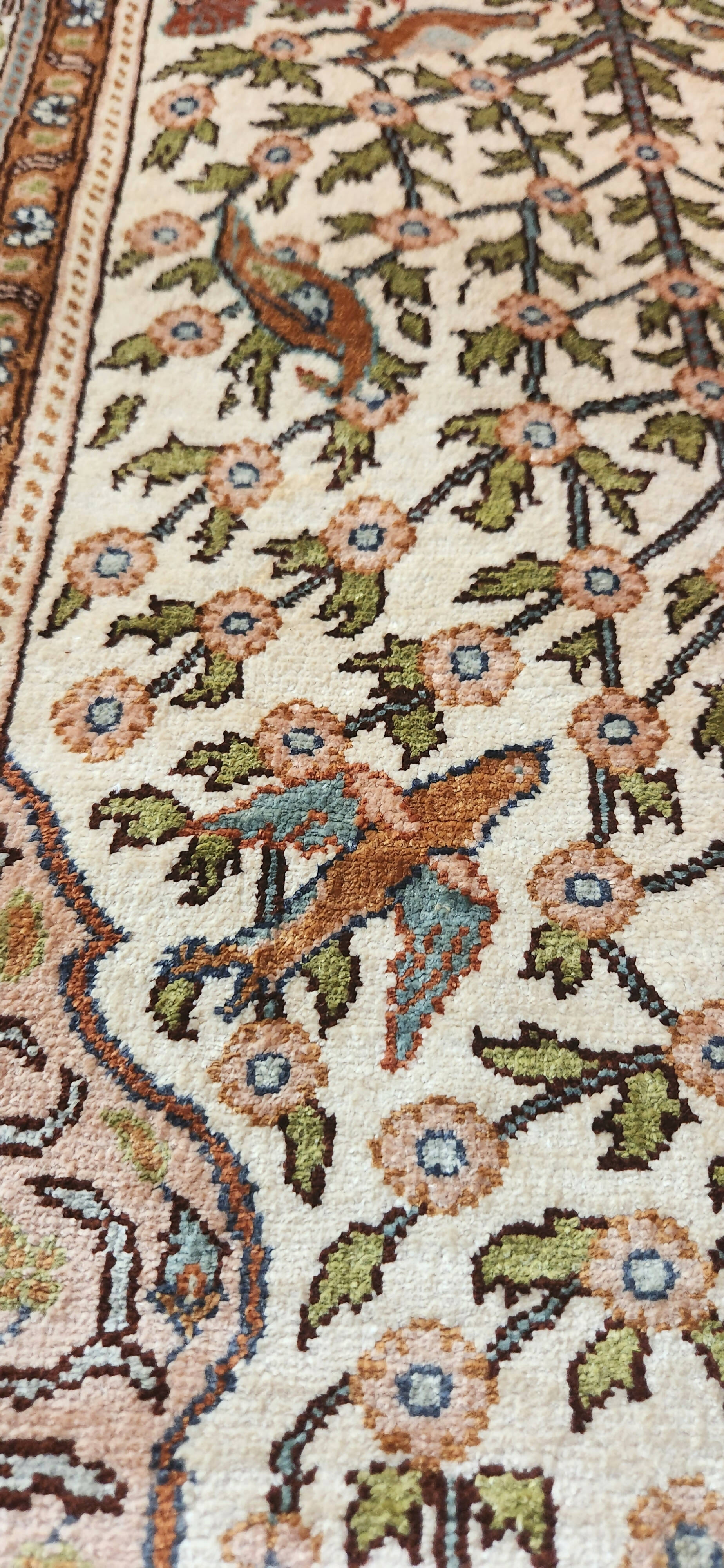 A fine 100% pure silk handmade carpet with a cream base and pastel greens, browns, baby blues.