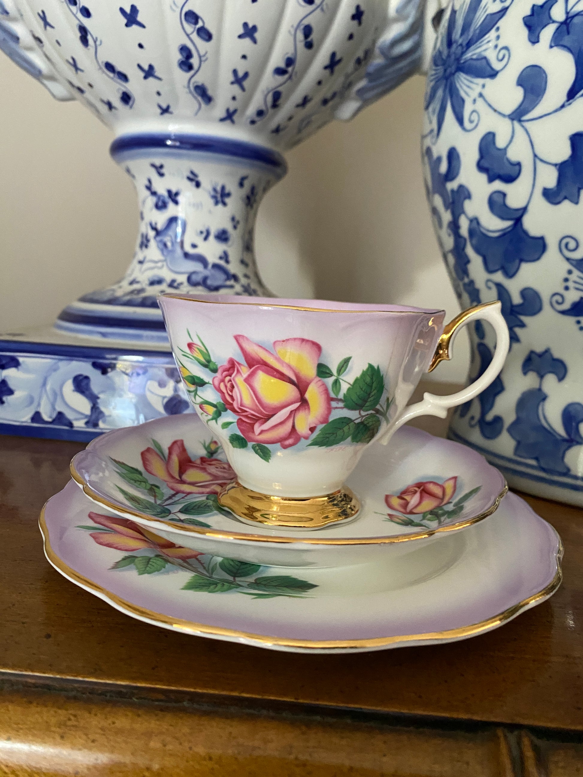 Measures: Teacup: 9cm w x 7cm h, saucer: 14cm w, plate: 16cm w