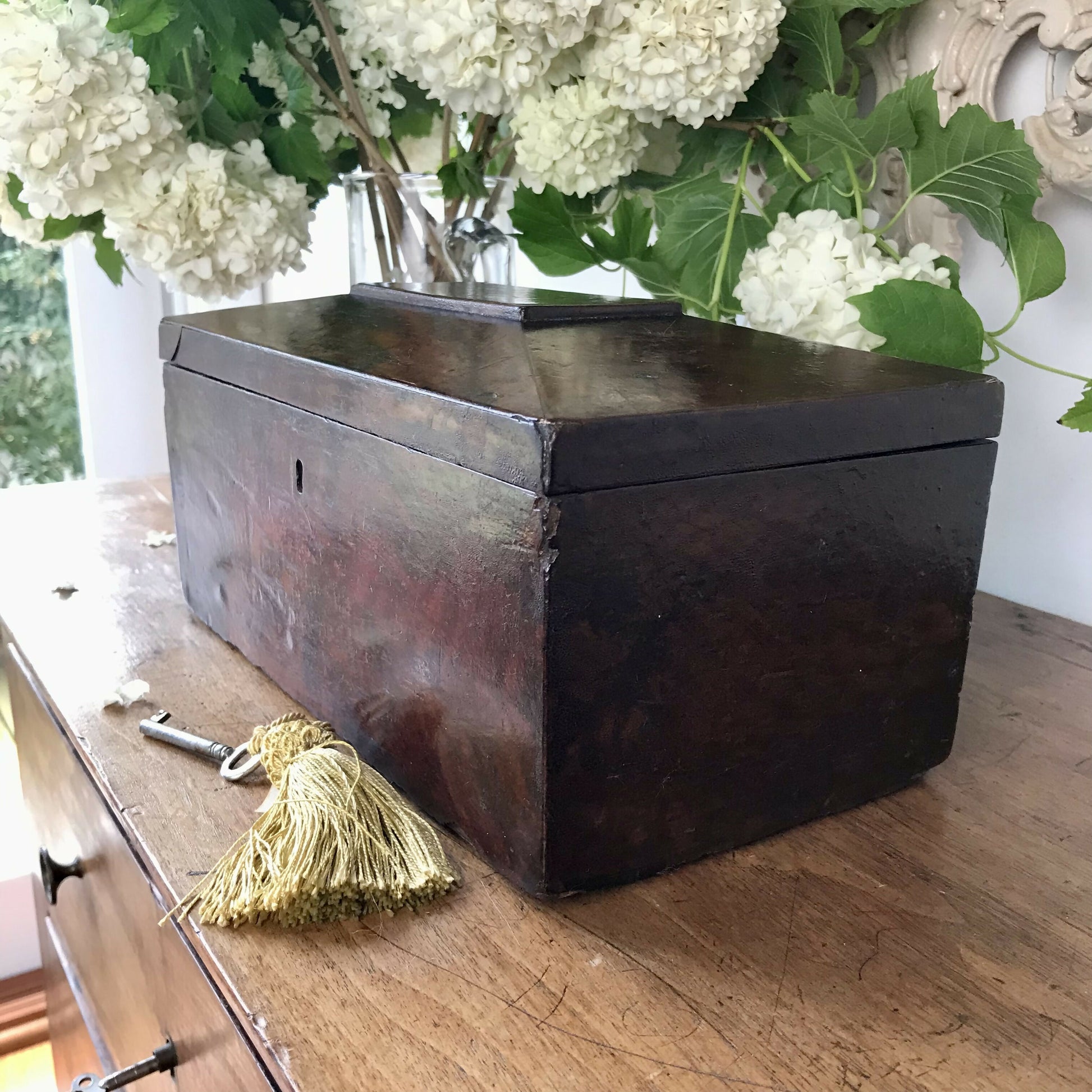 This beautiful old regency box might be just the thing for your hall table, or, perhaps a jewellery or sewing box. The original tea caddy divisions and feet have long since gone, but it does still have it’s original key! Some damage to mahogany veneer.