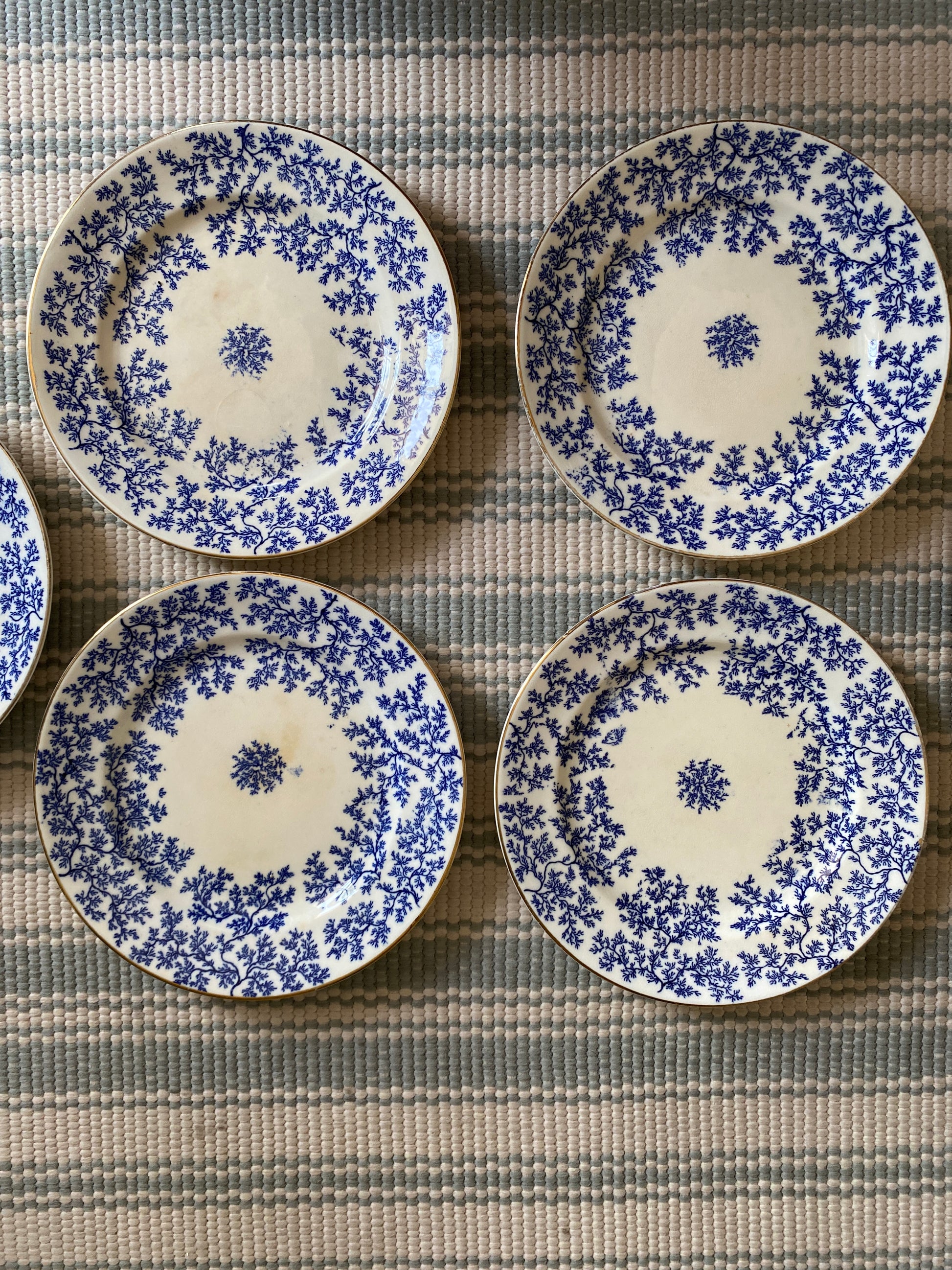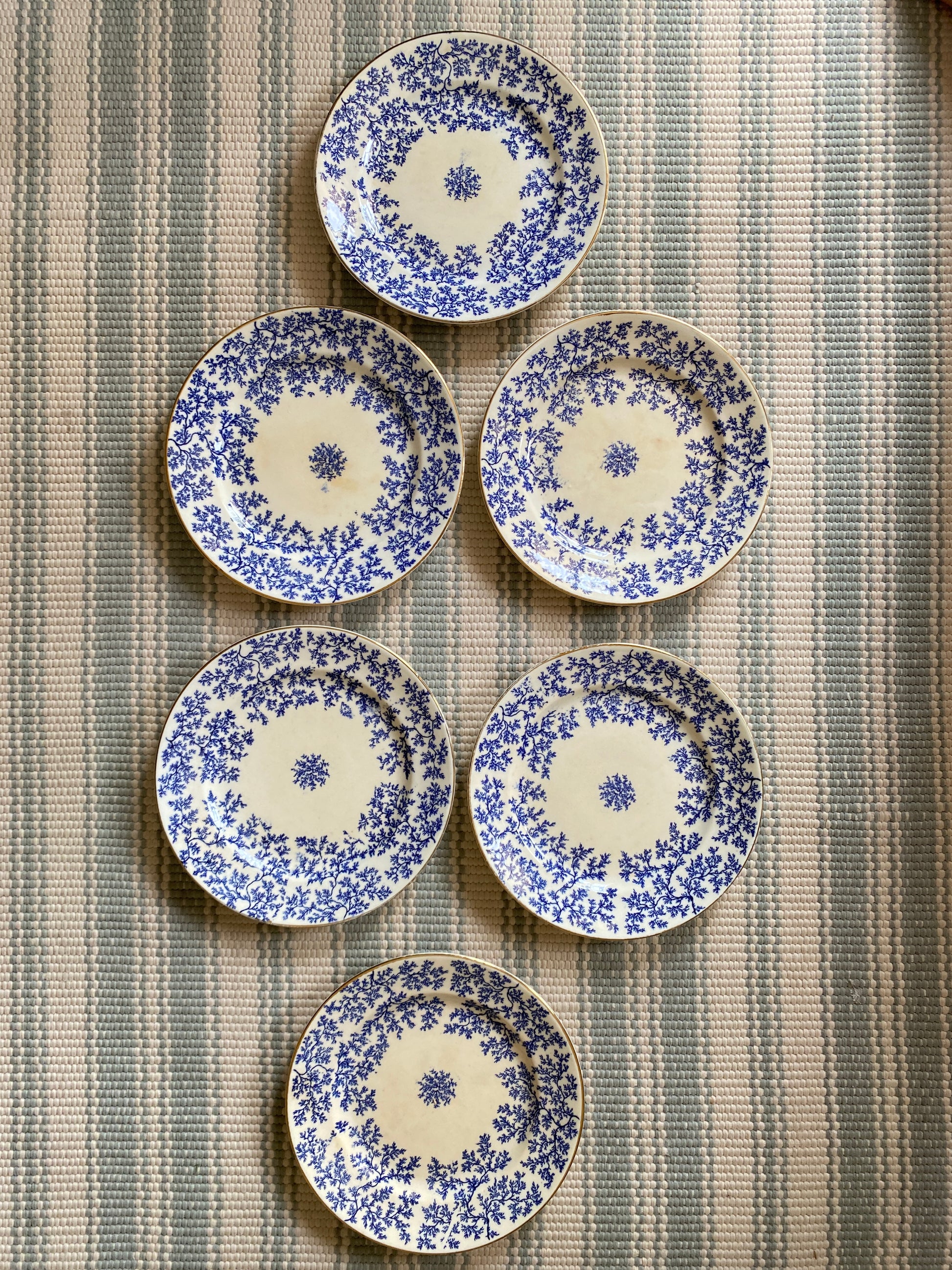 This exquisite set of 6 cake plates are perfect for any blue and white lover. Featuring the well known pattern by Minton called Seaweed. While they do not have the makers mark for Minton on the reverse, their shape, quality of porcelain, glaze and age shows that they are by the maker. The numbers attributed to the bottom could possibly be marks put on by the decorator to keep track of their work or if it was a special order item to keep track of the pieces. There were times when makers would manufacture china without their makers stamp as unlike now, people were not hung up on "brand" names like they are now.