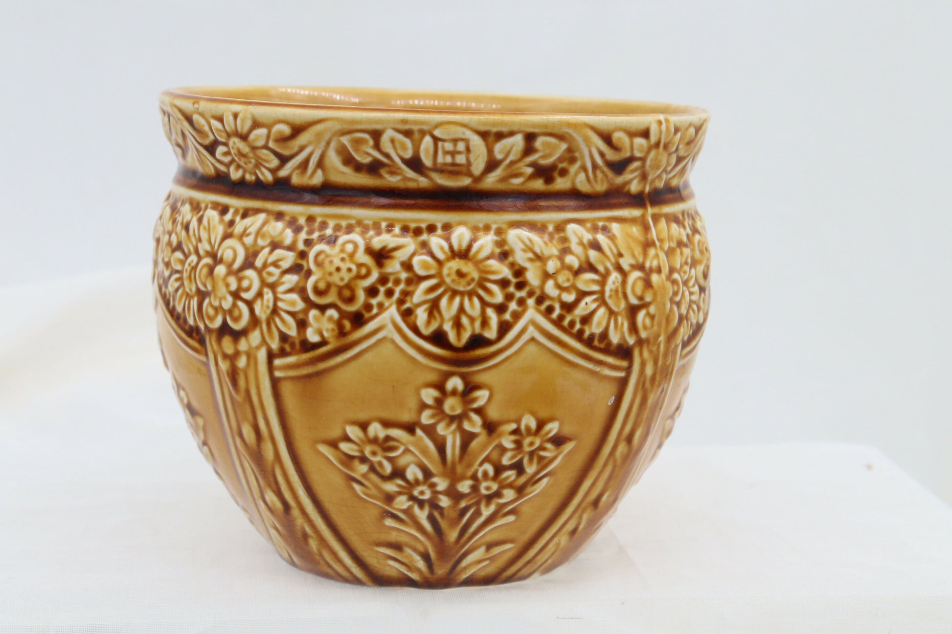 Although several decades apart in age, this small jardiniere and vase complement each other nicely in colour and texture, and could be the start of an interesting display of vases or ornaments. The jardiniere stands 112 mm high with a diameter of 140 mm, and dates from around 1910. The vase is 125 mm in height with a diameter of 88 mm and would date from the 1970's. Both are in very good condition, but the jardiniere has a small hairline crack to the rim.