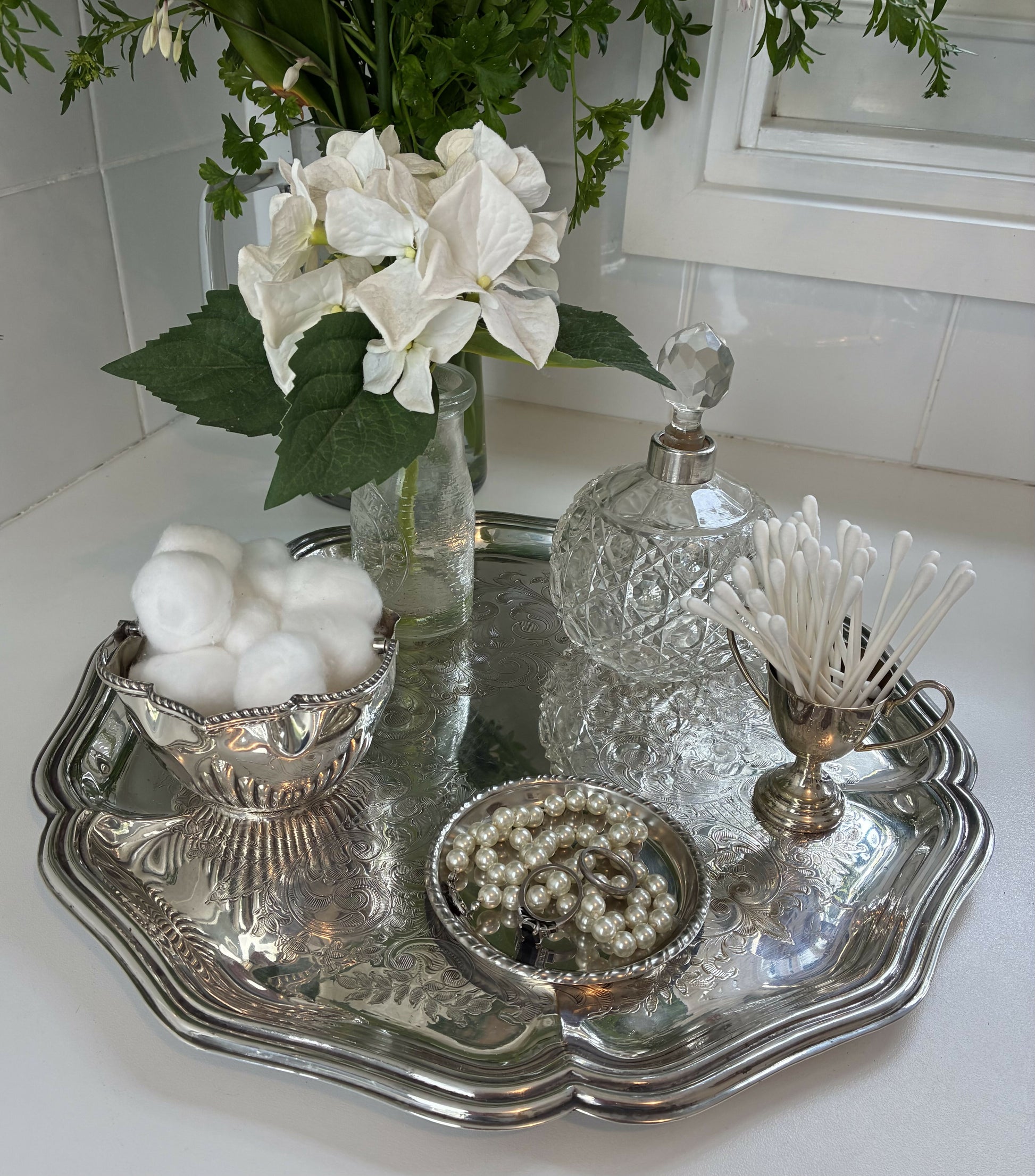 This beautiful tray is silver plate on copper, and is English made. Reasonably heavy (830grams). Very versatile piece; great for a bar cart or to display perfumes. It does have some spotting and is priced accordingly.