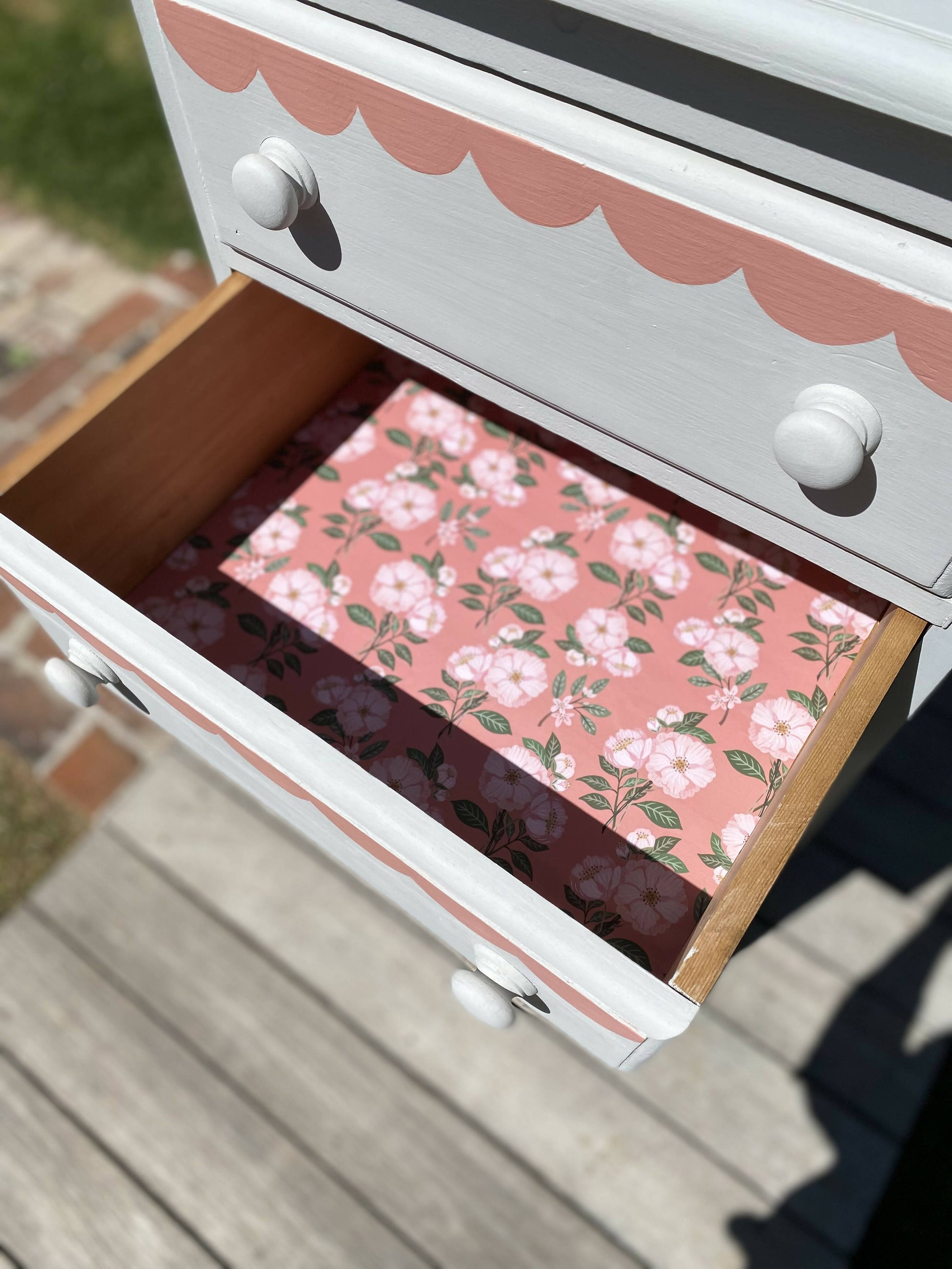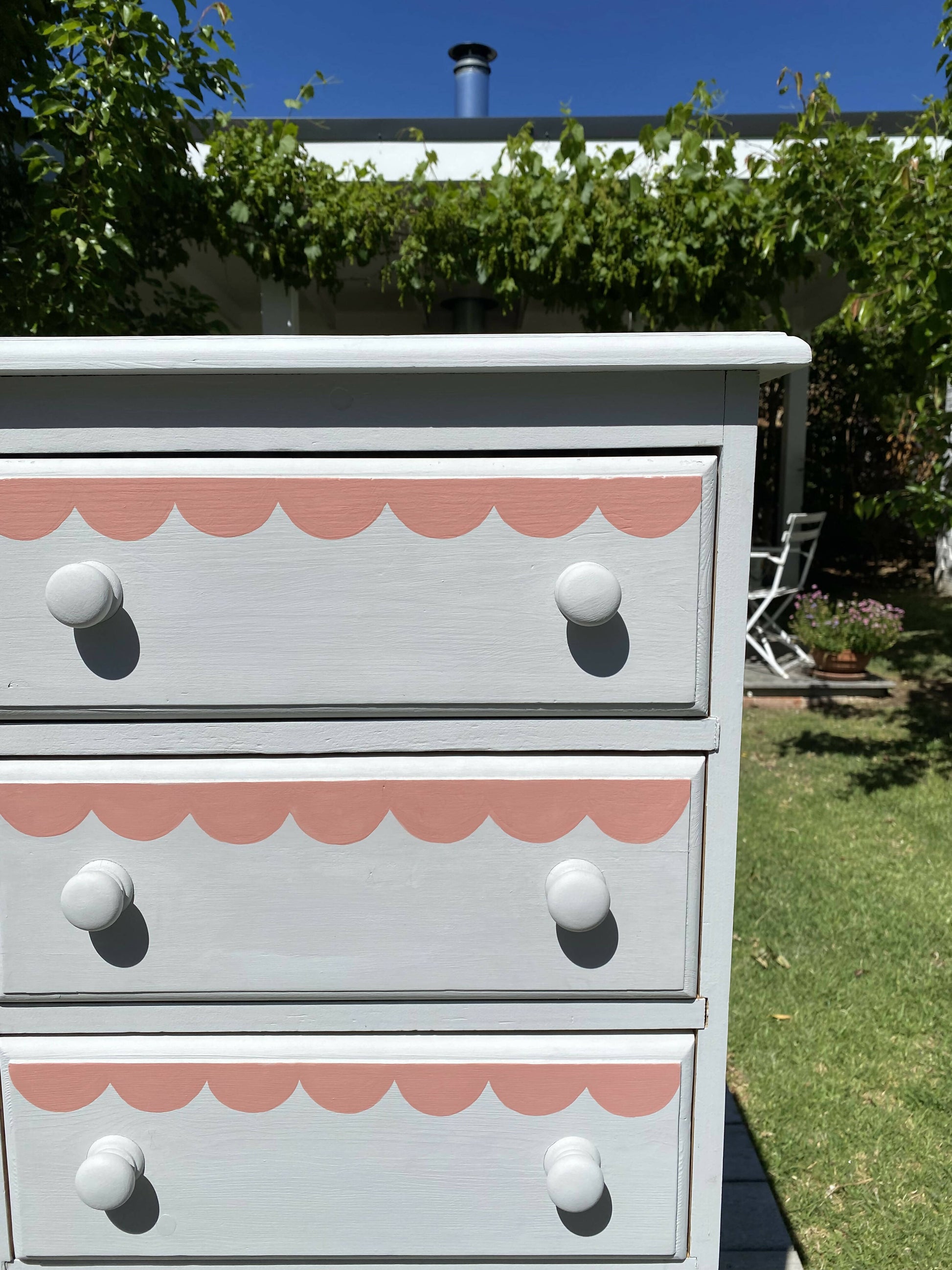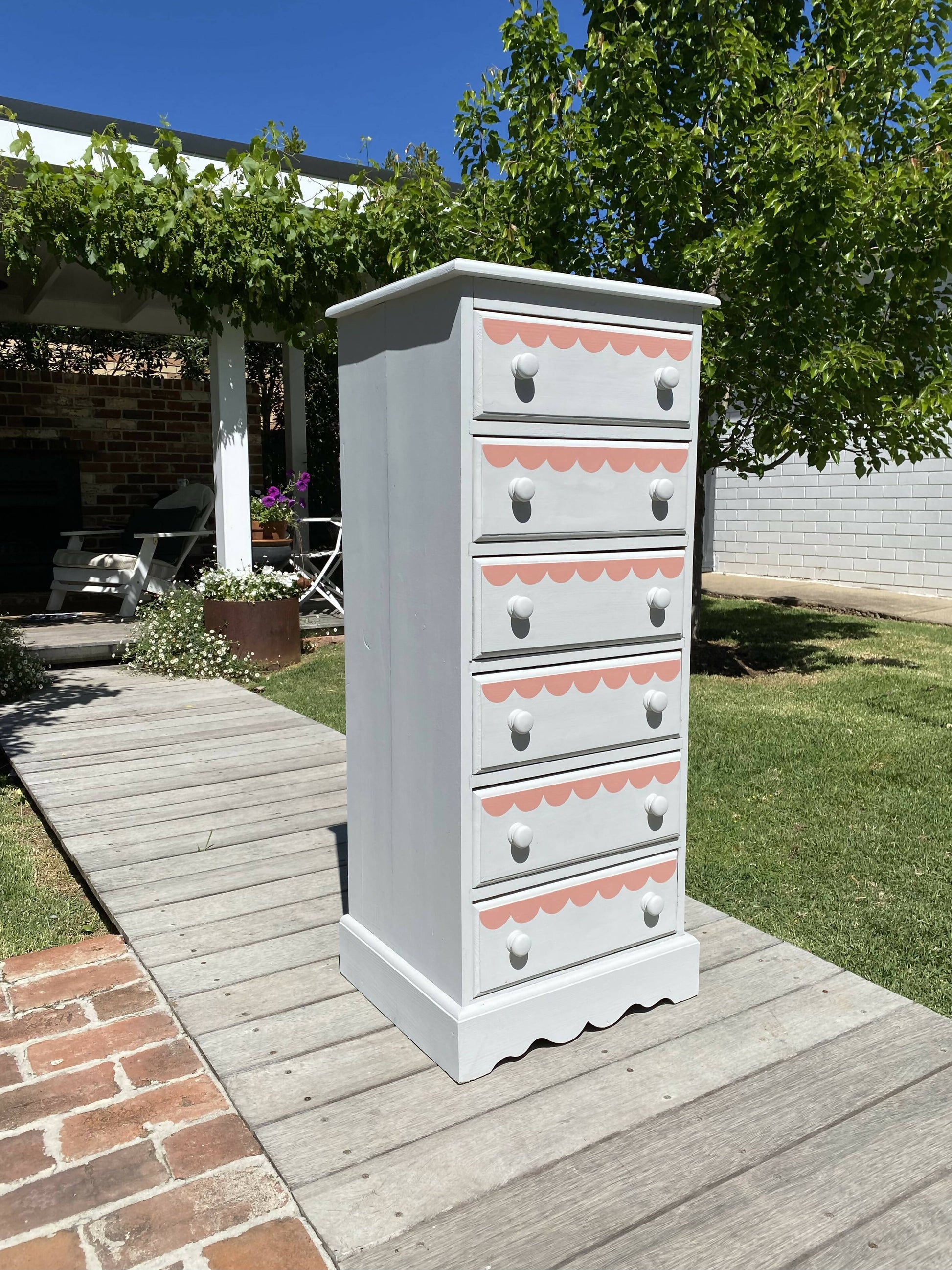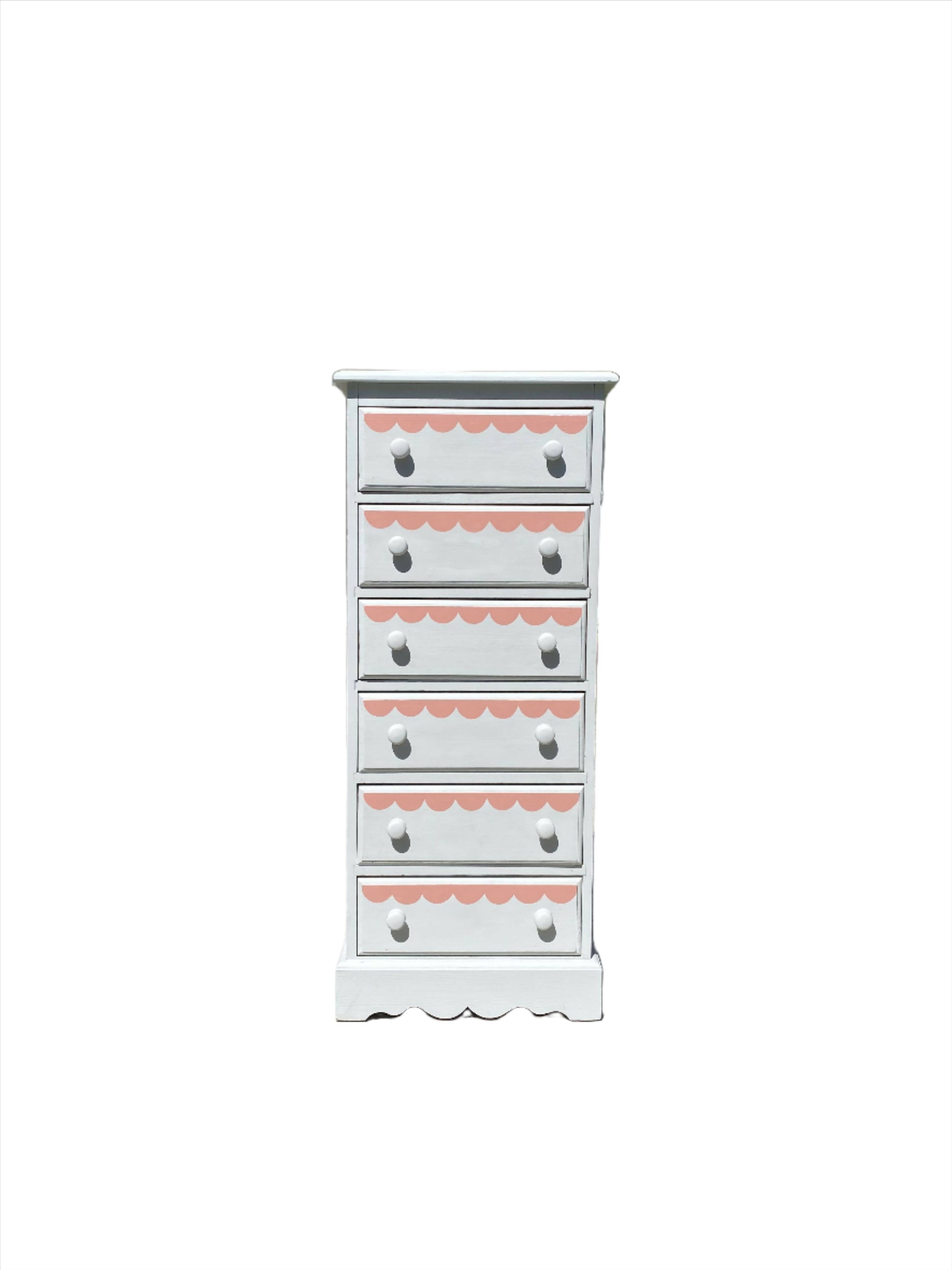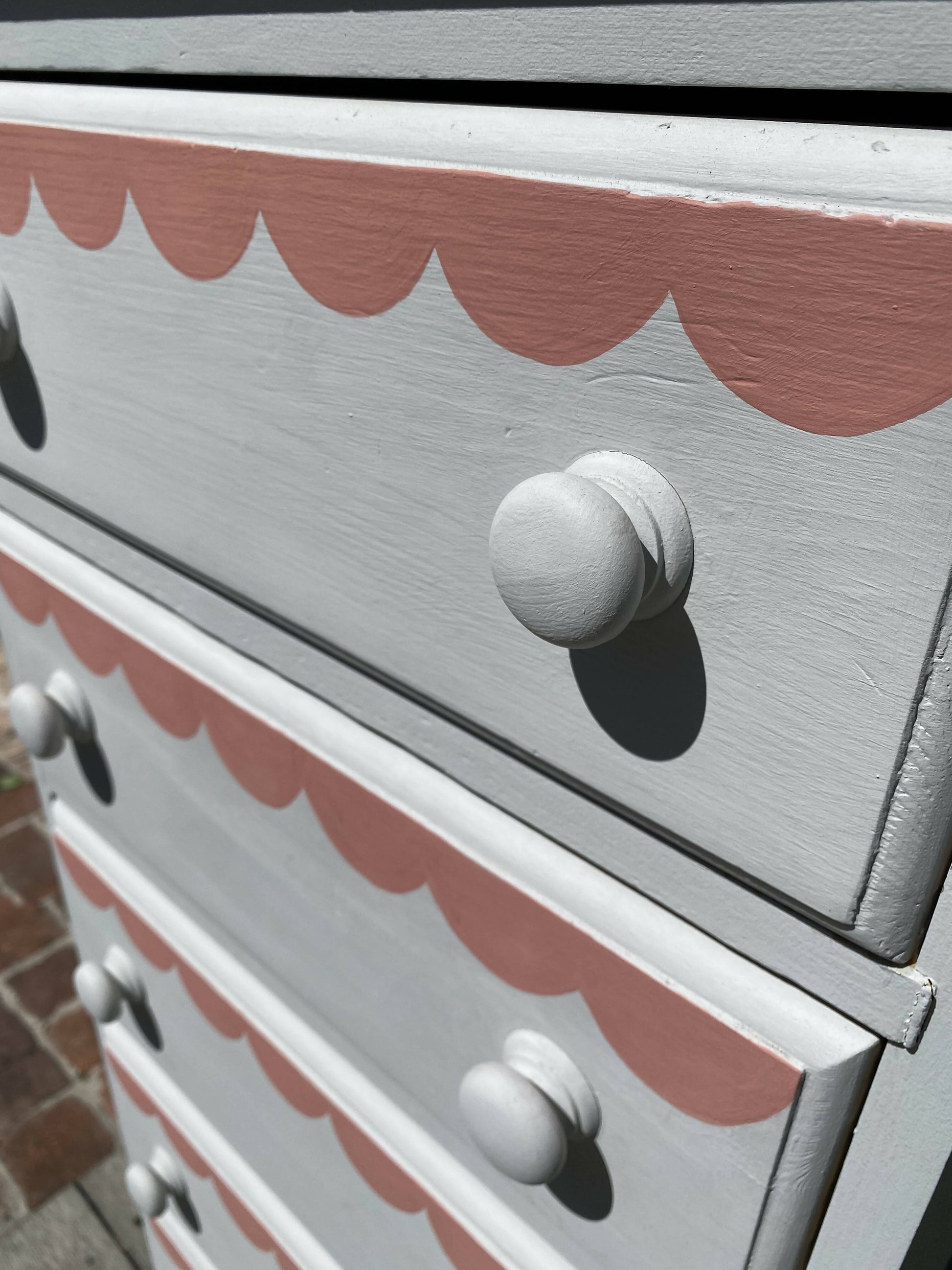 Tall set of drawers perfect for a child’s bedroom. Painted with custom Jolie paint and finished with hand painted scallop detail.
