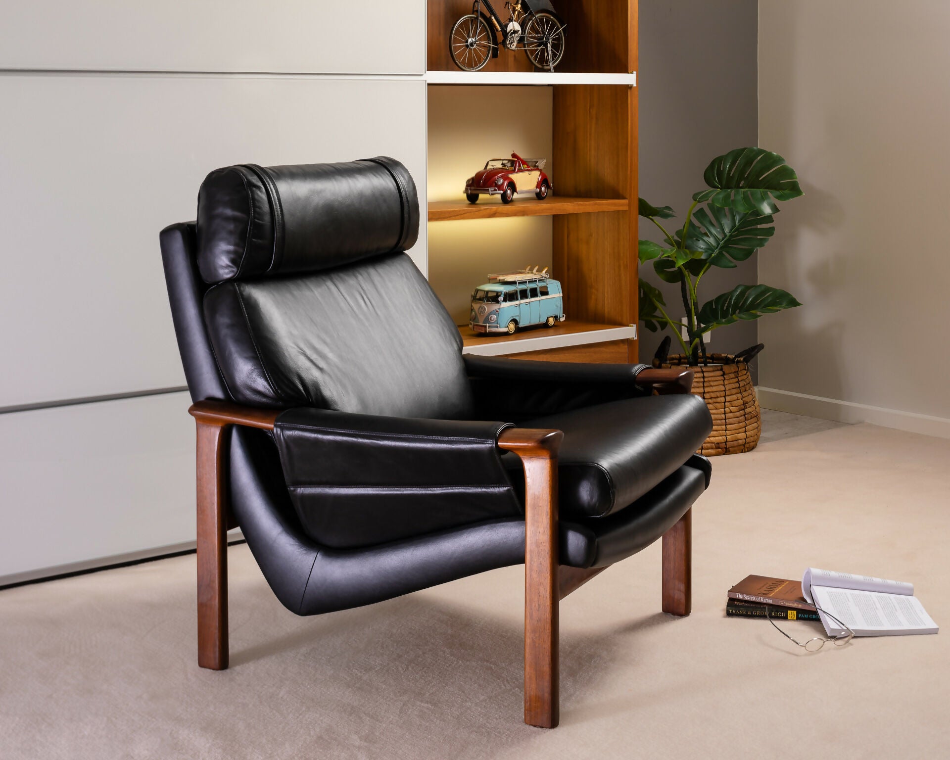 Upholstered in black leather, this chair combines aesthetics with relaxation.