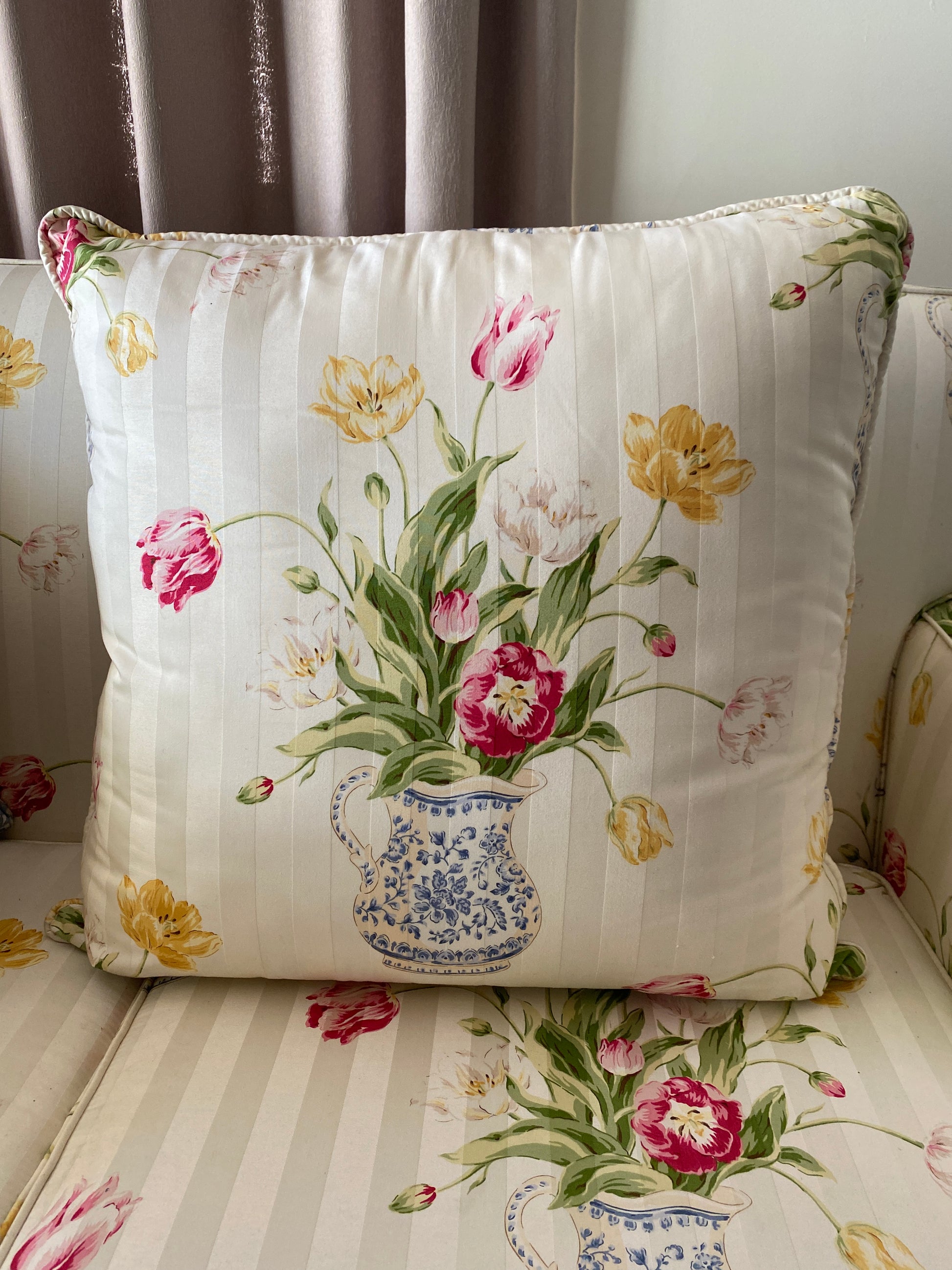 This gorgeous large cushion is perfect for your sofa, a large armchair or bed. Featuring a stunning tulip in jug pattern and a pretty pink and green tartan trim. Has the same pattern on both sides and is self piped.
