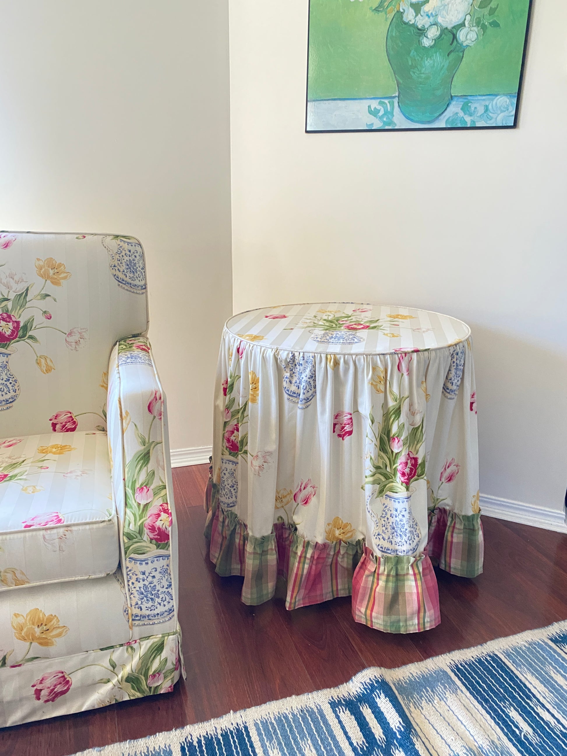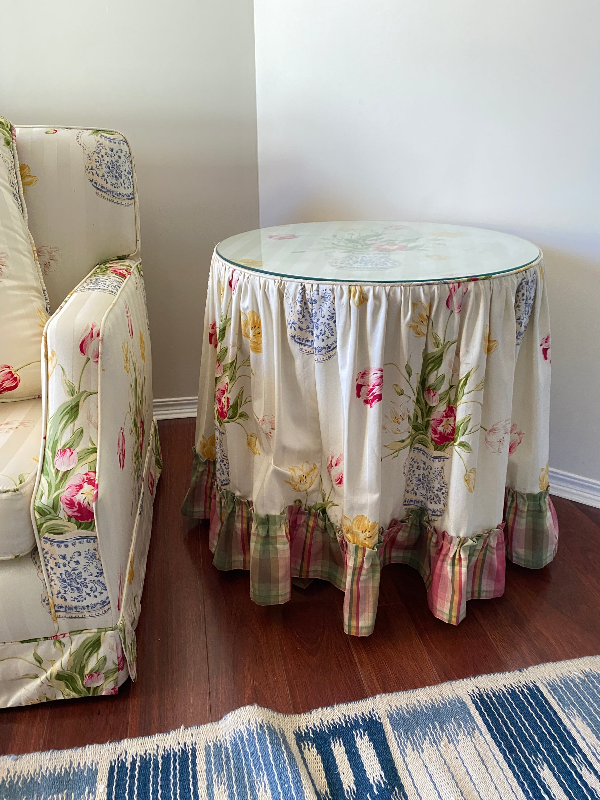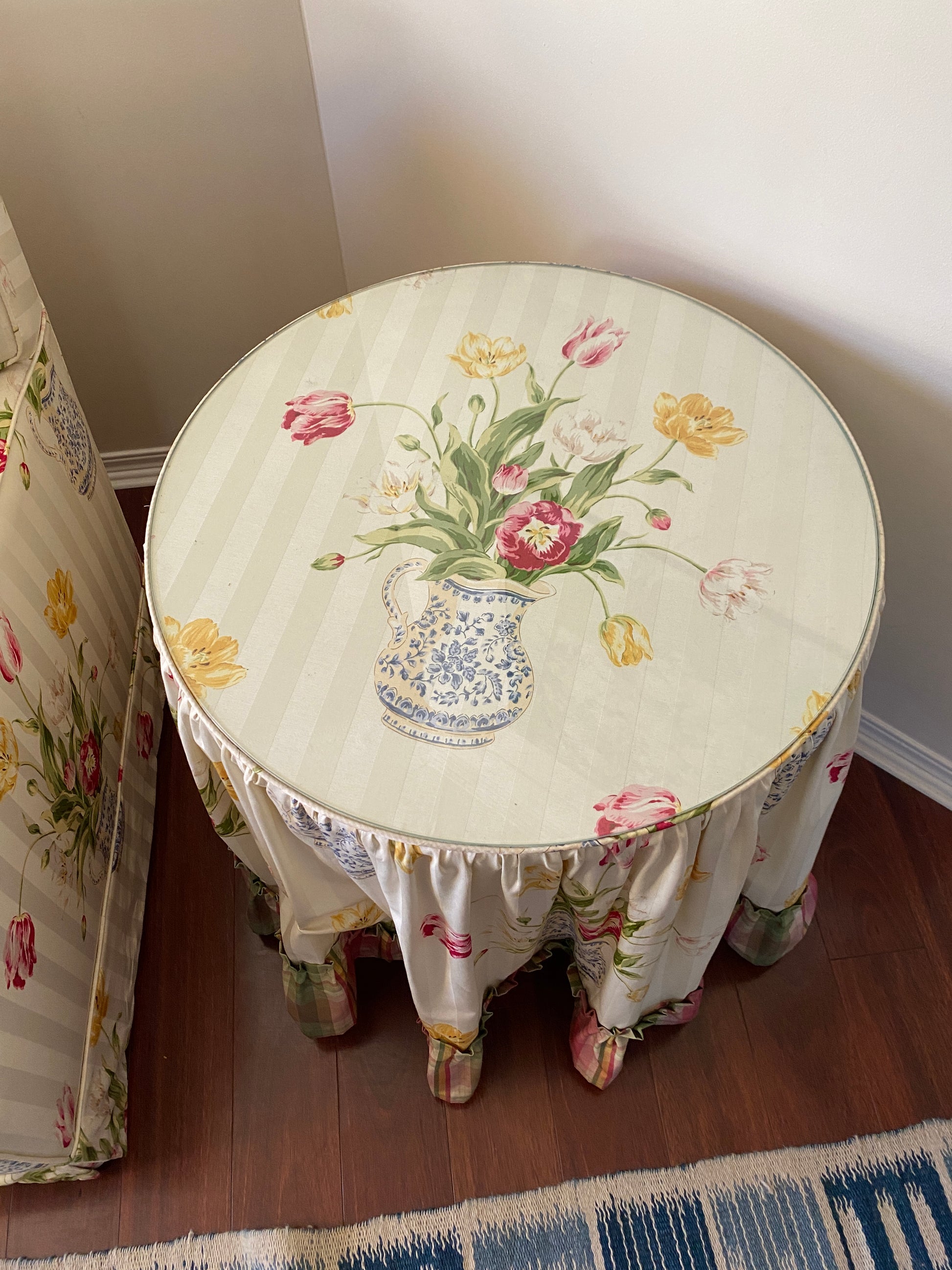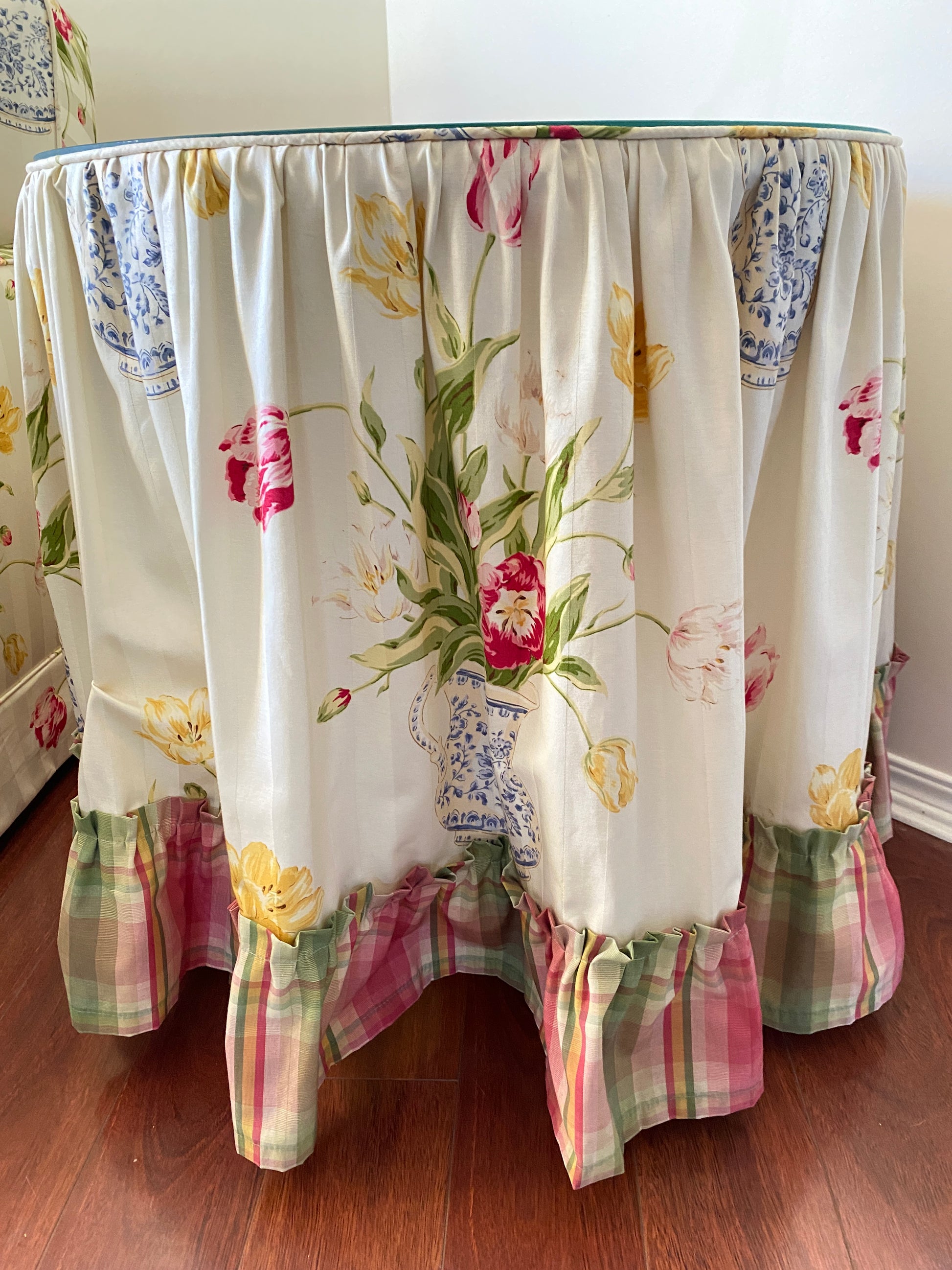 This gorgeous custom made tablecloth with table and glass for the top is a truly delightful piece for any room. Featuring a stunning tulip in jug pattern and a pretty pink and green tartan trim. The table is very lightweight making it easy to move around your room. Beautifully made in a discontinued designer fabric.